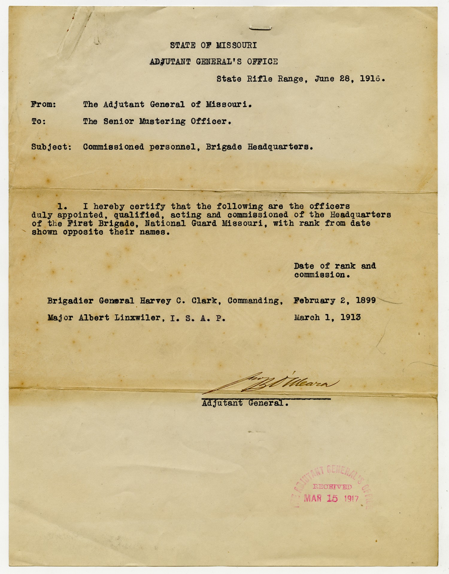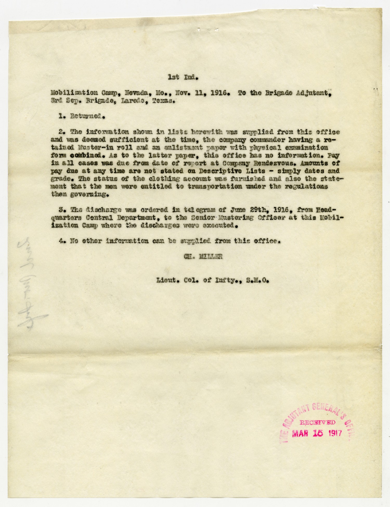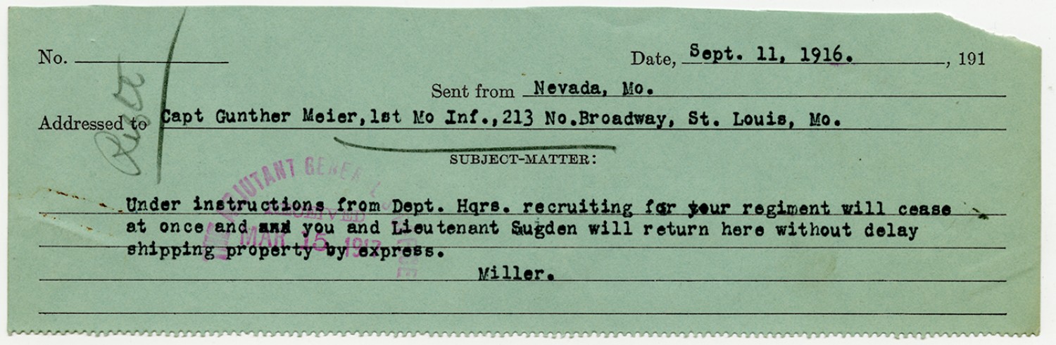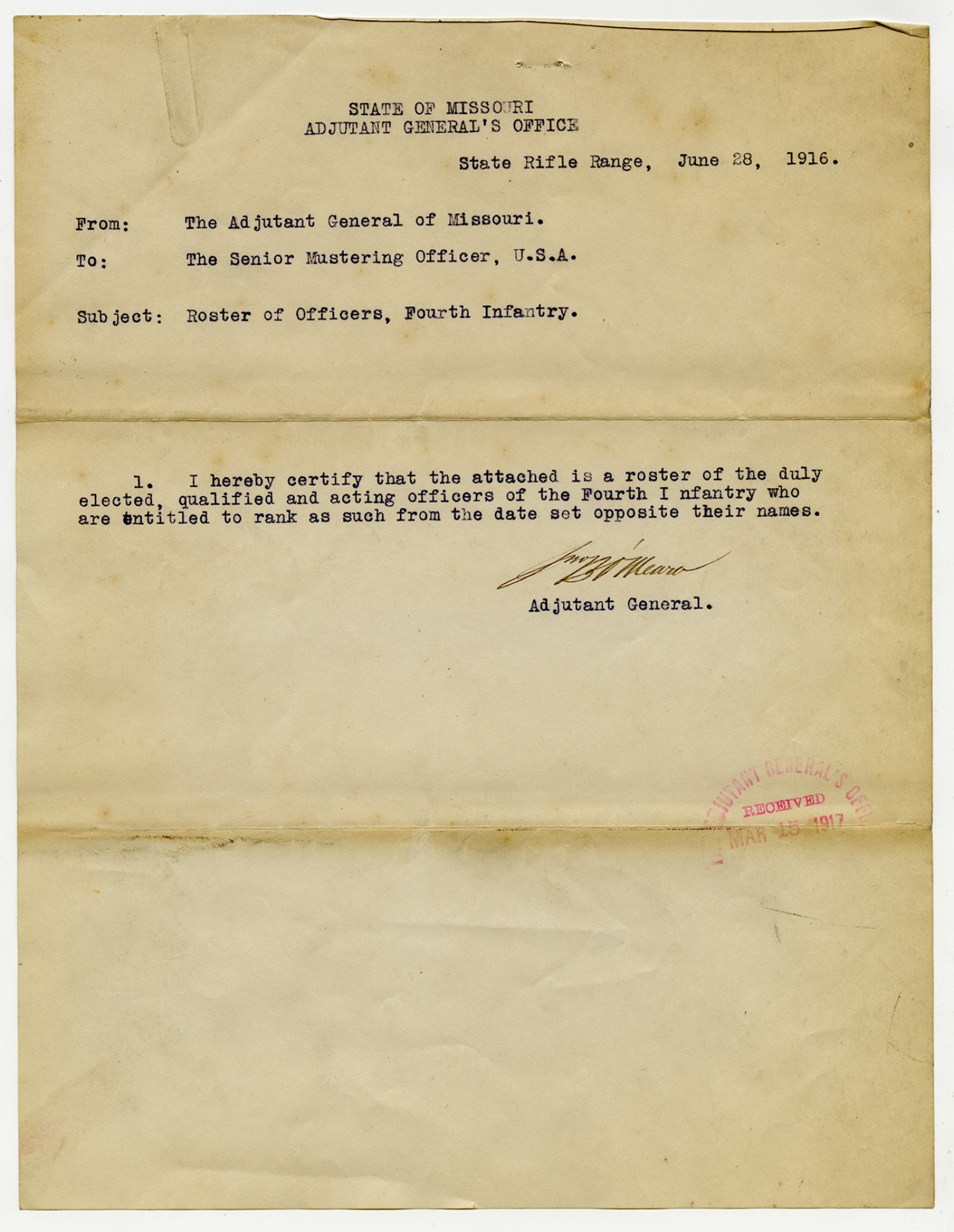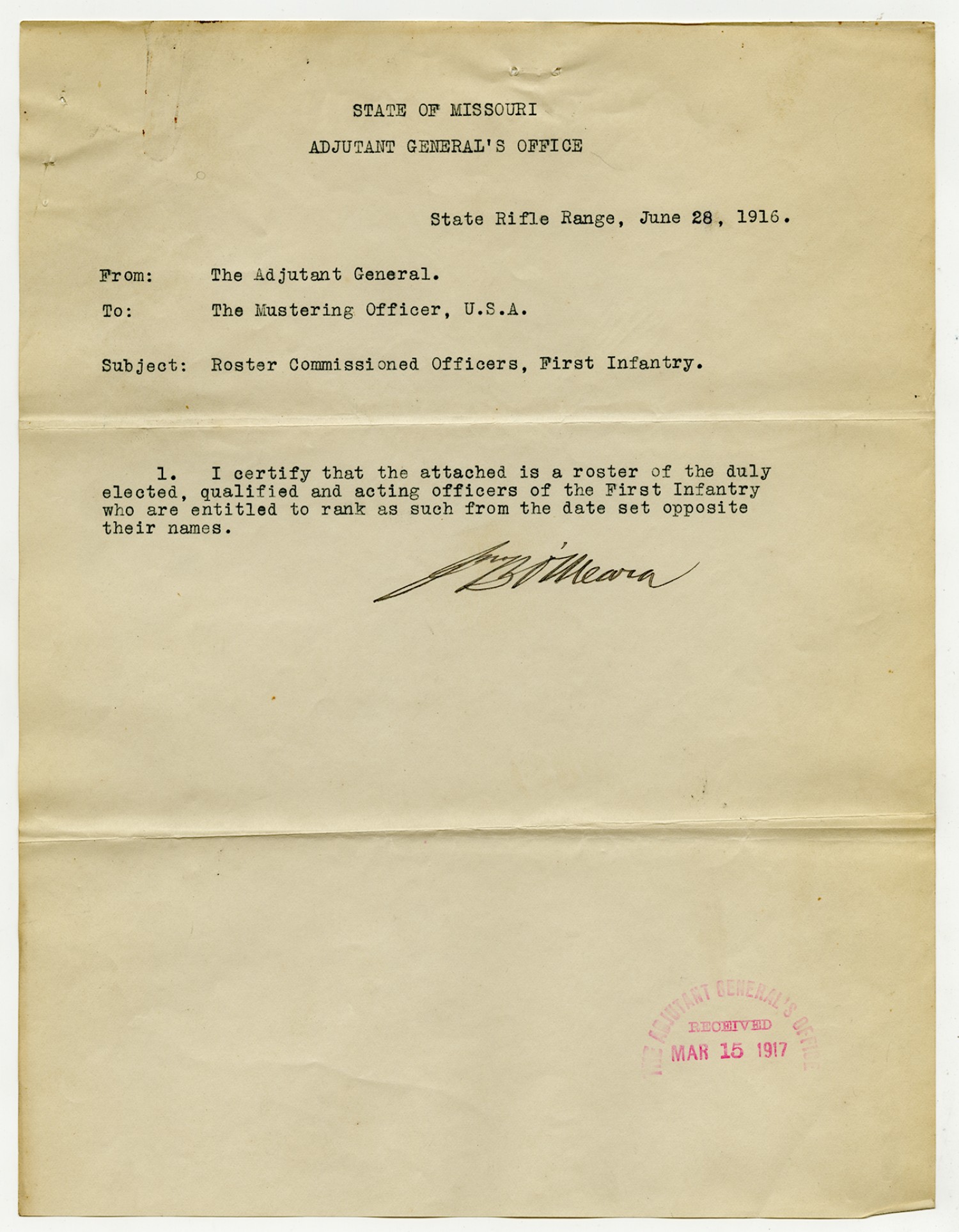 Adjutant General O'Meara letter to the Chief Mustering Officer - June 28, 1916