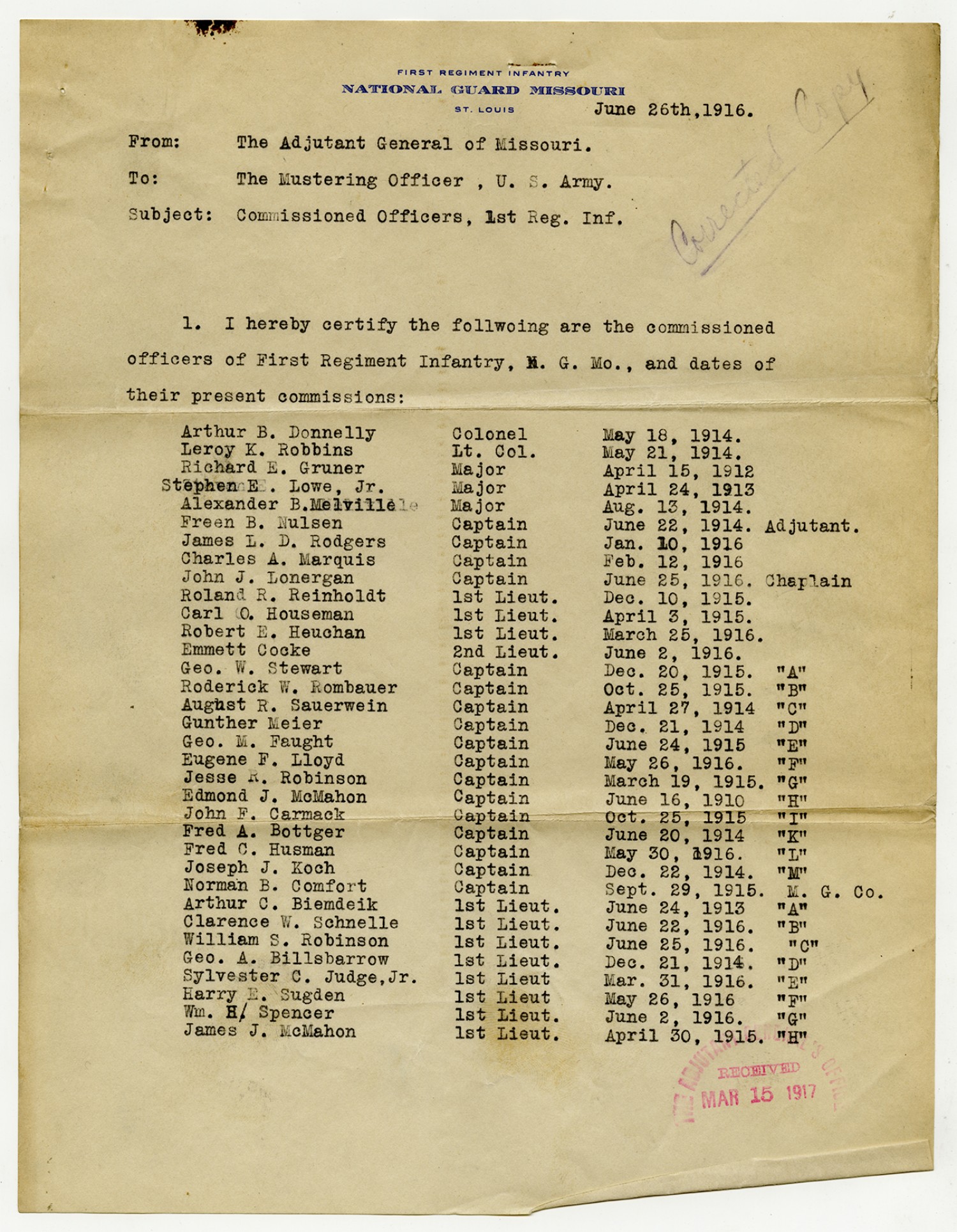 Officers of the 2nd Missouri Infantry - March 15, 1917