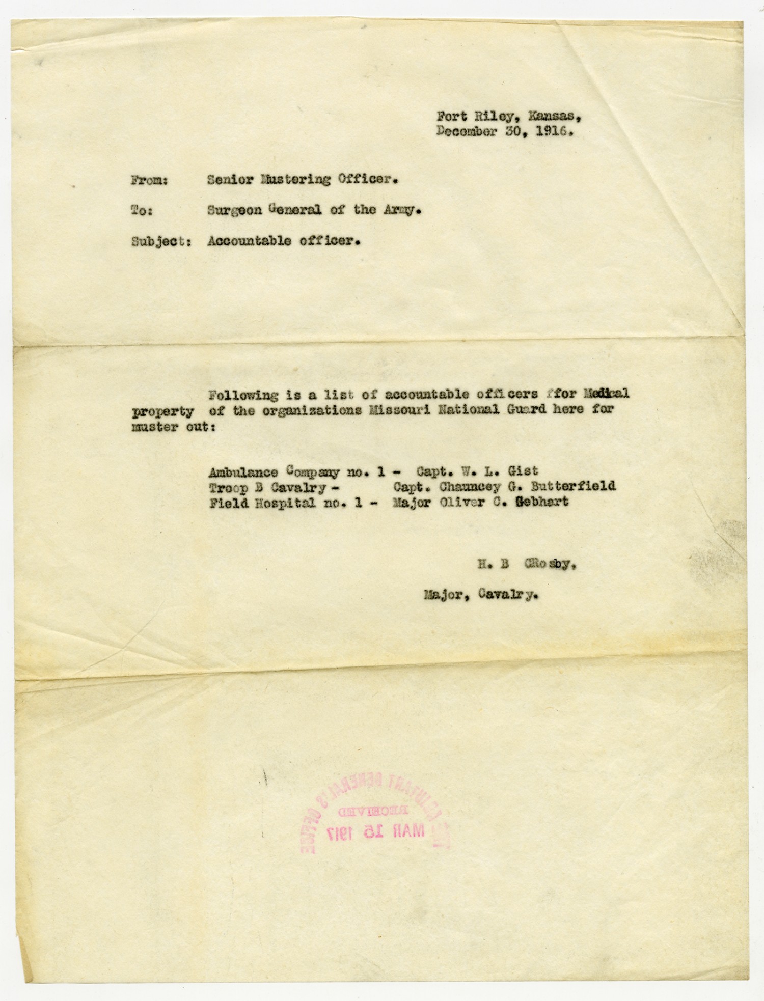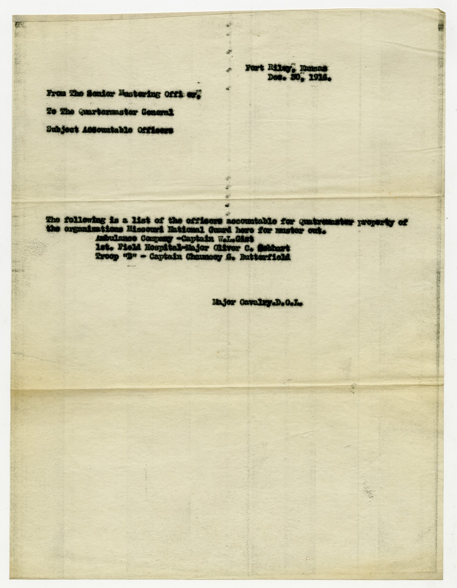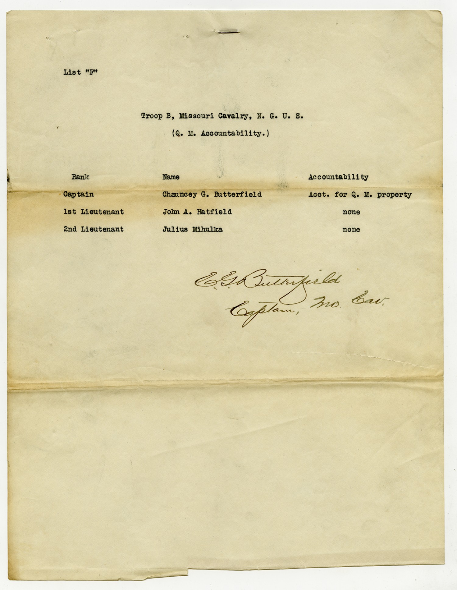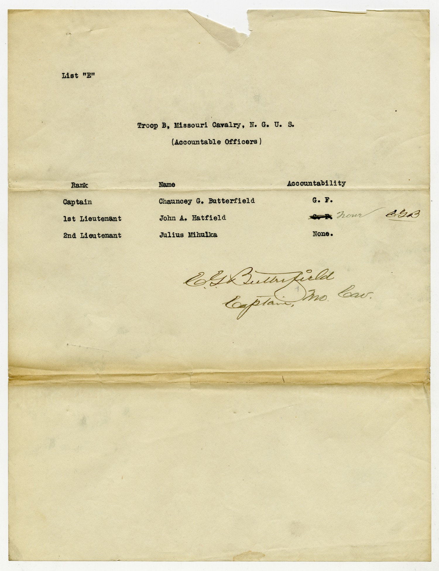 Troop B, Missouri Cavalry Accountable Officers from Captain Butterfield - n.d.