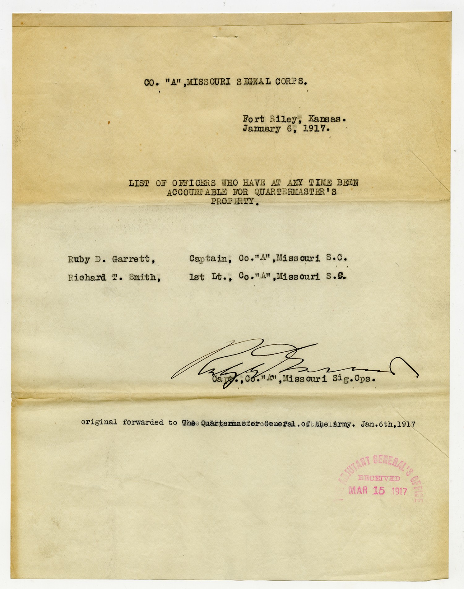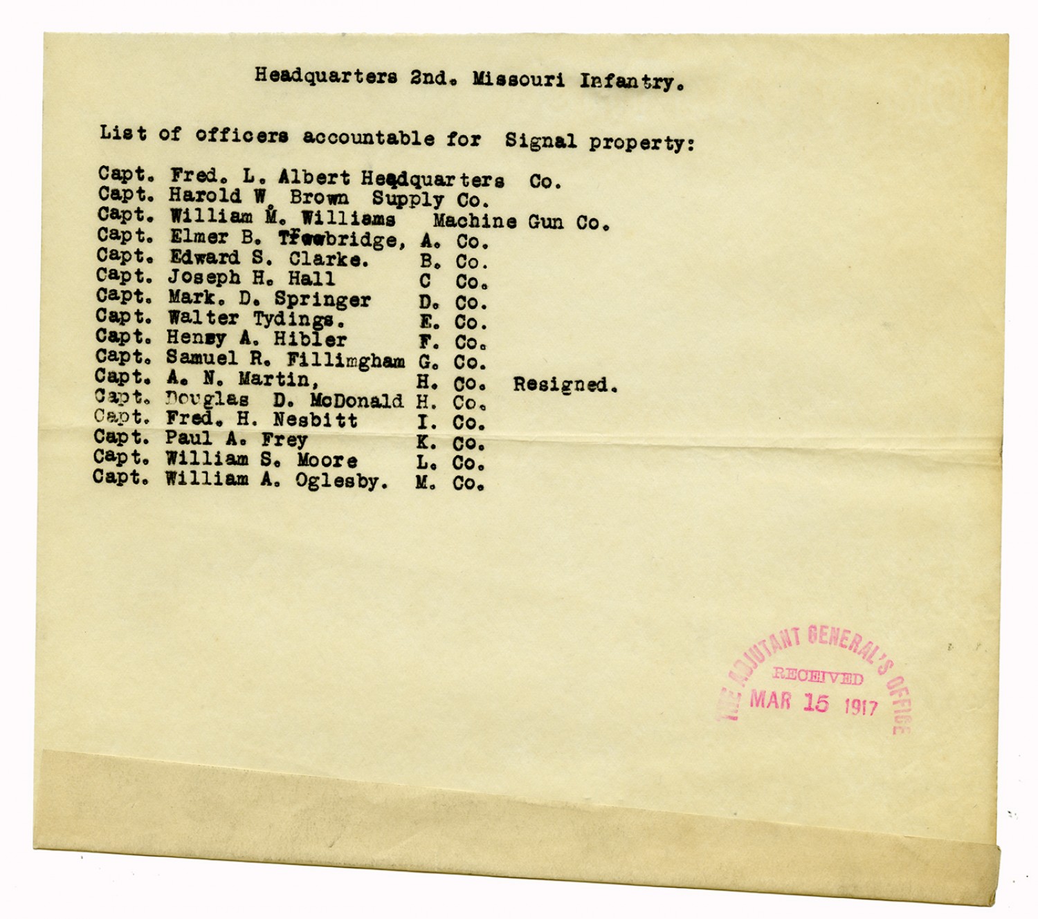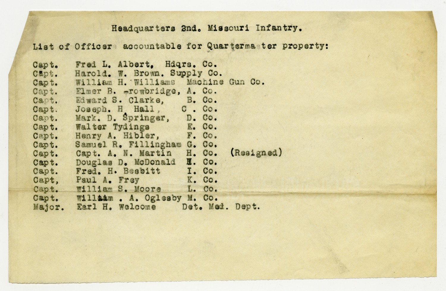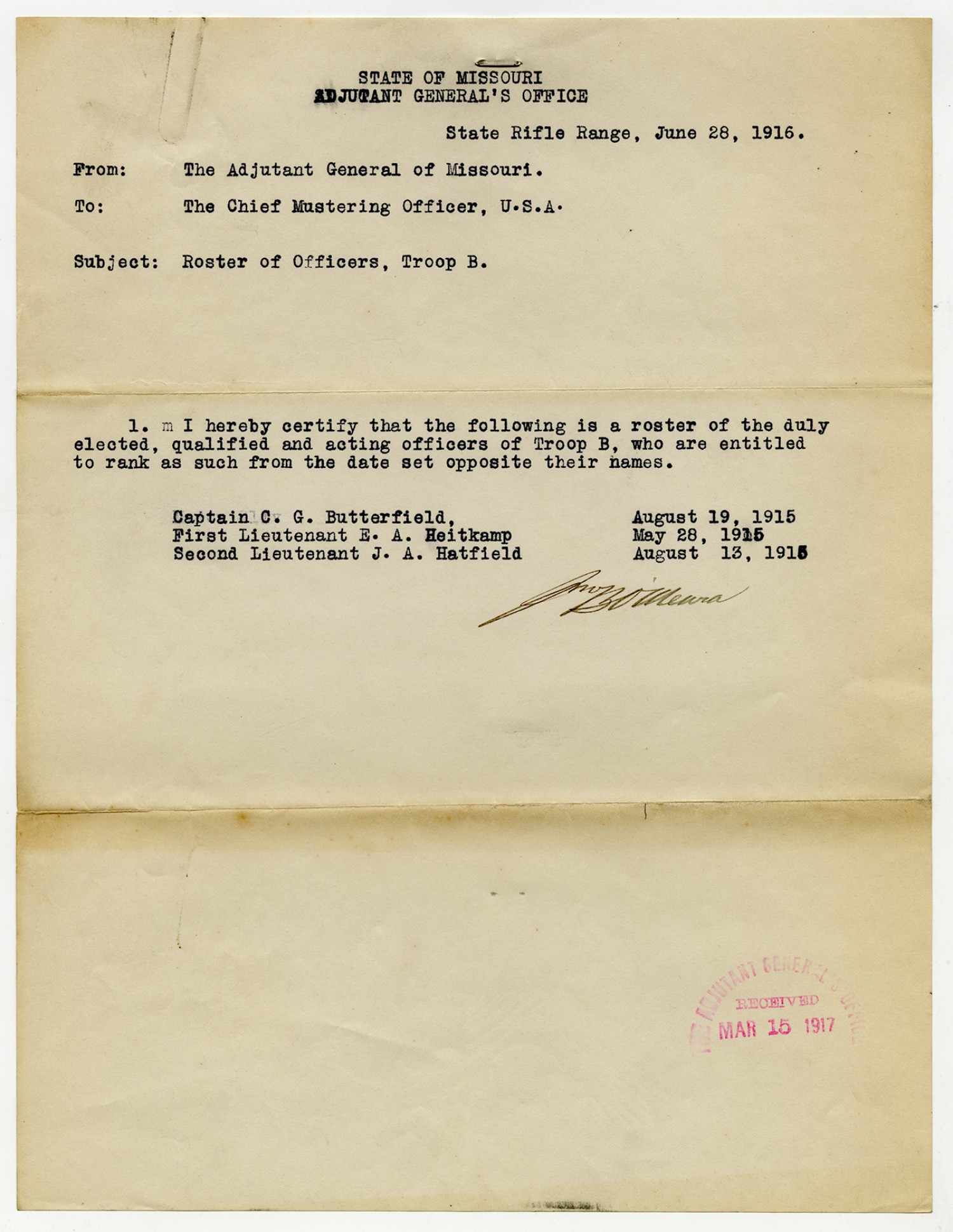 Troop B, Missouri Cavalry Accountable Officers from Captain Butterfield - n.d.