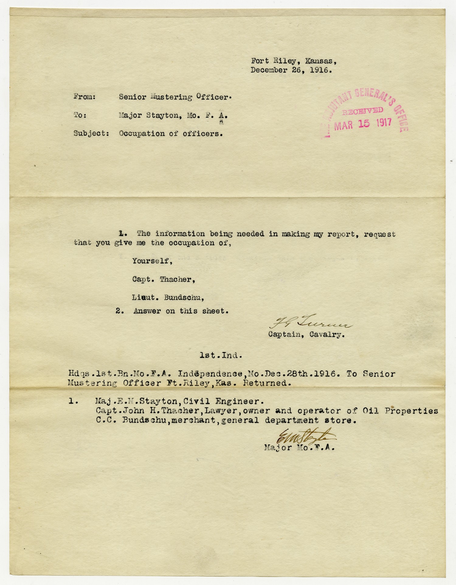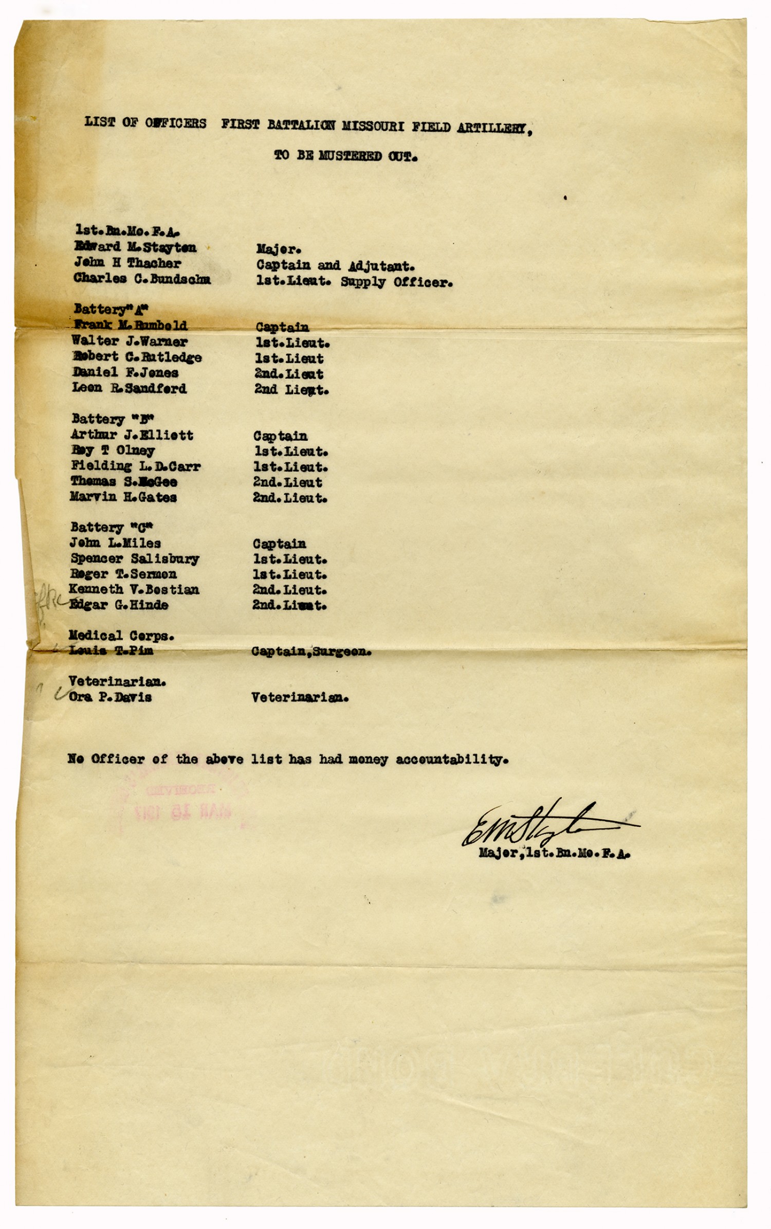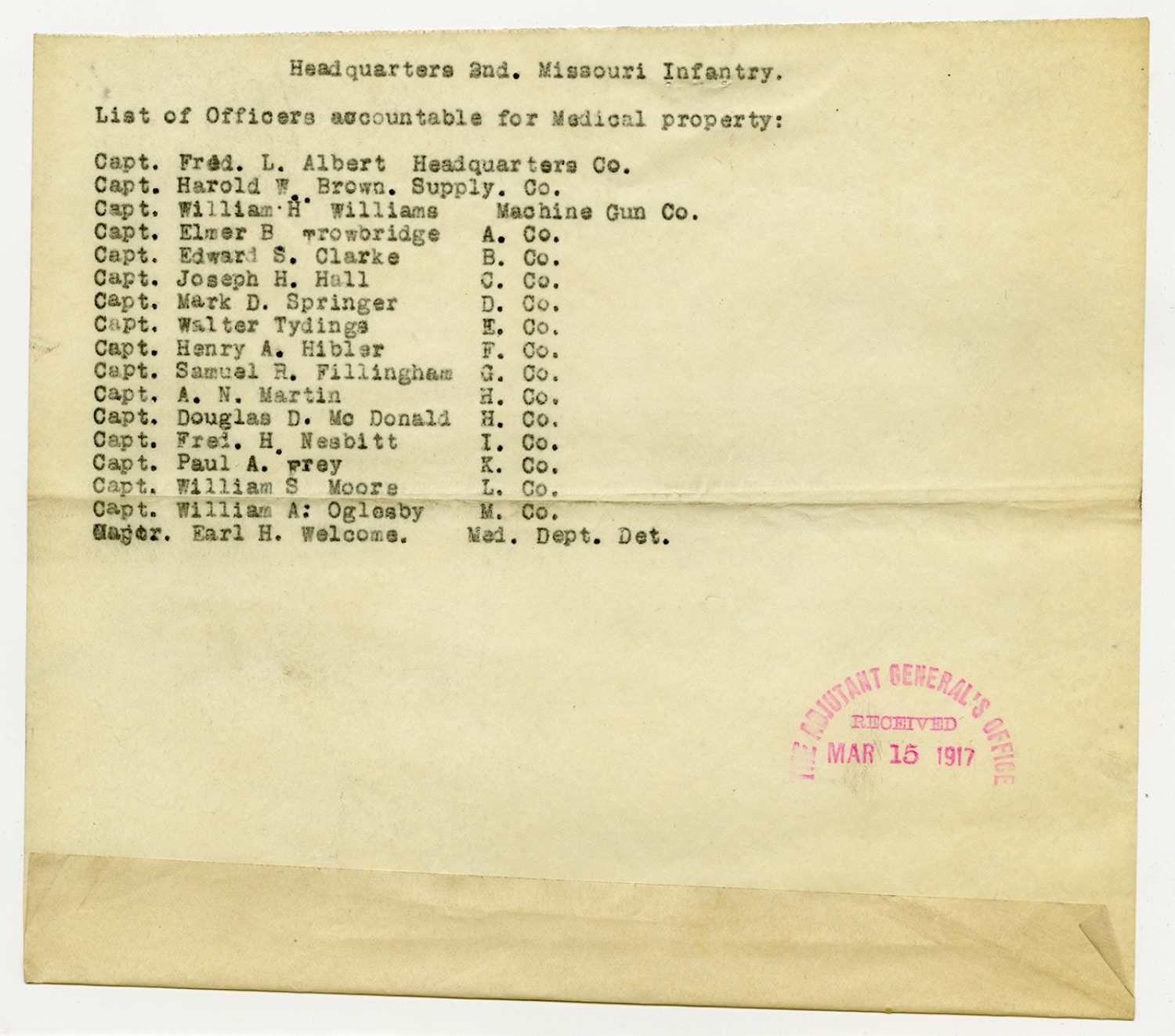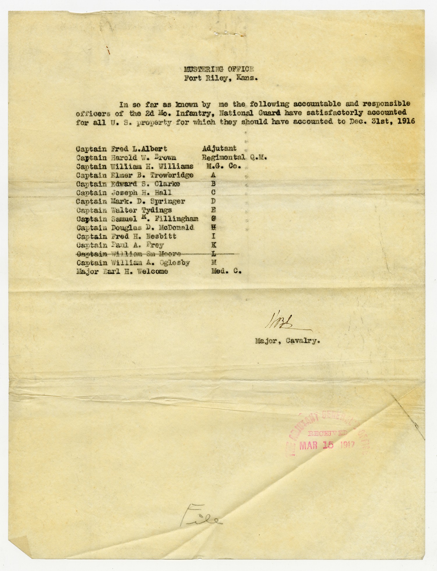 Troop B, Missouri Cavalry Accountable Officers from Captain Butterfield - n.d.