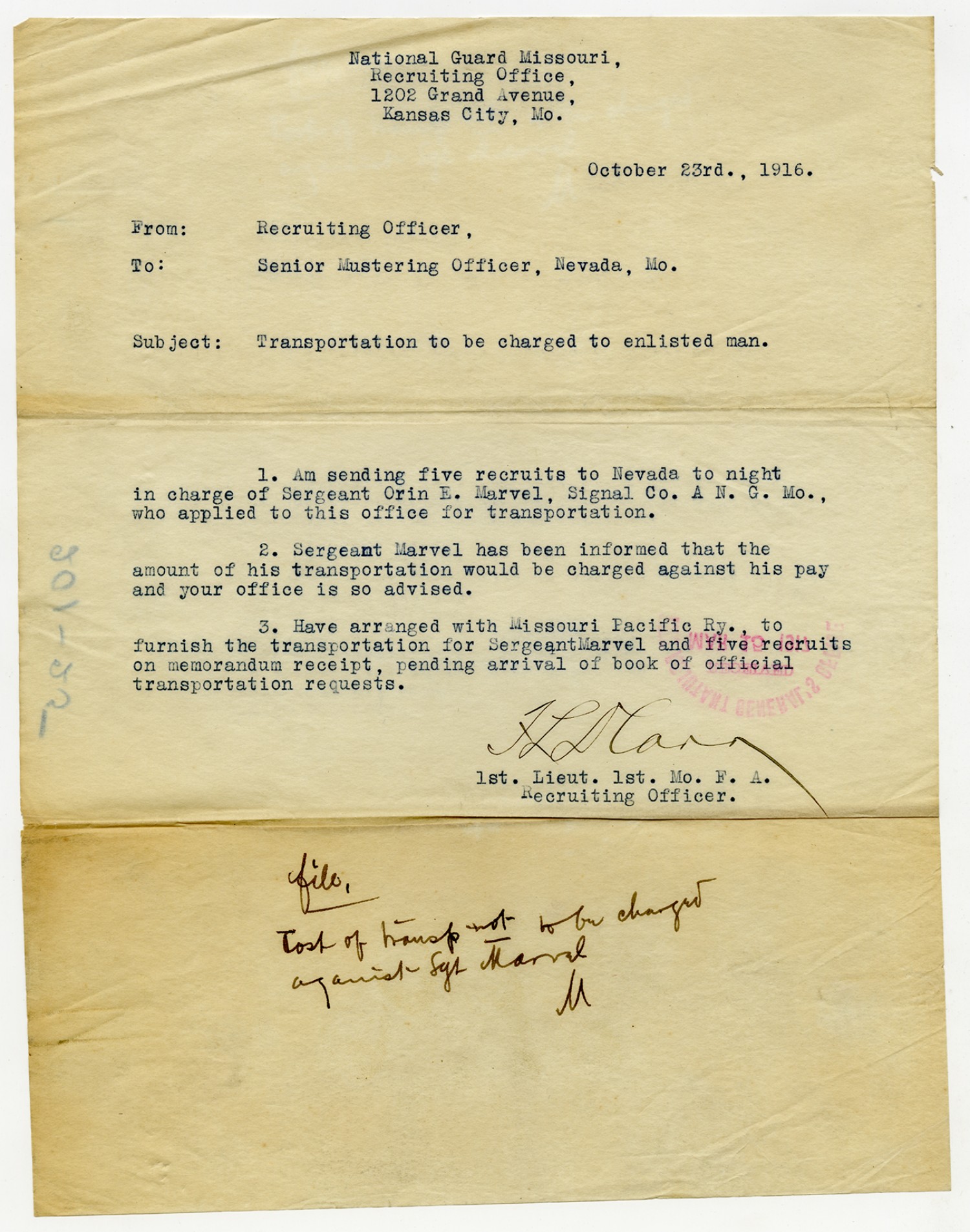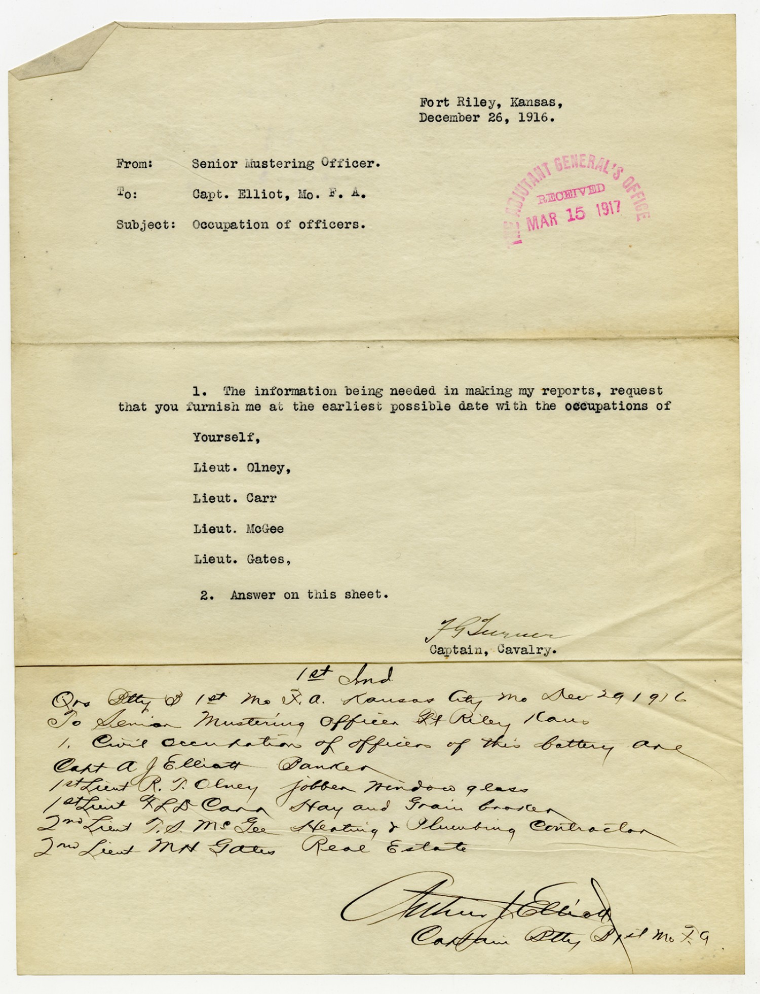 Arthur Elliot letter to the Commanding Officer, 1st Battalion Missouri Field Artillery - November 27, 1916