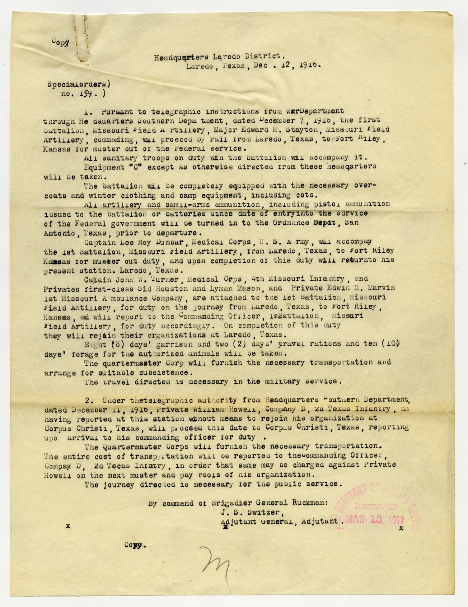 J.S. Switzer Special Orders - December 12, 1916