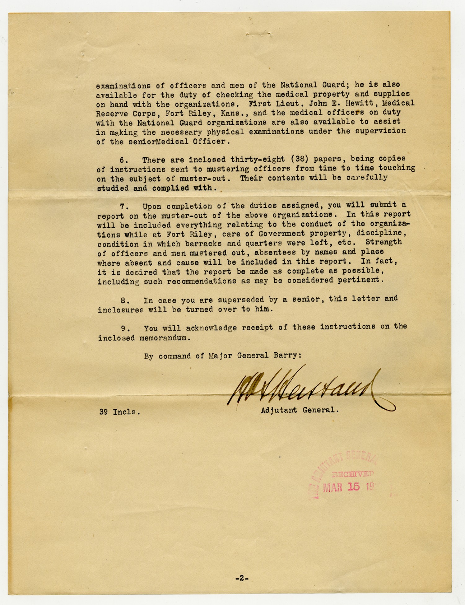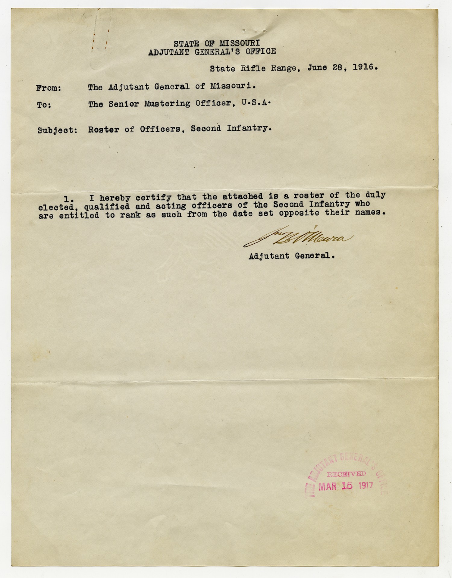 Adjutant General O'Meara letter to the Senior Mustering Officer about the Second Infantry - June 28, 1916