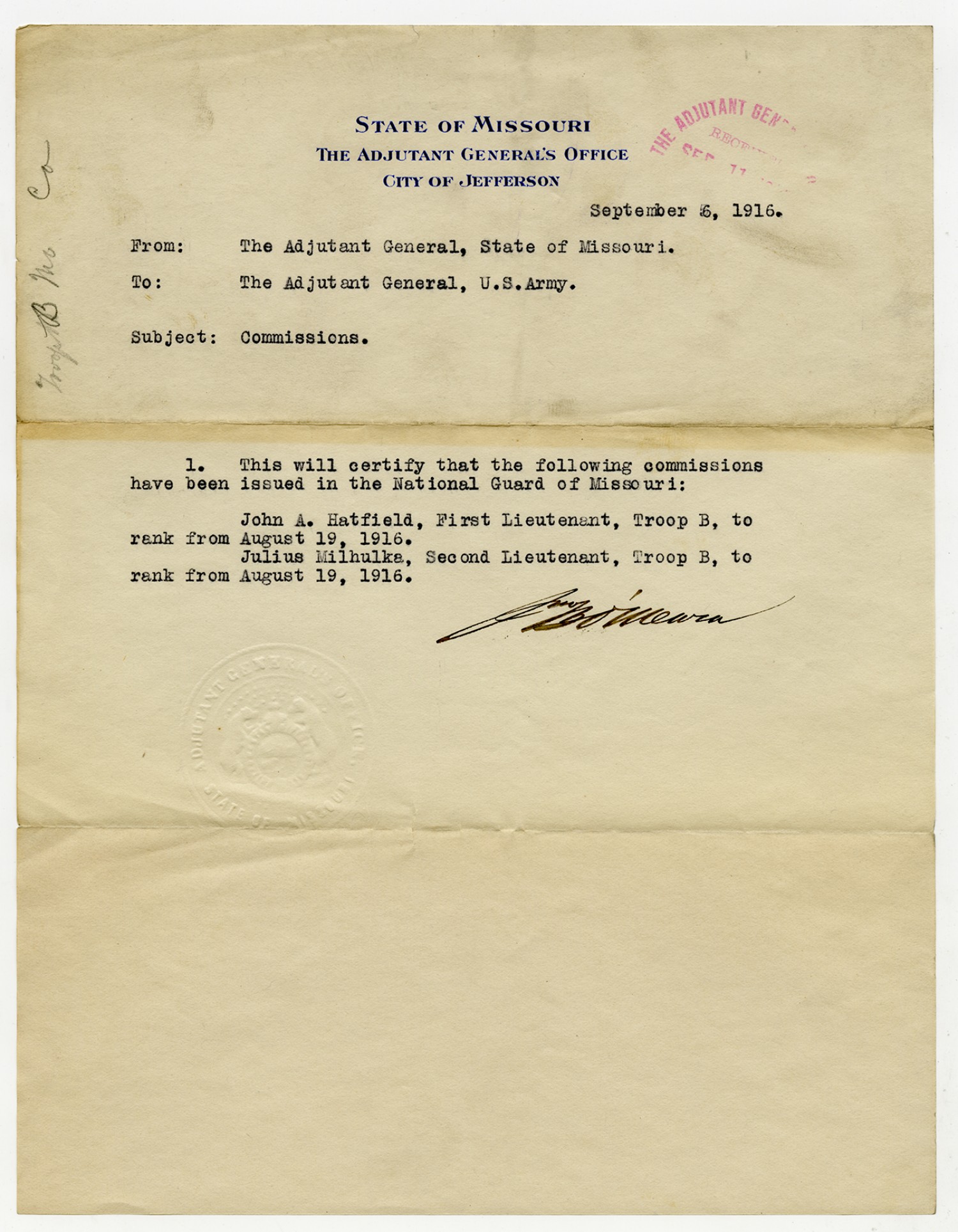 Adjutant General O'Meara letter to the Adjutant General of the Army - September 6, 1916