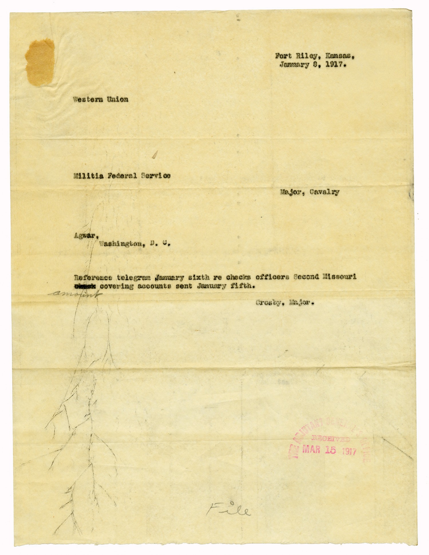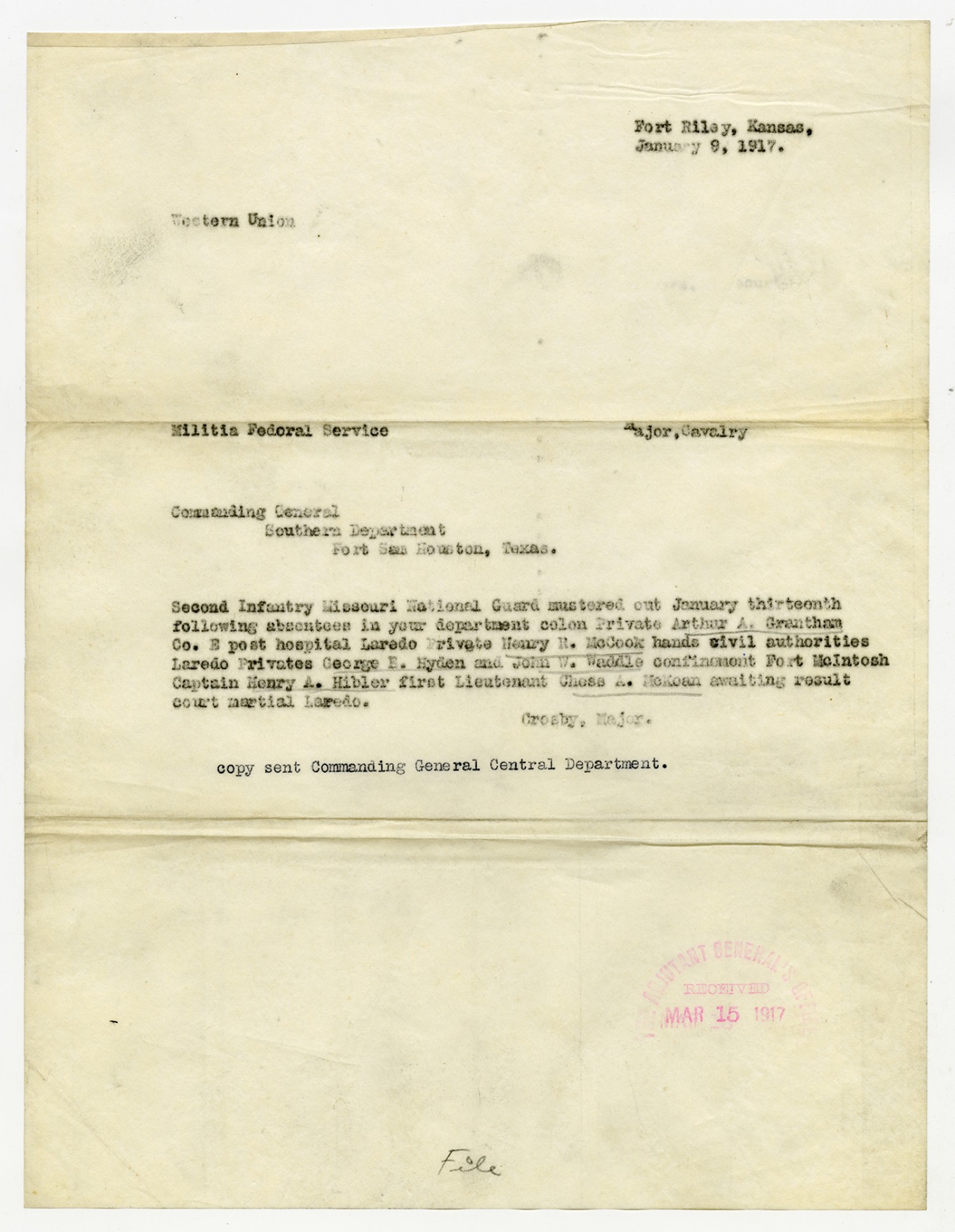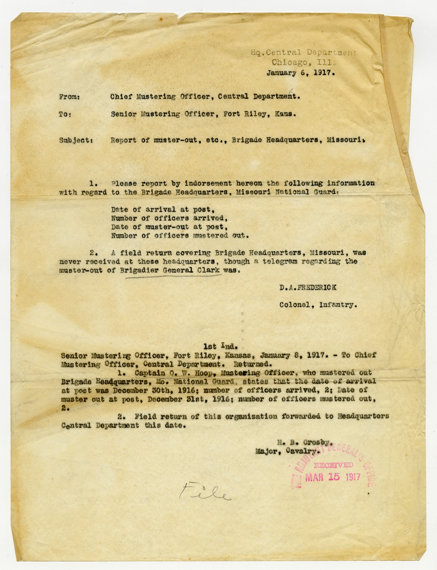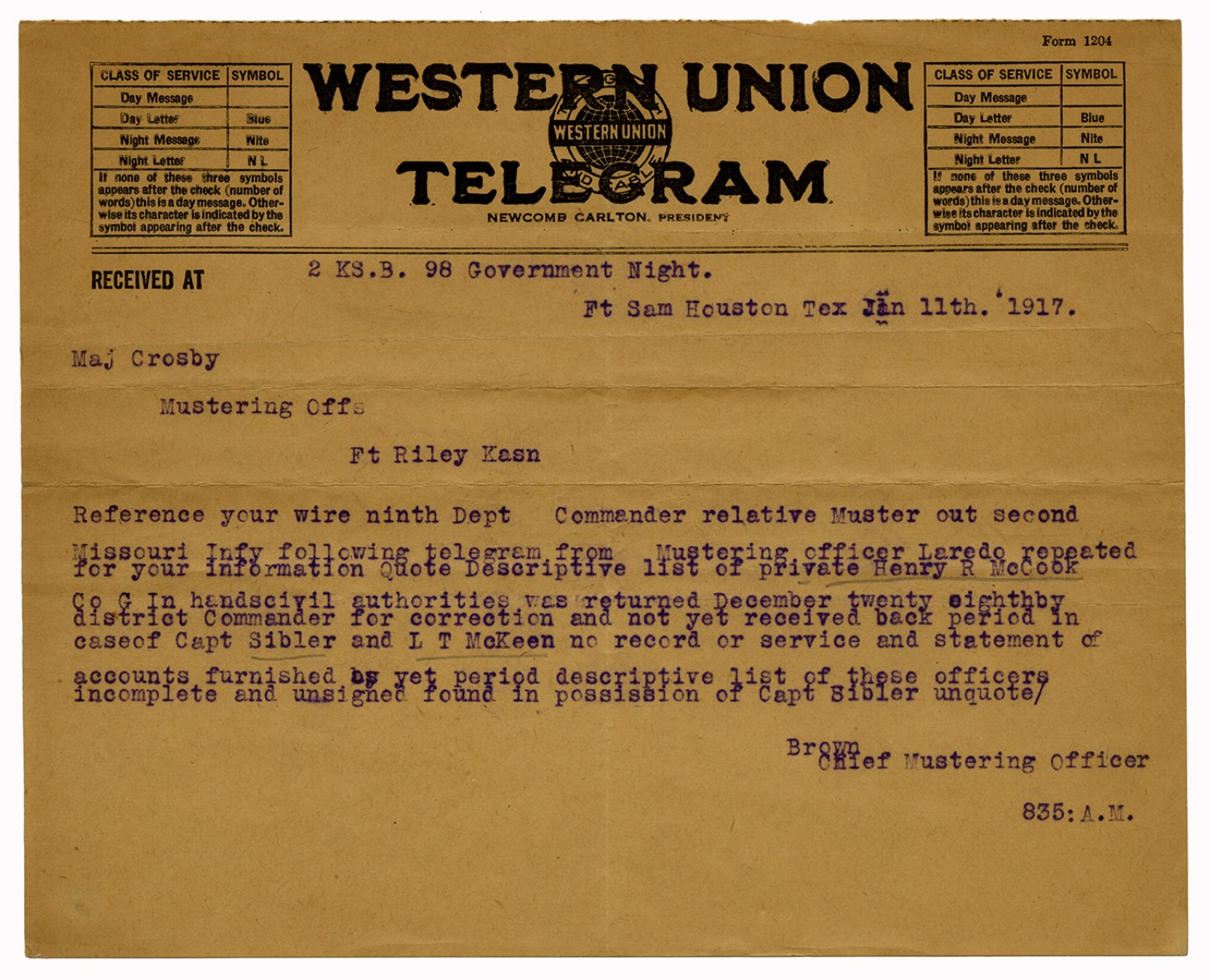 Chief Mustering Officer Brown telegram to H.B. Crosby - January 11, 1917