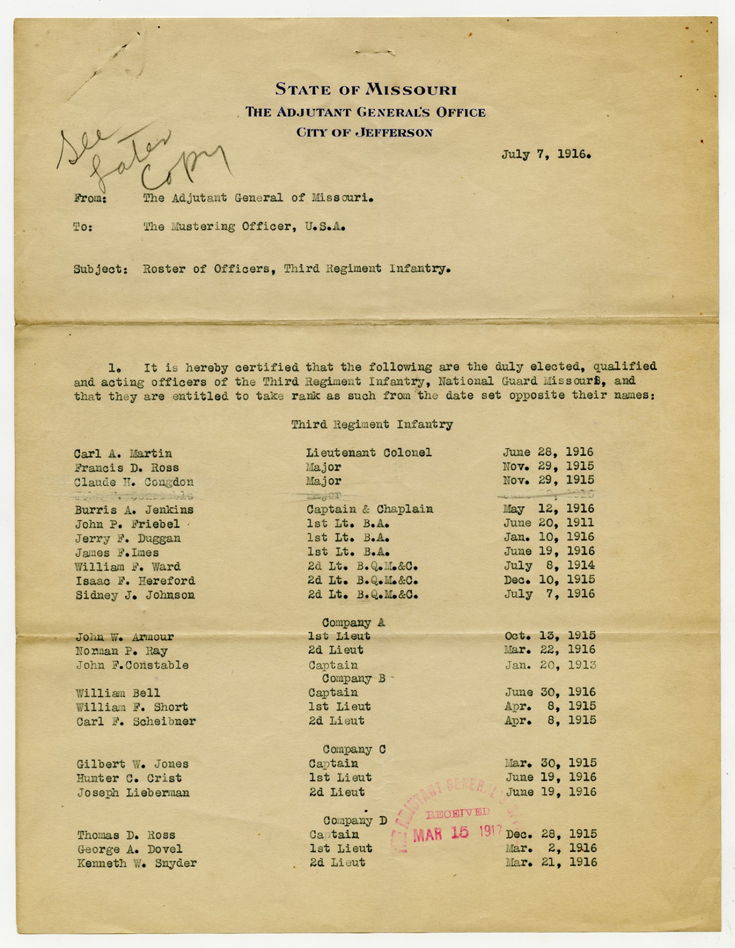Roster of Officers 3rd Regiment Infantry - July 7, 1916