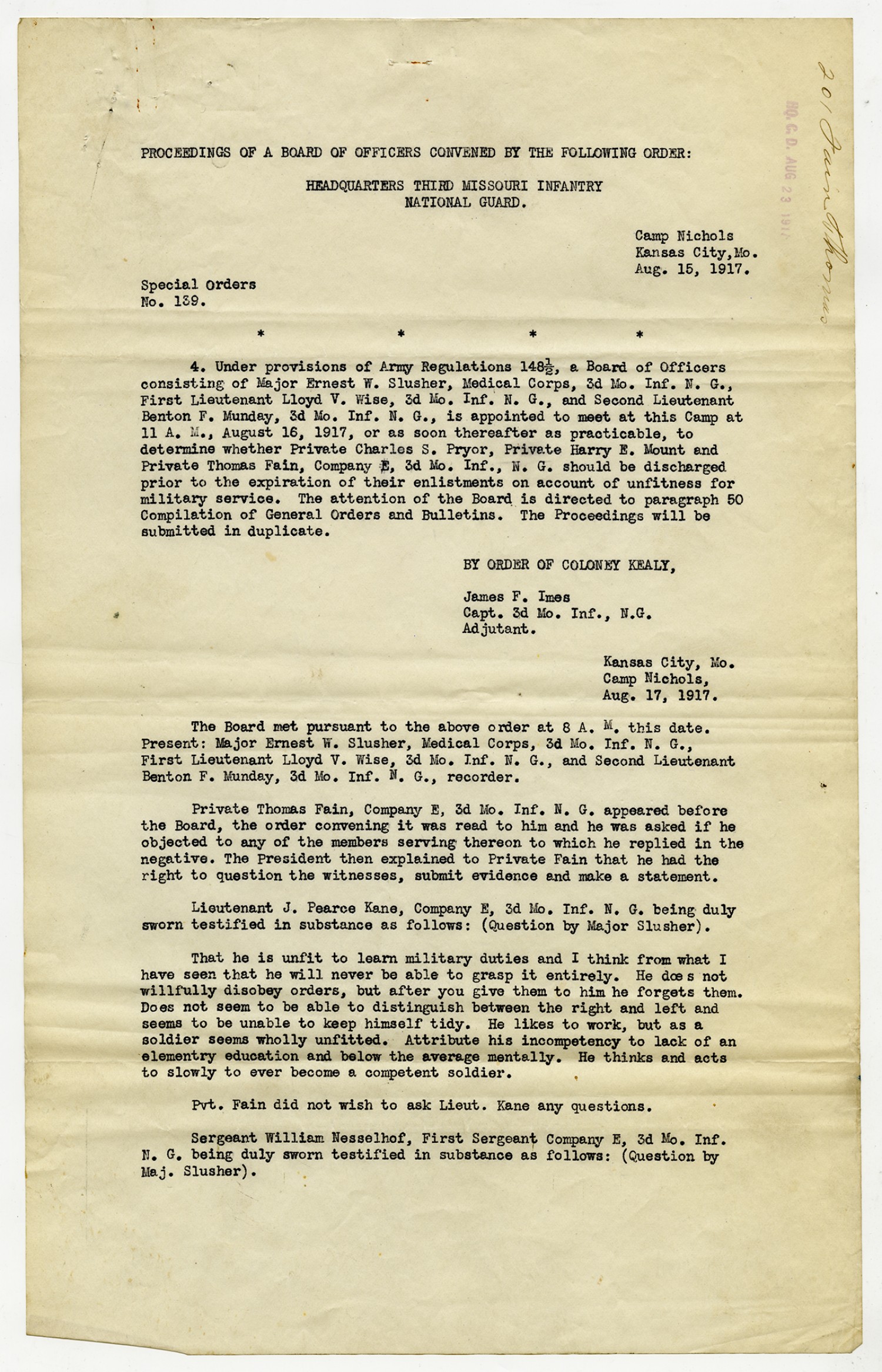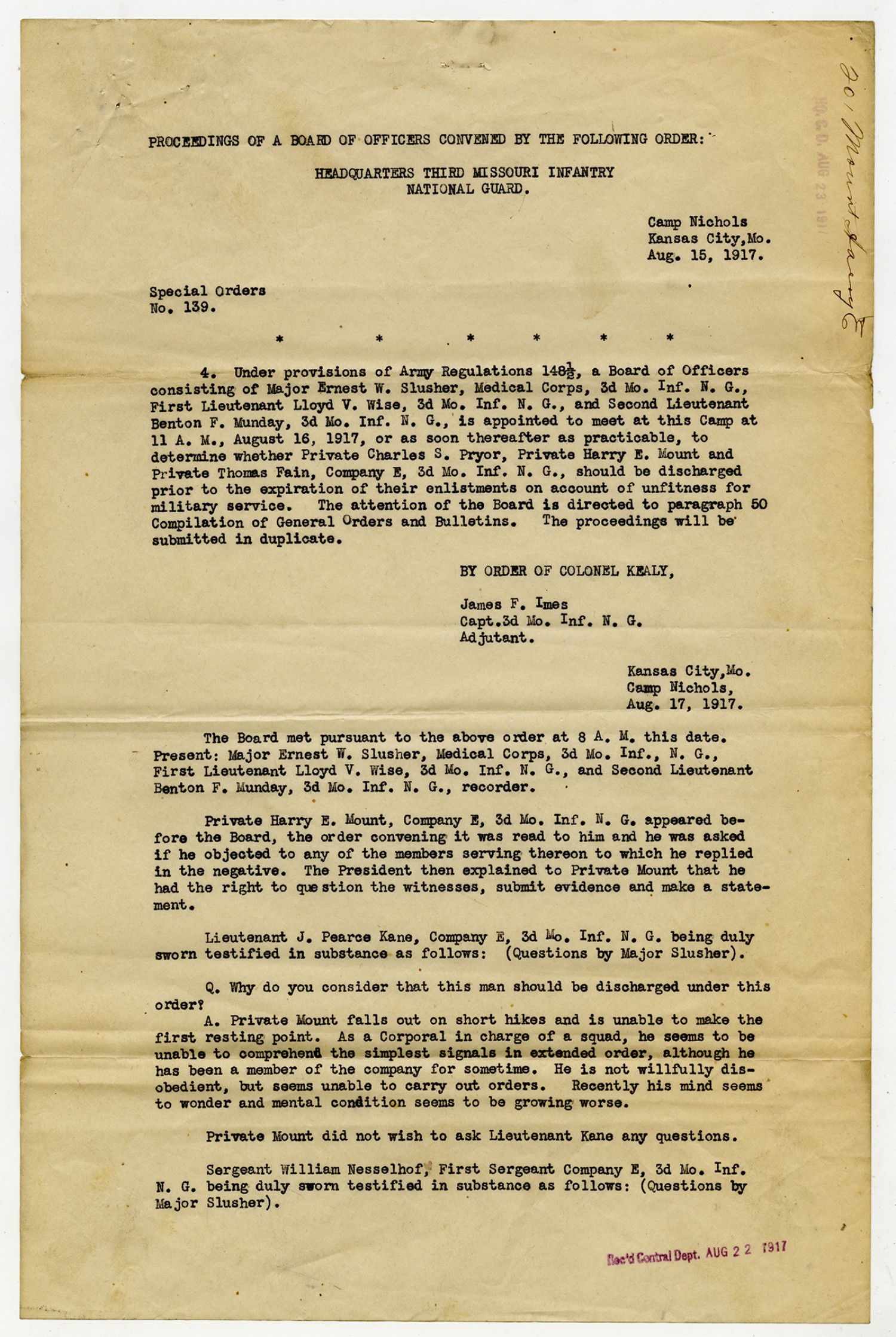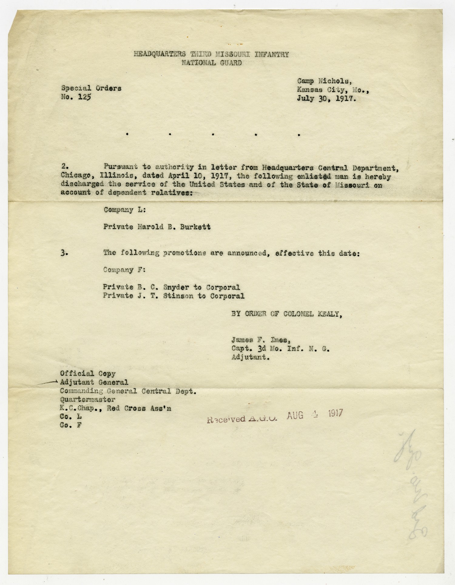 Special Orders from James F. Imes - August 15, 1917