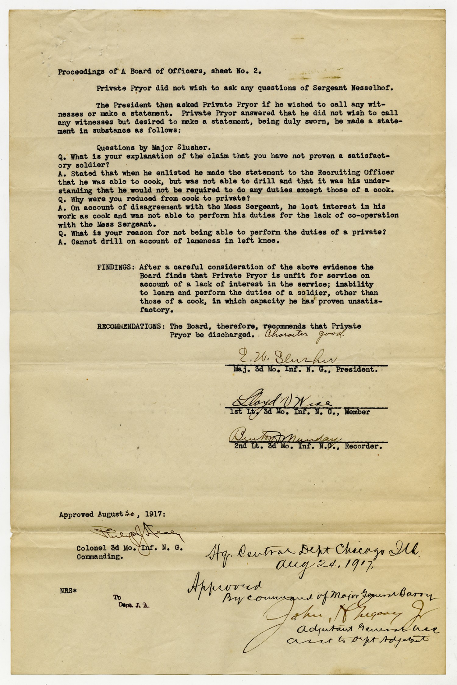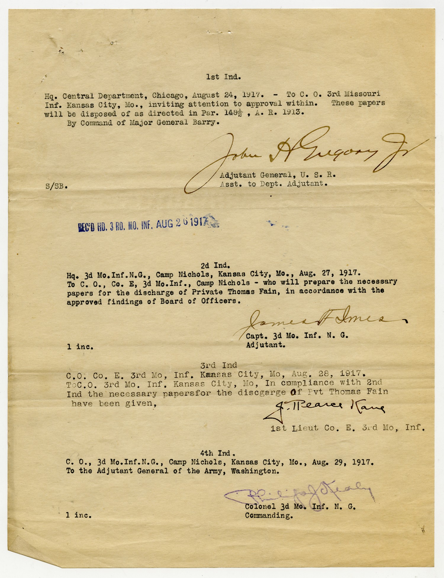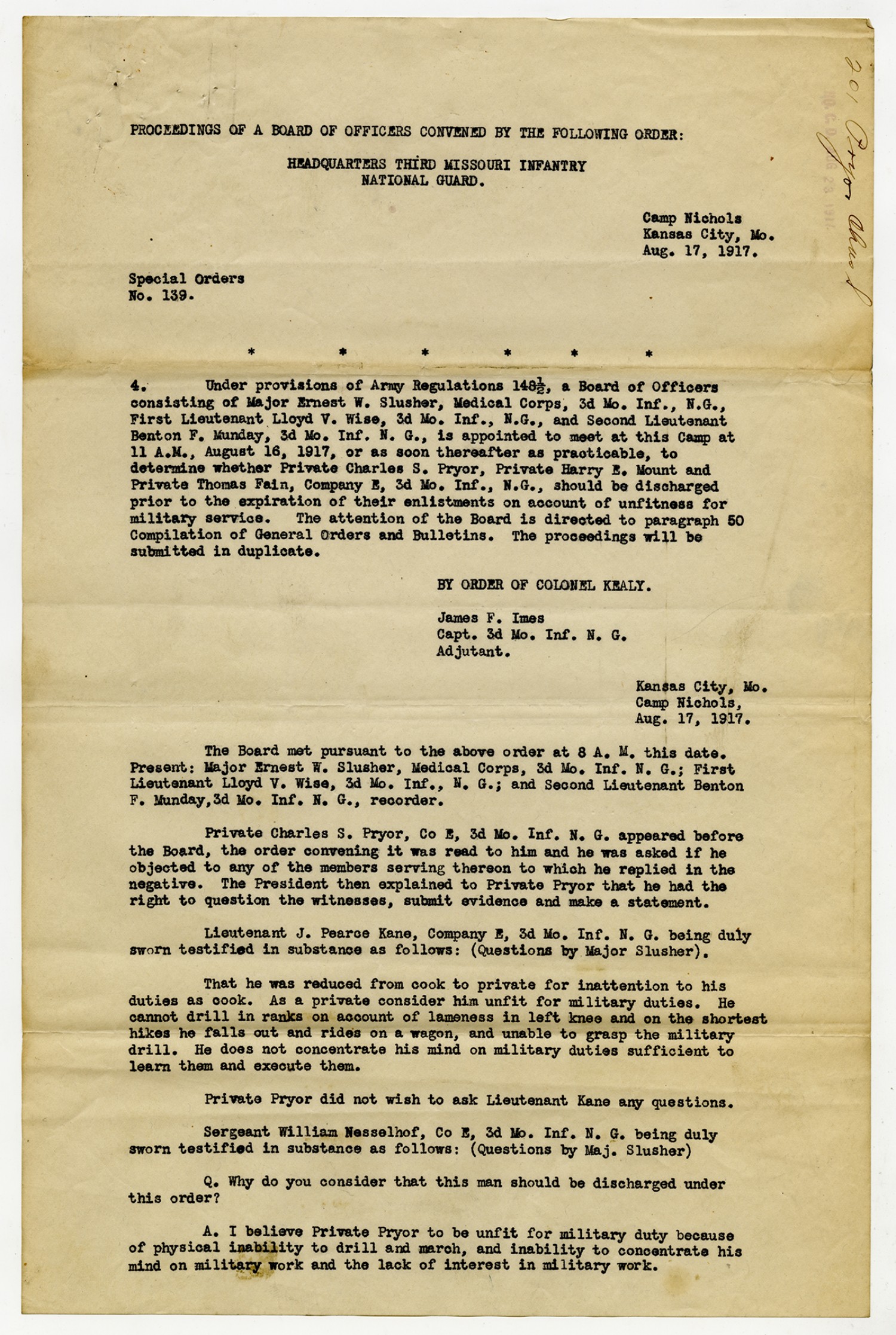 Special Orders from James F. Imes - August 15, 1917