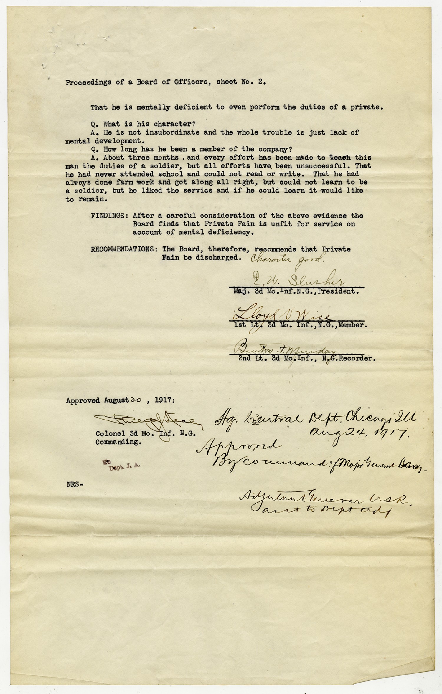 Indorsements for Thomas Fain - August 24, 1917