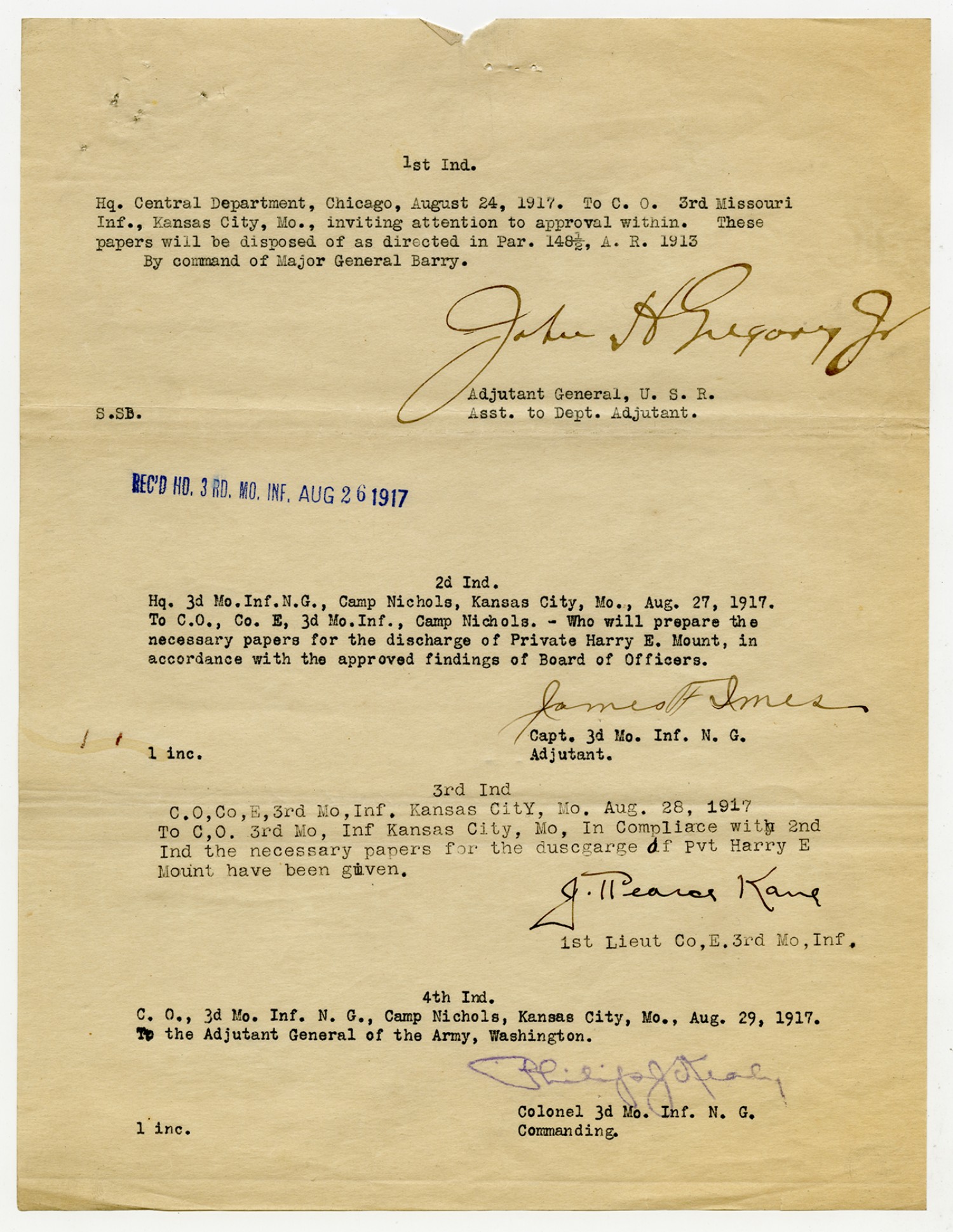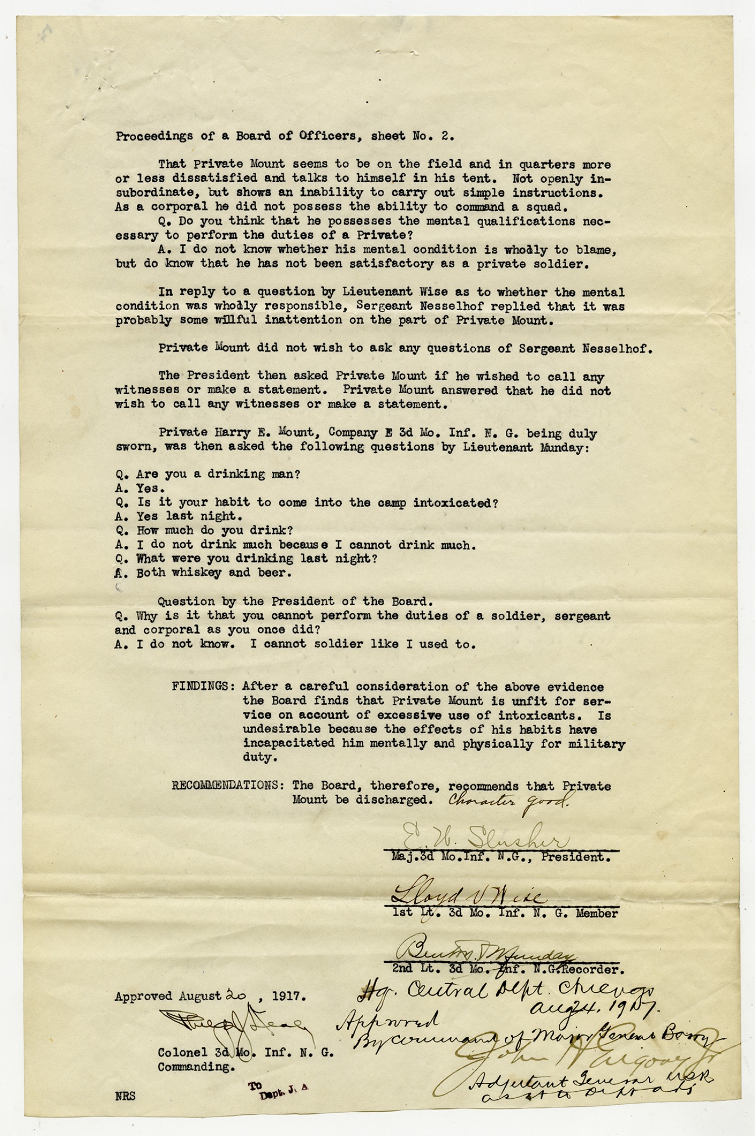 Indorsements for Harry E. Mount - August 24, 1917