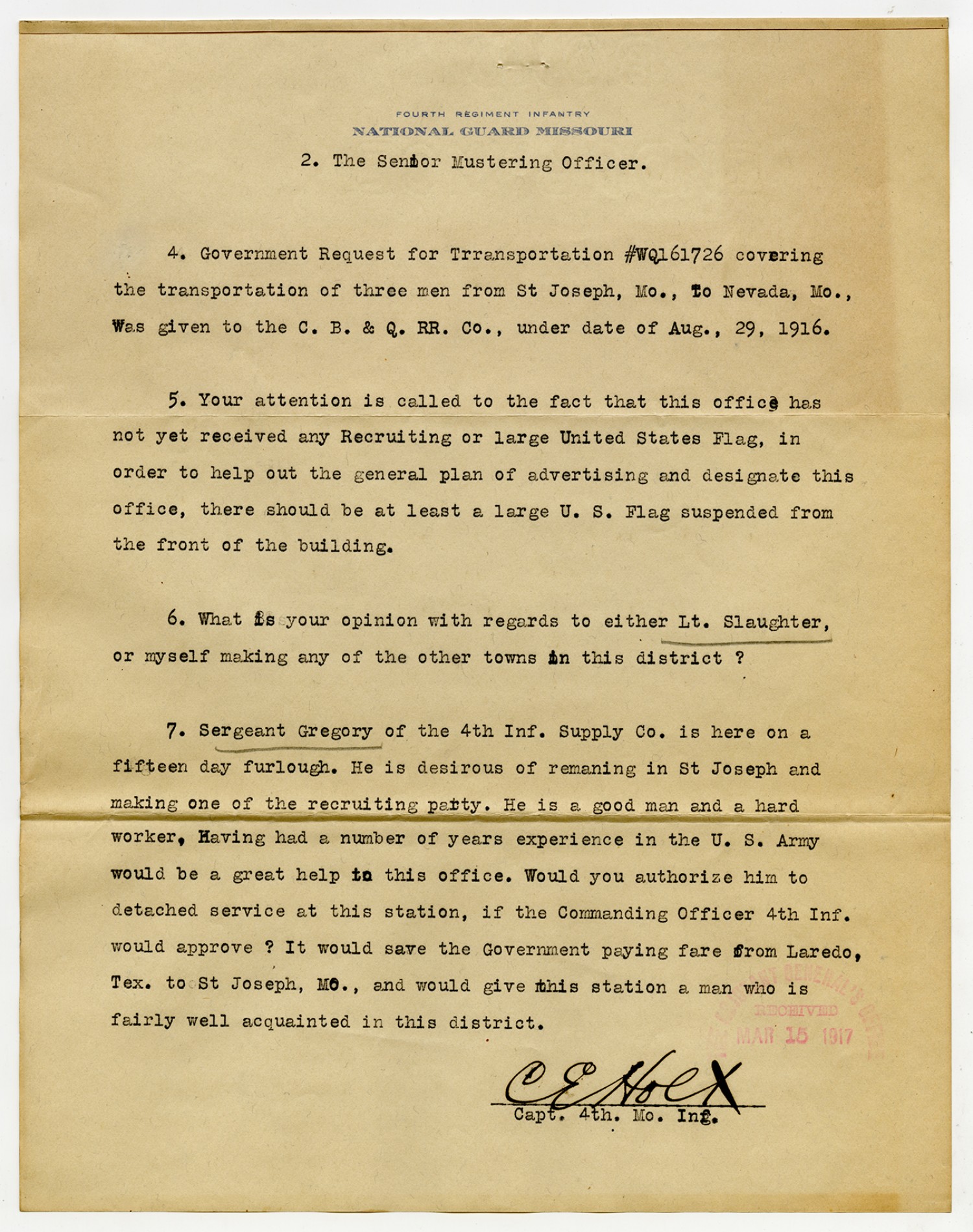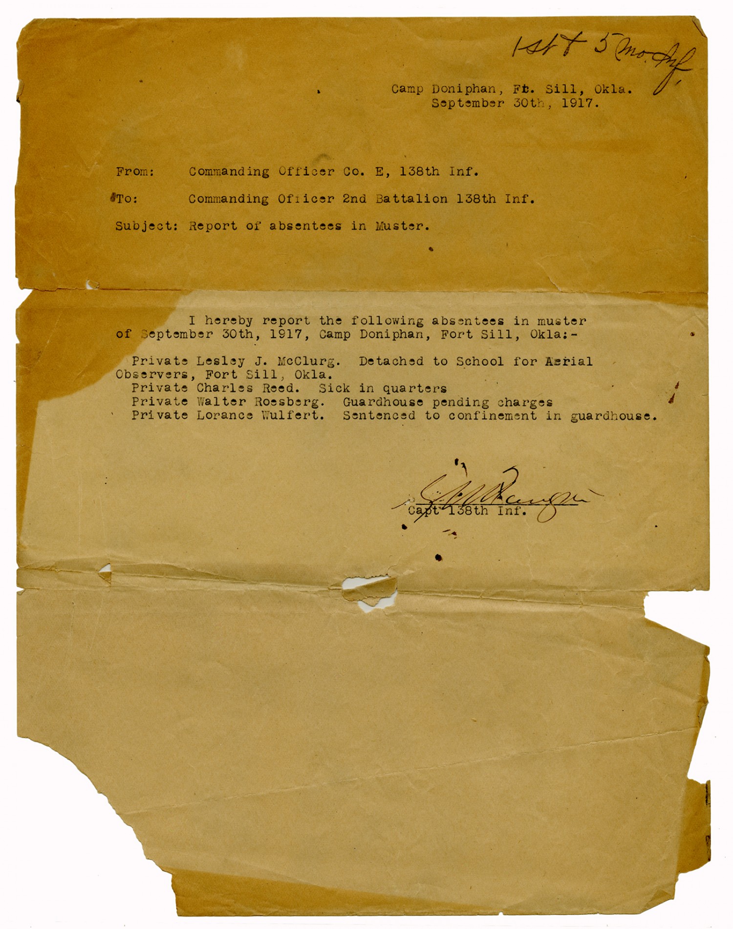 Captain of the 138th Infantry letter to the Commanding Officer - September 30, 1917