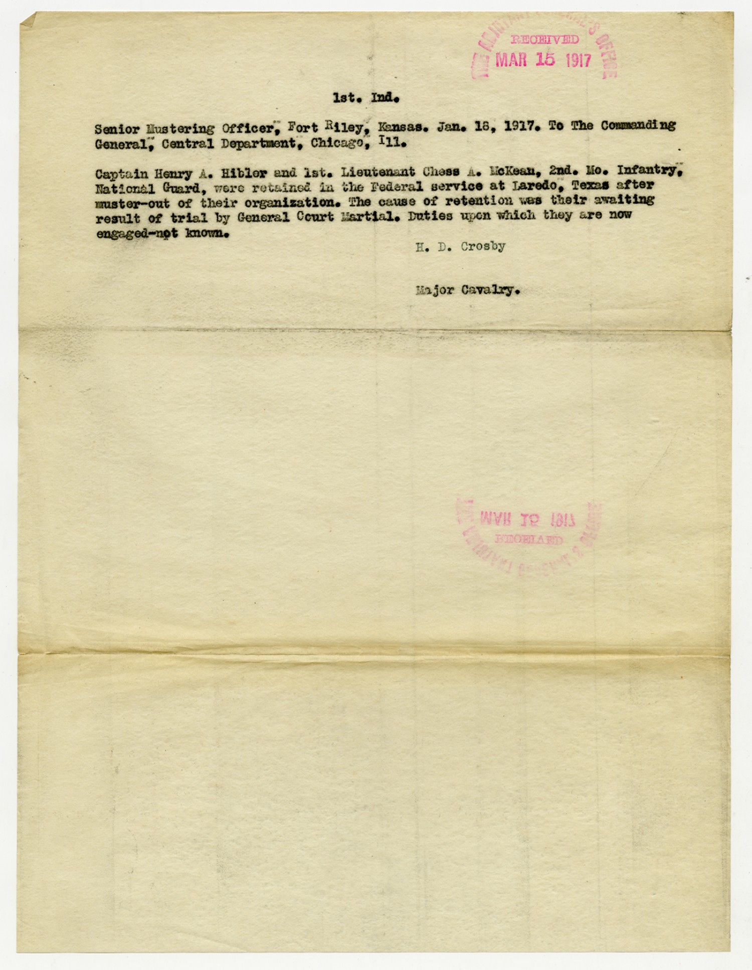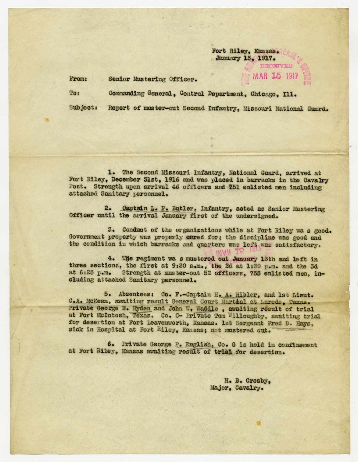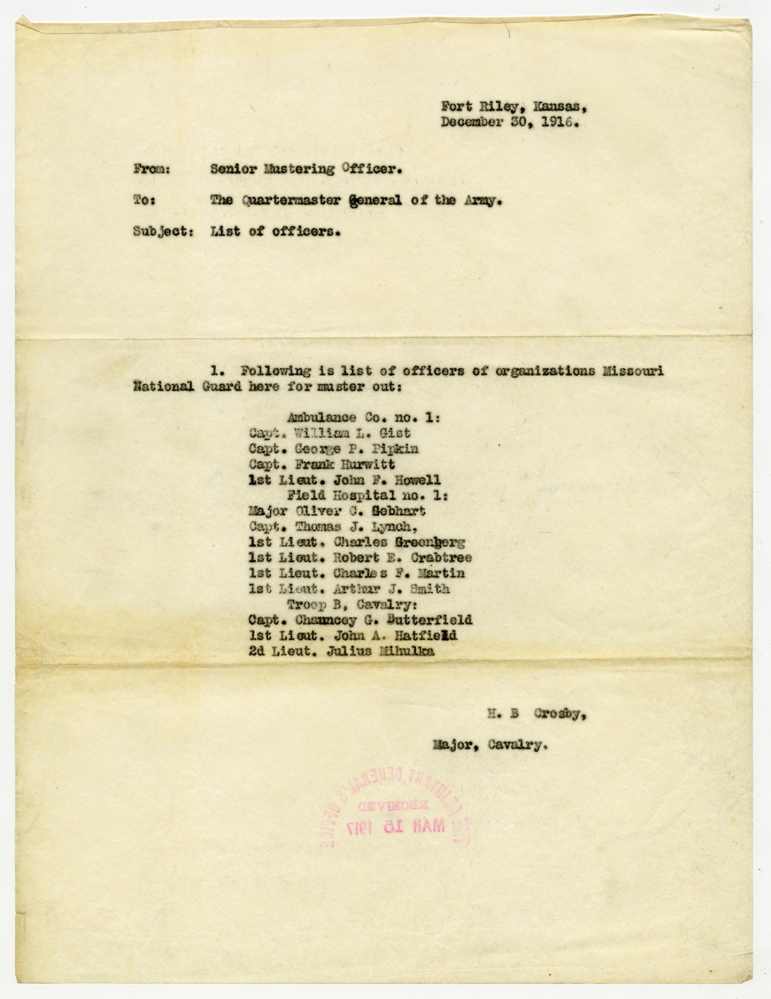 H.B. Crosby letter to the Commanding General - January 15, 1917