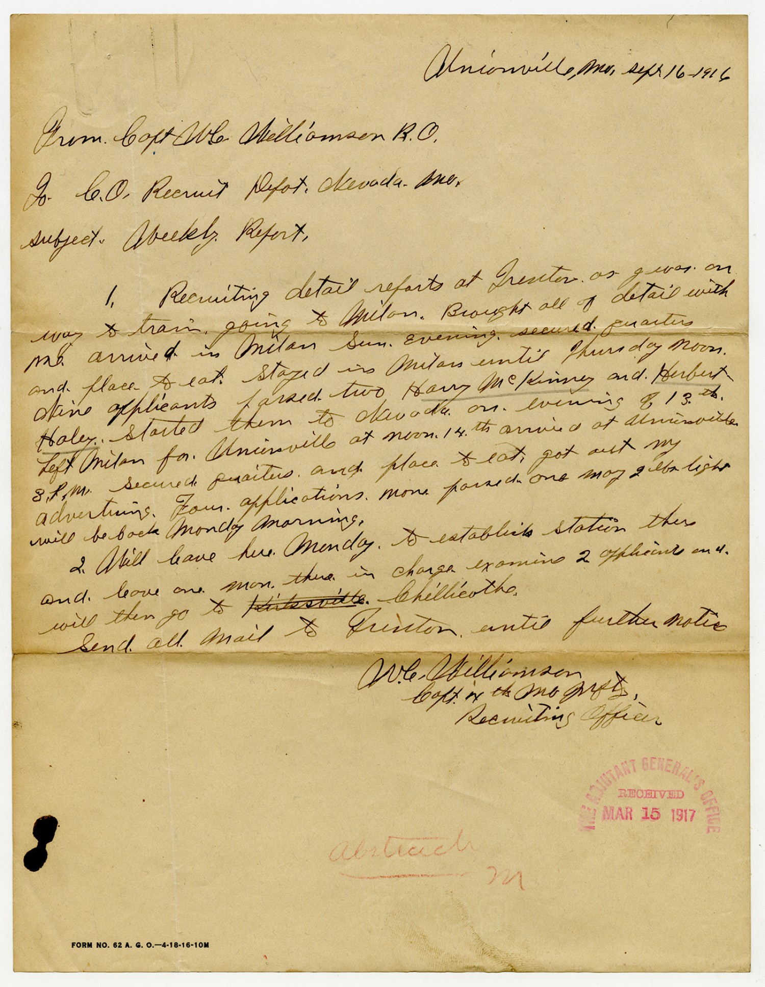 Captain Williamson letter to Recruit Depot - September 16, 1916