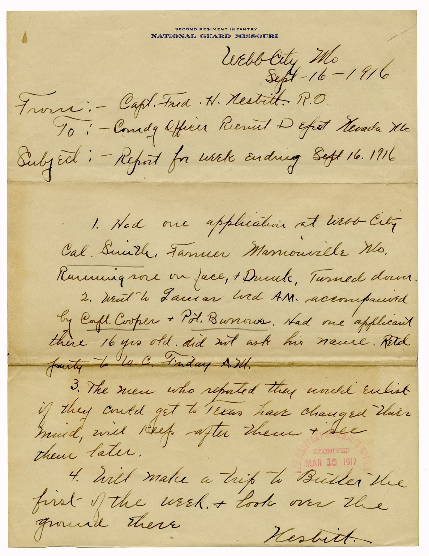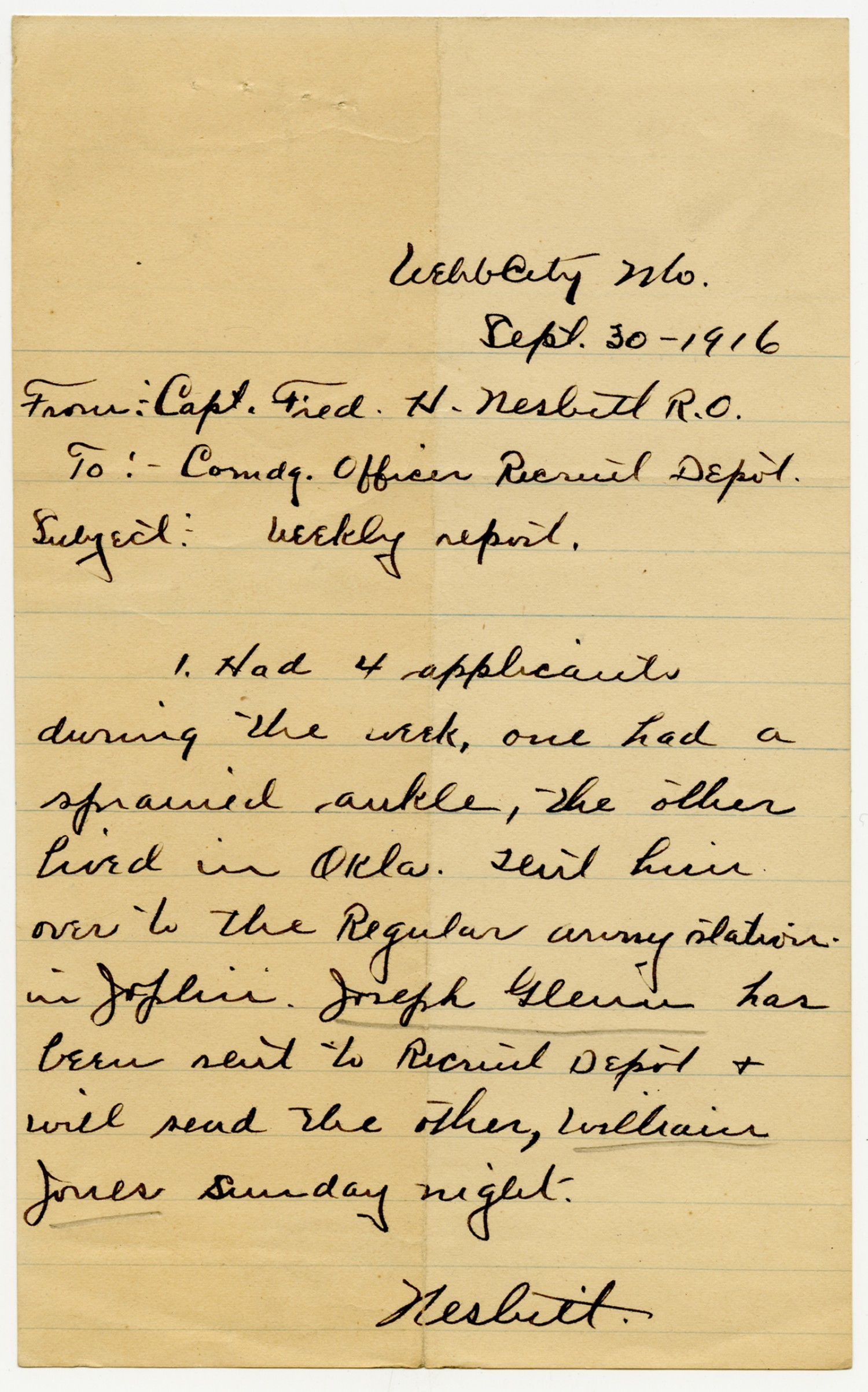 Fred H. Nesbitt letter to Commanding Officer - September 30, 1916