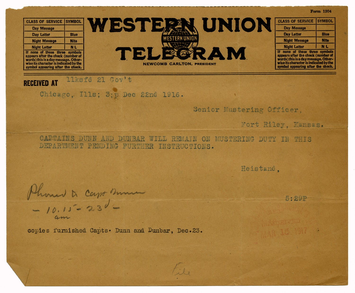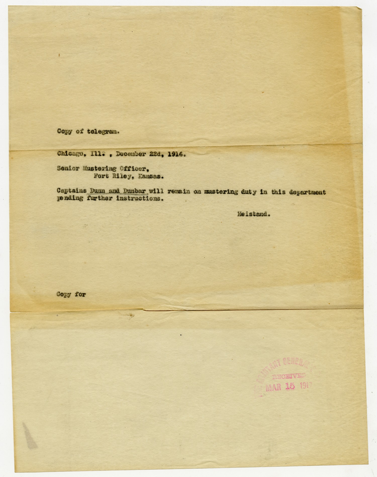 Copy of Heistand telegram to the Senior Mustering Officer - December 22, 1916