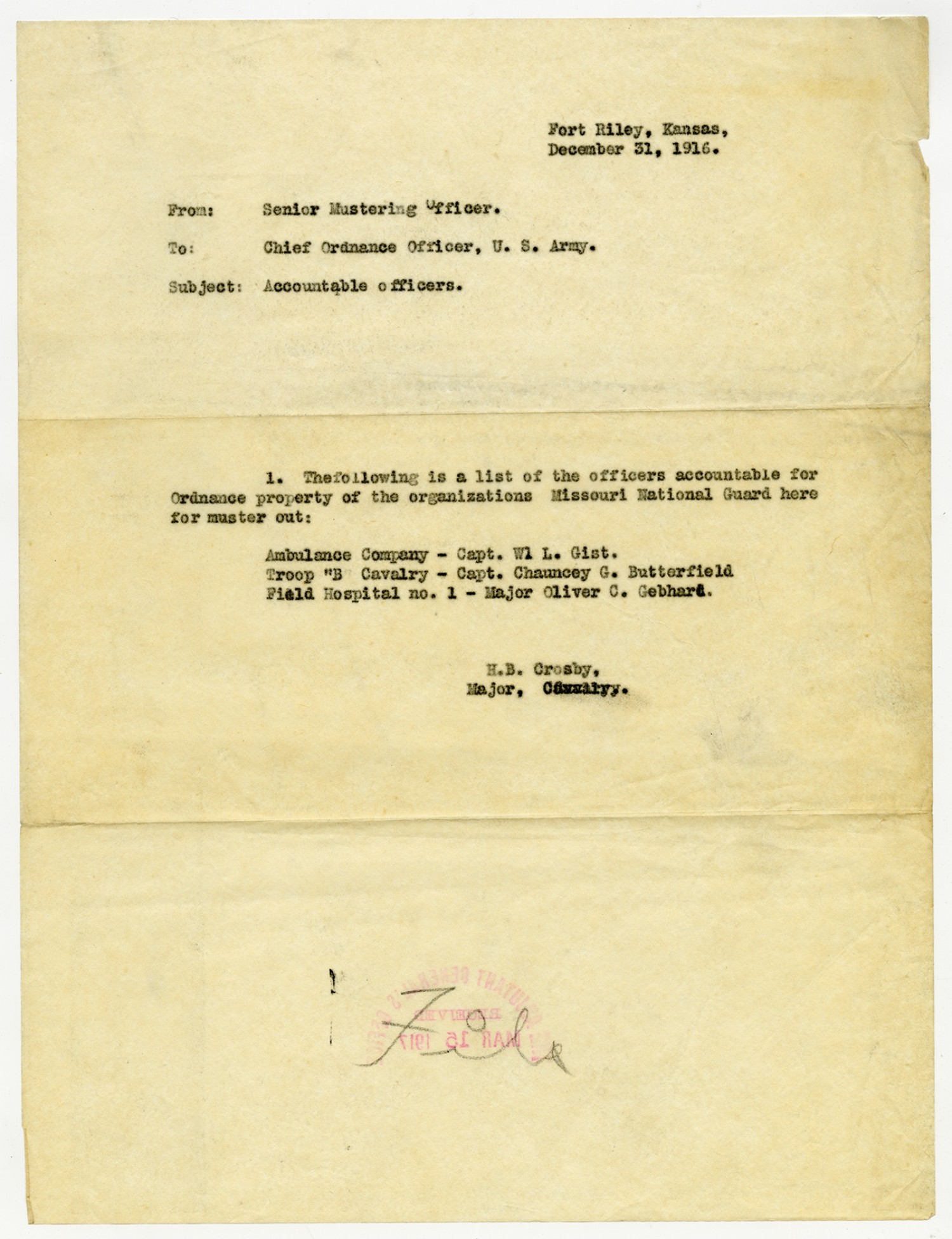 H.B. Crosby letter to the Chief Ordnance Officer - December 31, 1916