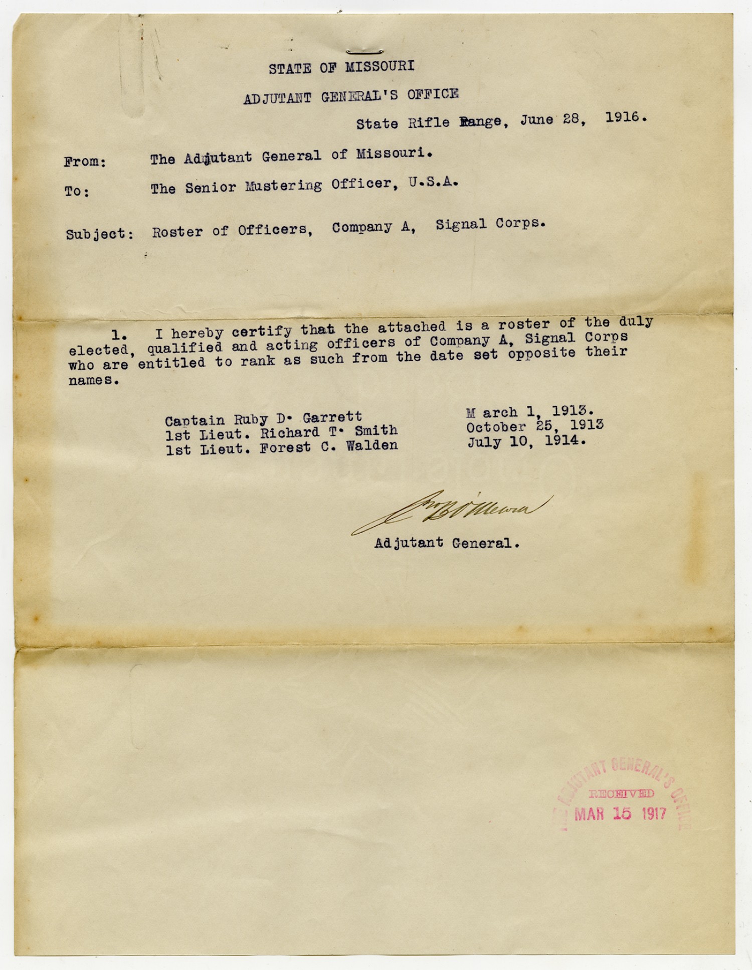 Adjutant General O'Meara letter to the Senior Mustering Officer about Company A, Signal Corps - June 28, 1916