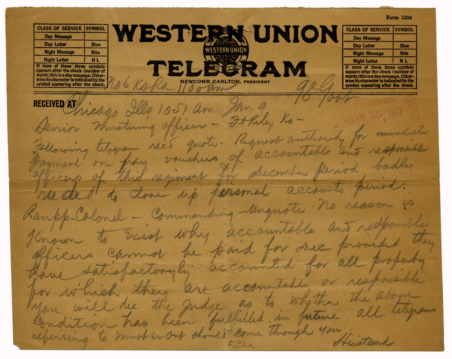 McCain telegram to the Mustering Officer - January 6, 1917