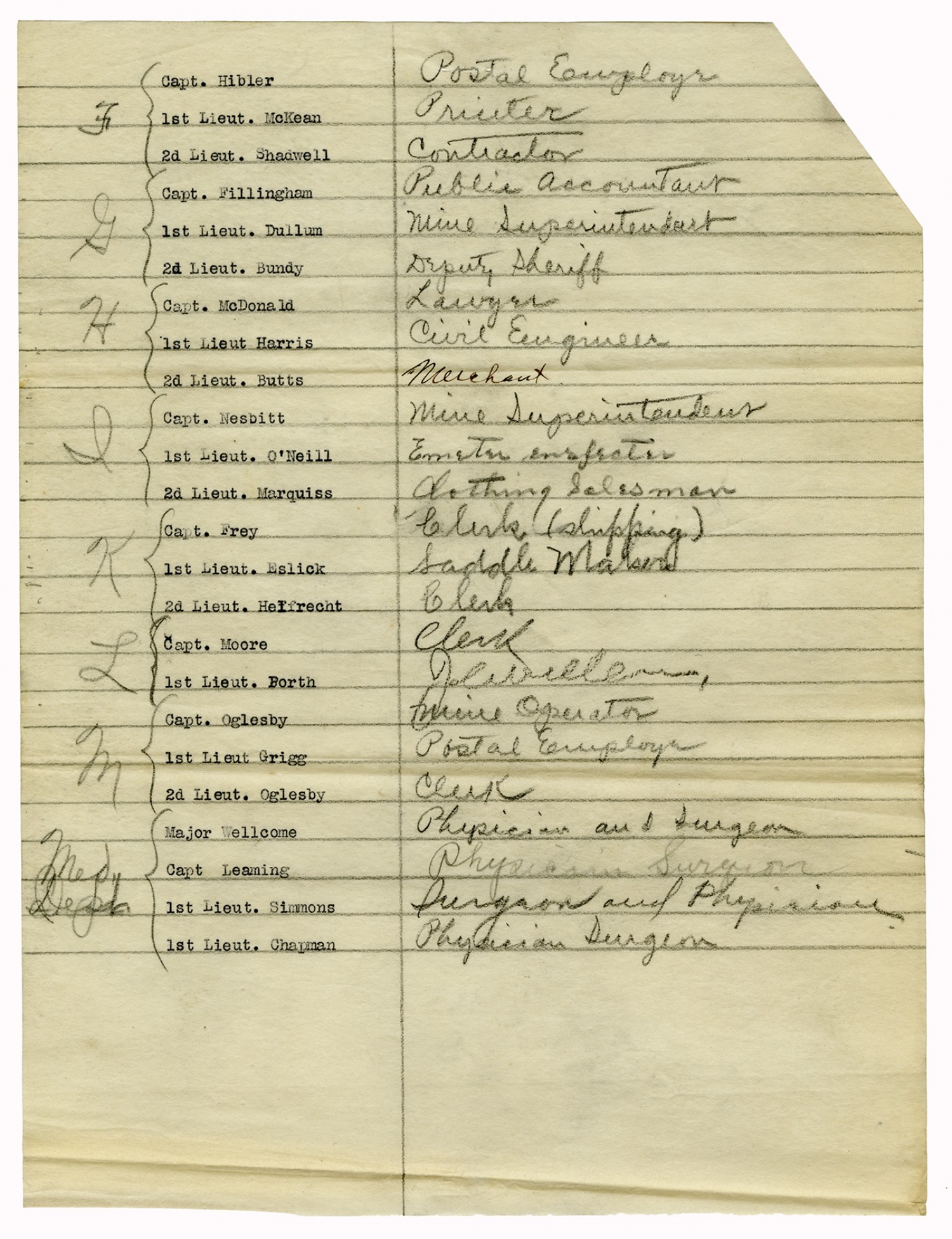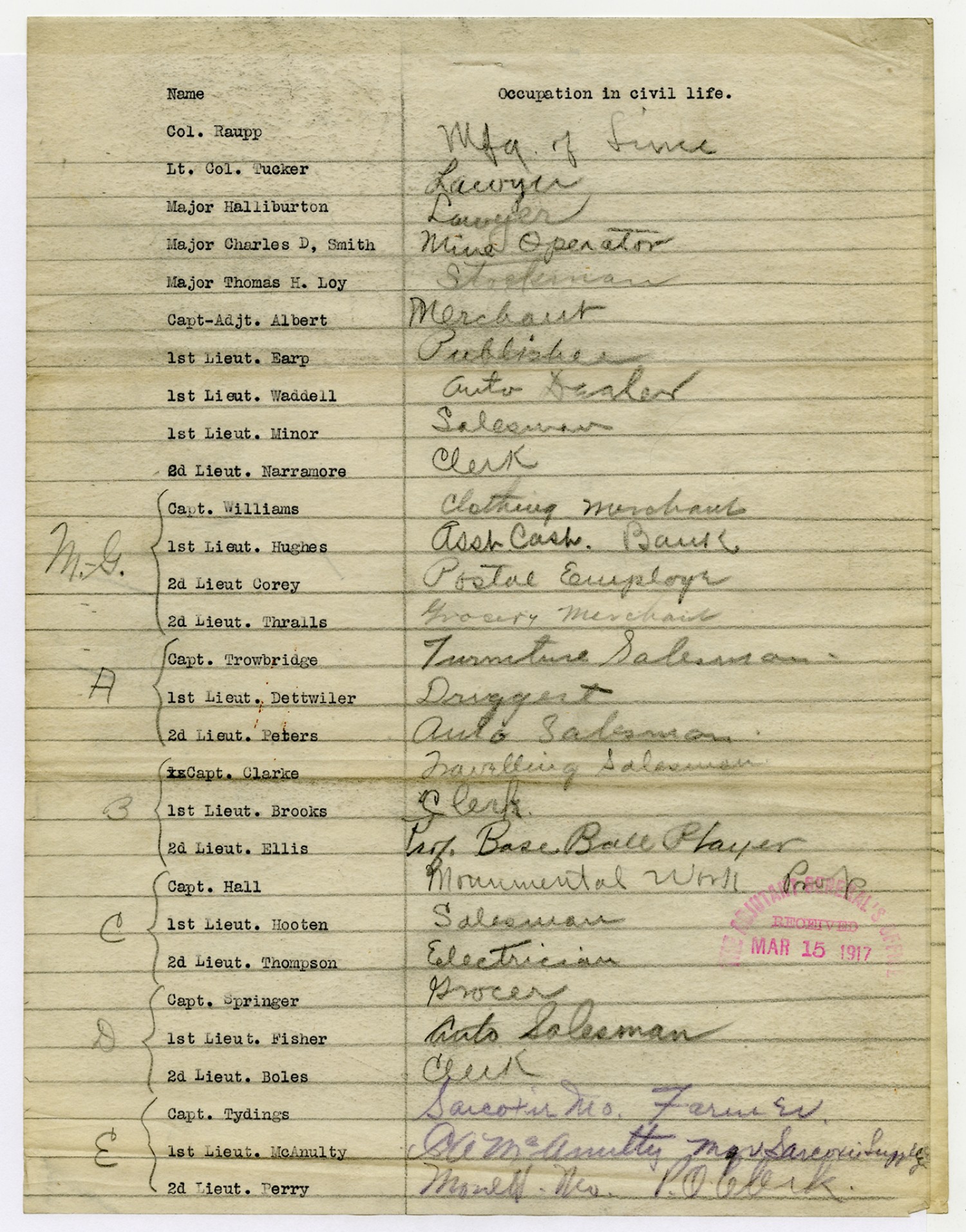 List of men's' Occupations in Civilian Life - March 15, 1917