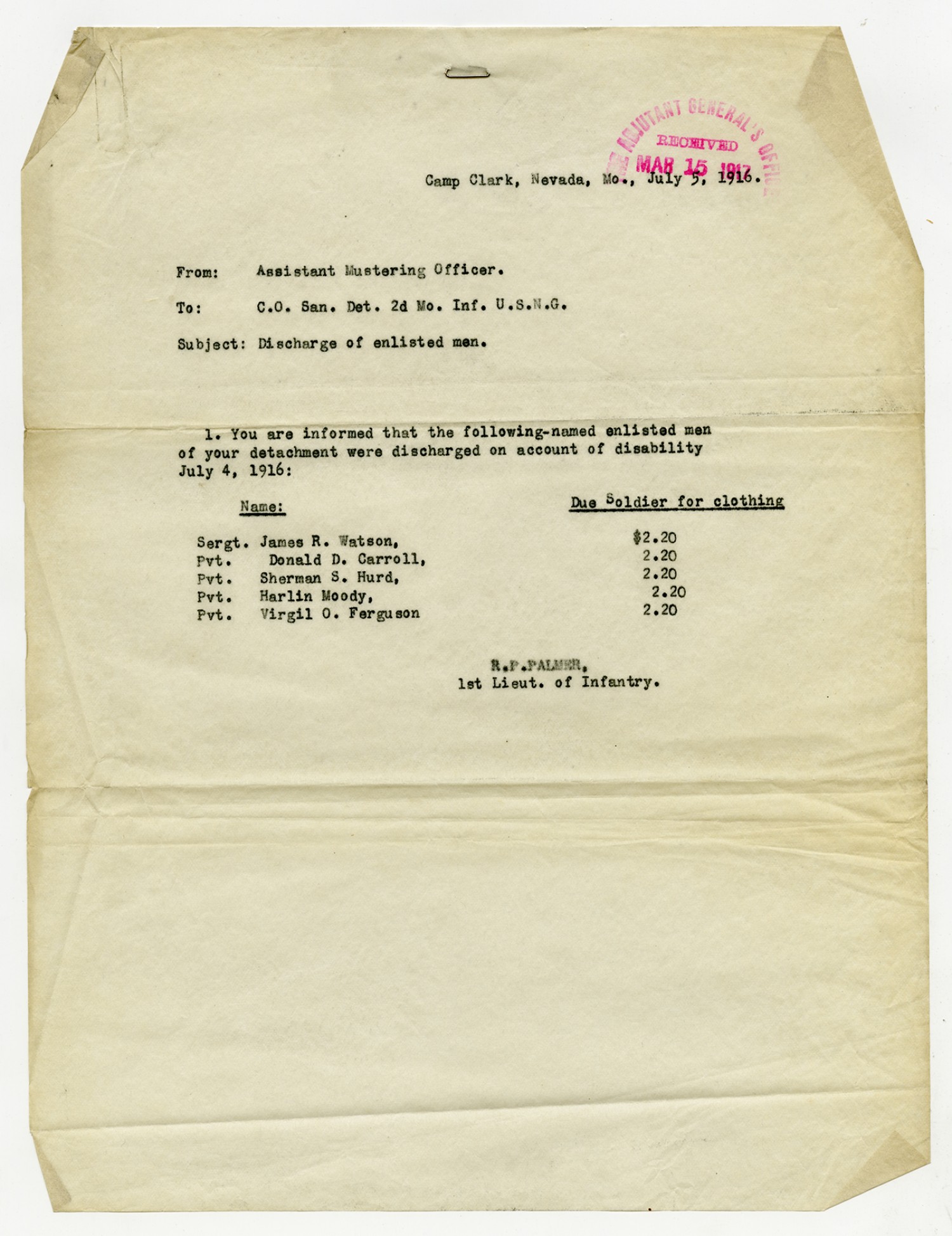 R.P. Palmer letter to C.O. Sanitary Detachment - July 5, 1916