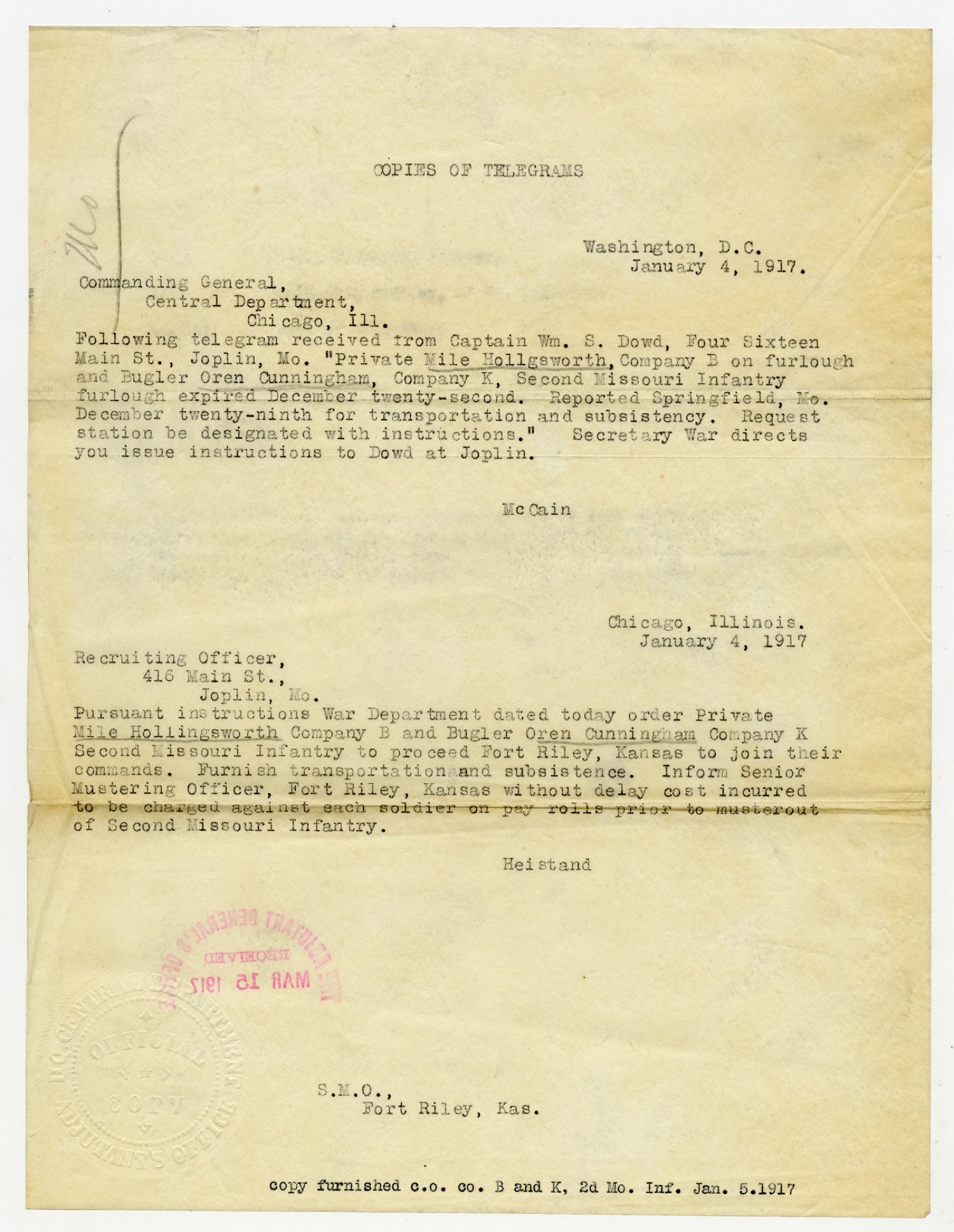 Copies of Telegrams from McCain and Heistand - January 4, 1917
