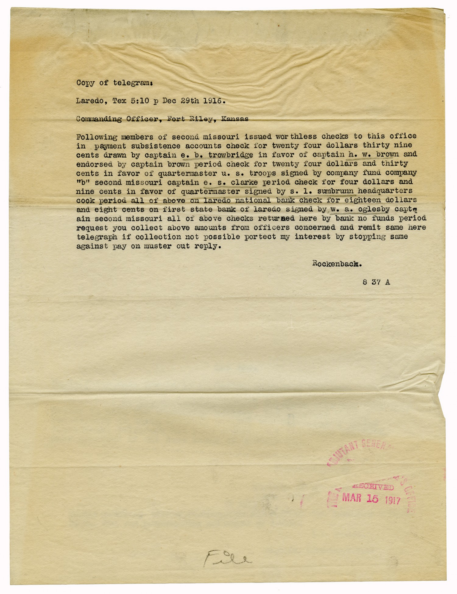 Rockenback telegram to the Commanding Officer - December 29, 1916