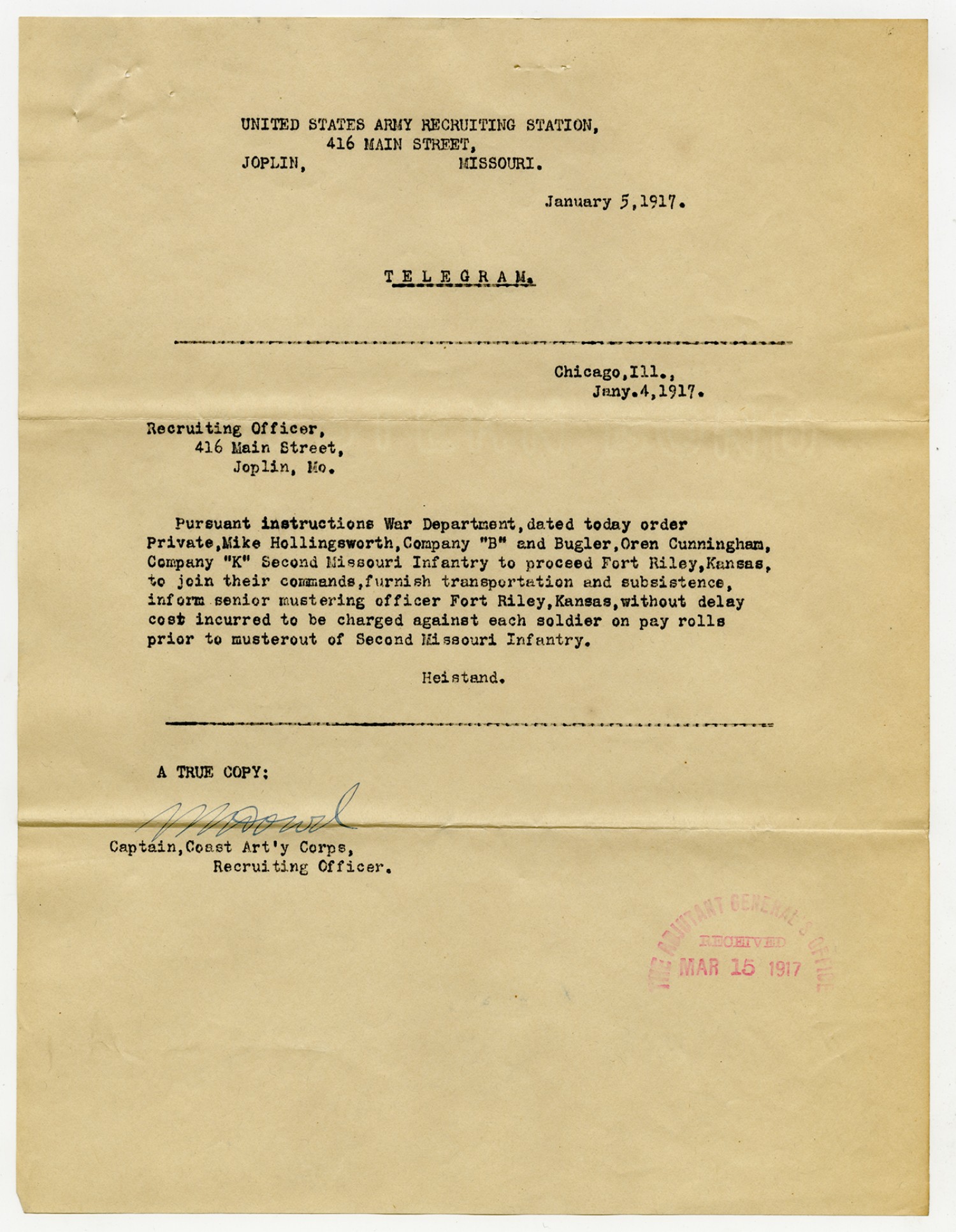 Heistand telegram to the Recruiting Officer - January 5, 1917