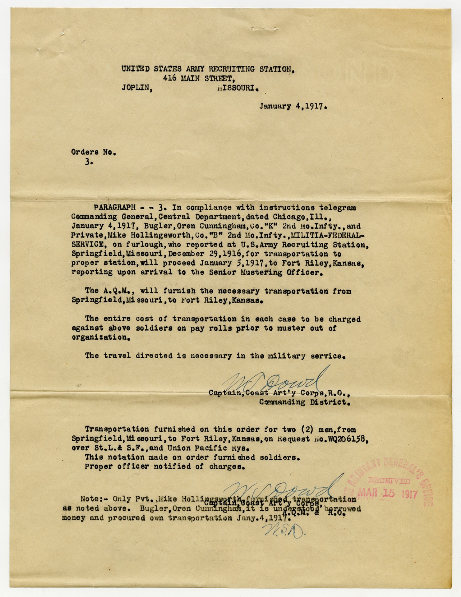 Captain Dowd Order No. 3 - January 4, 1917