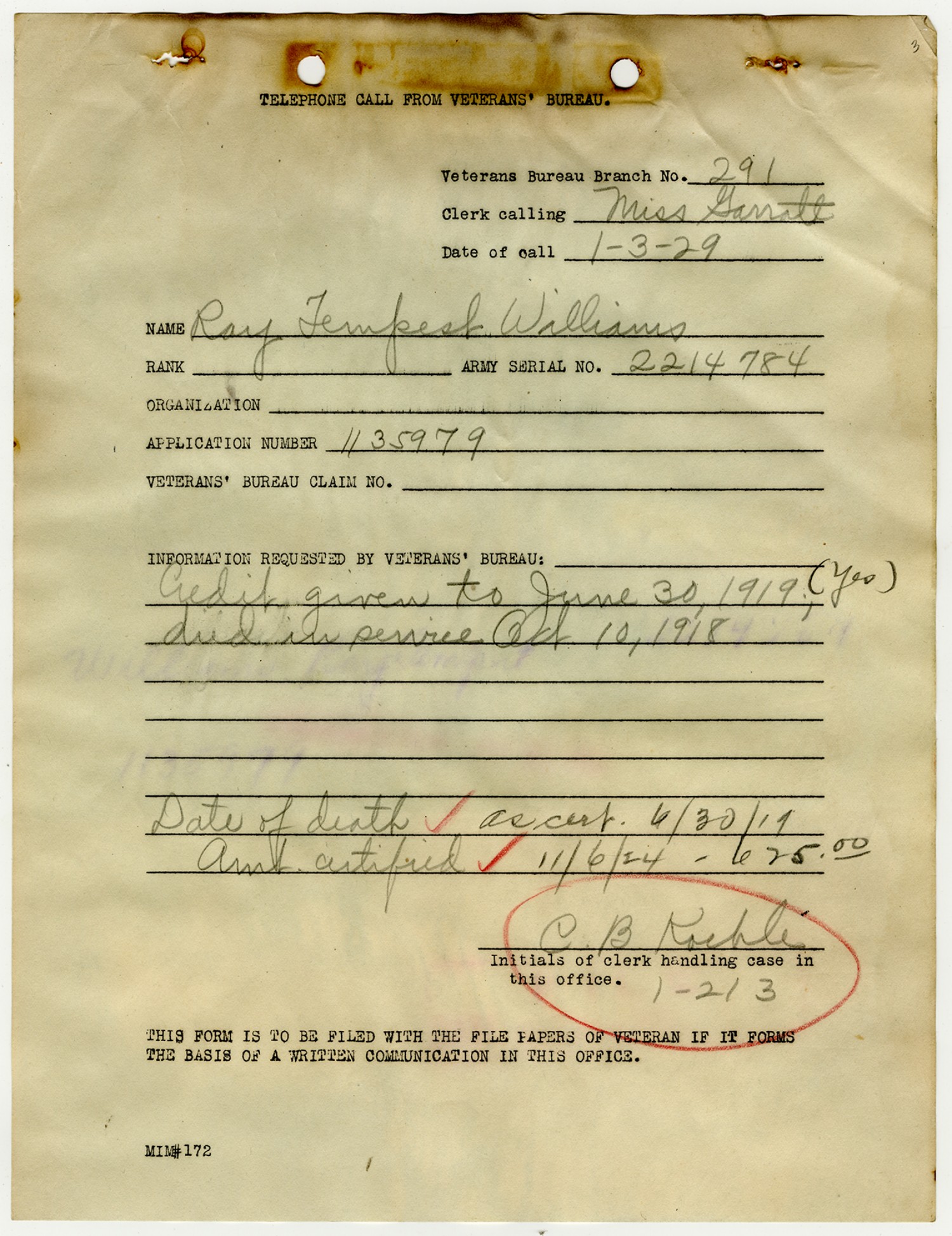 Telephone Call from Veterans' Bureau - January 3, 1929