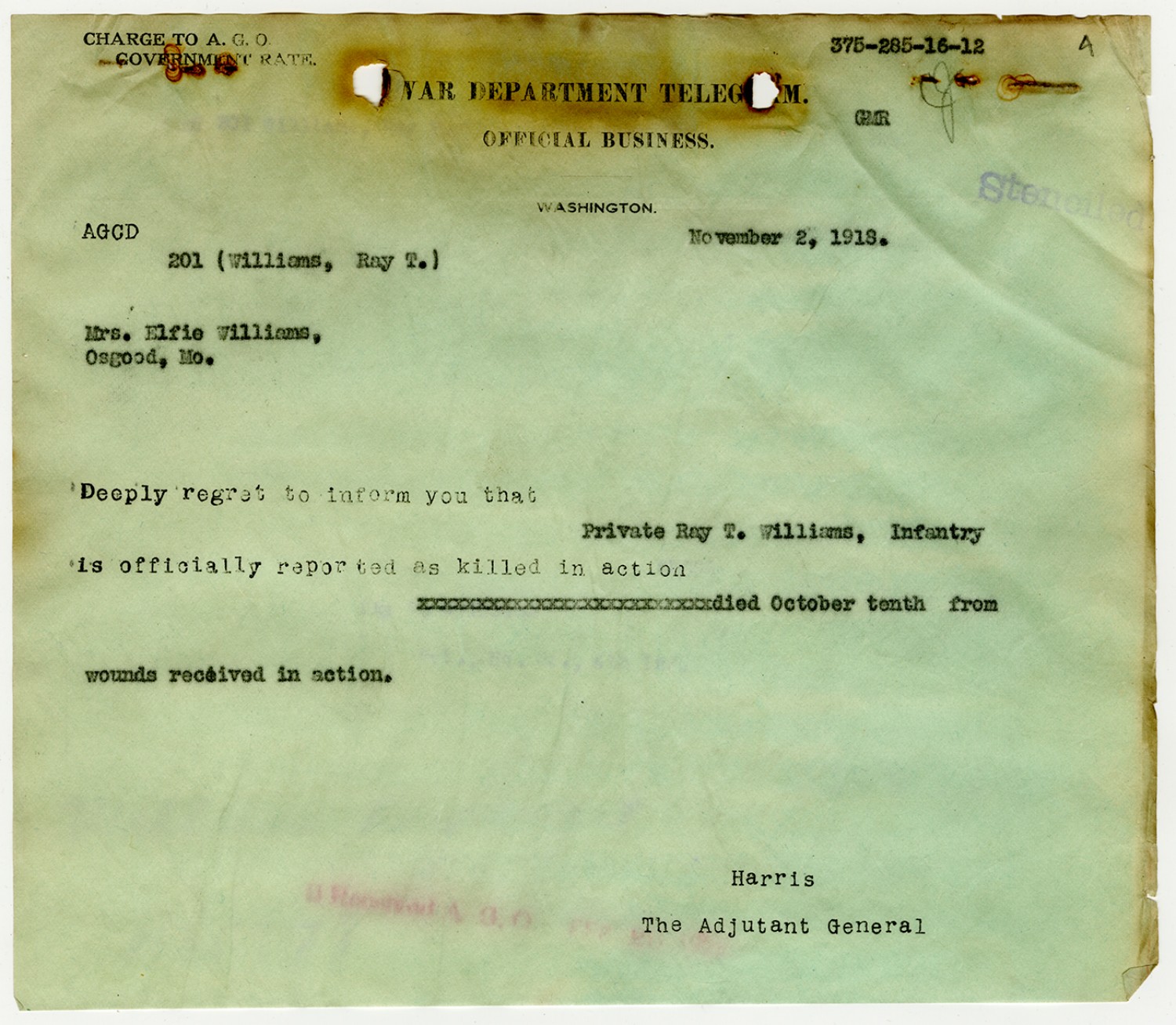 War Department Telegram to Elfie Williams - November 2, 1918
