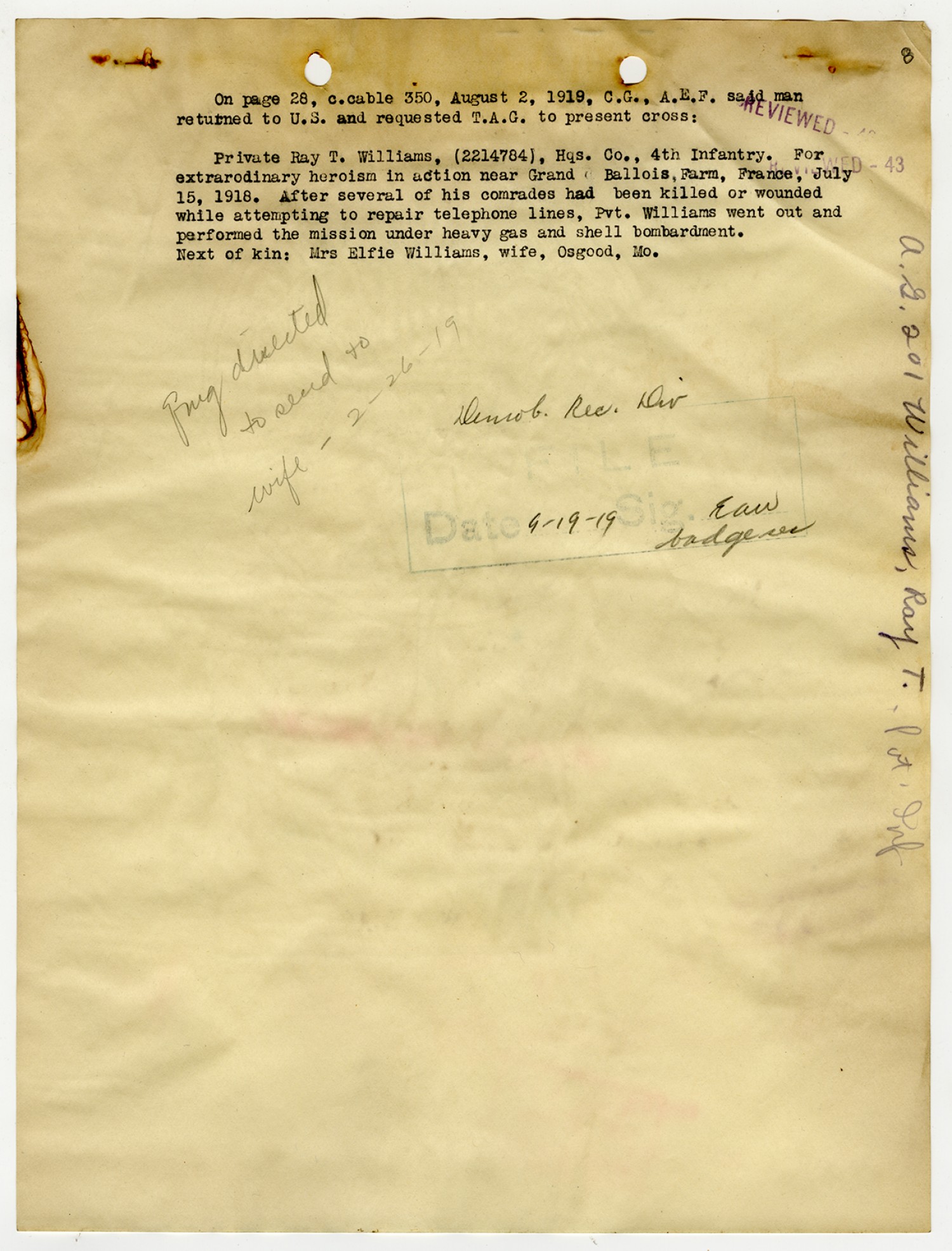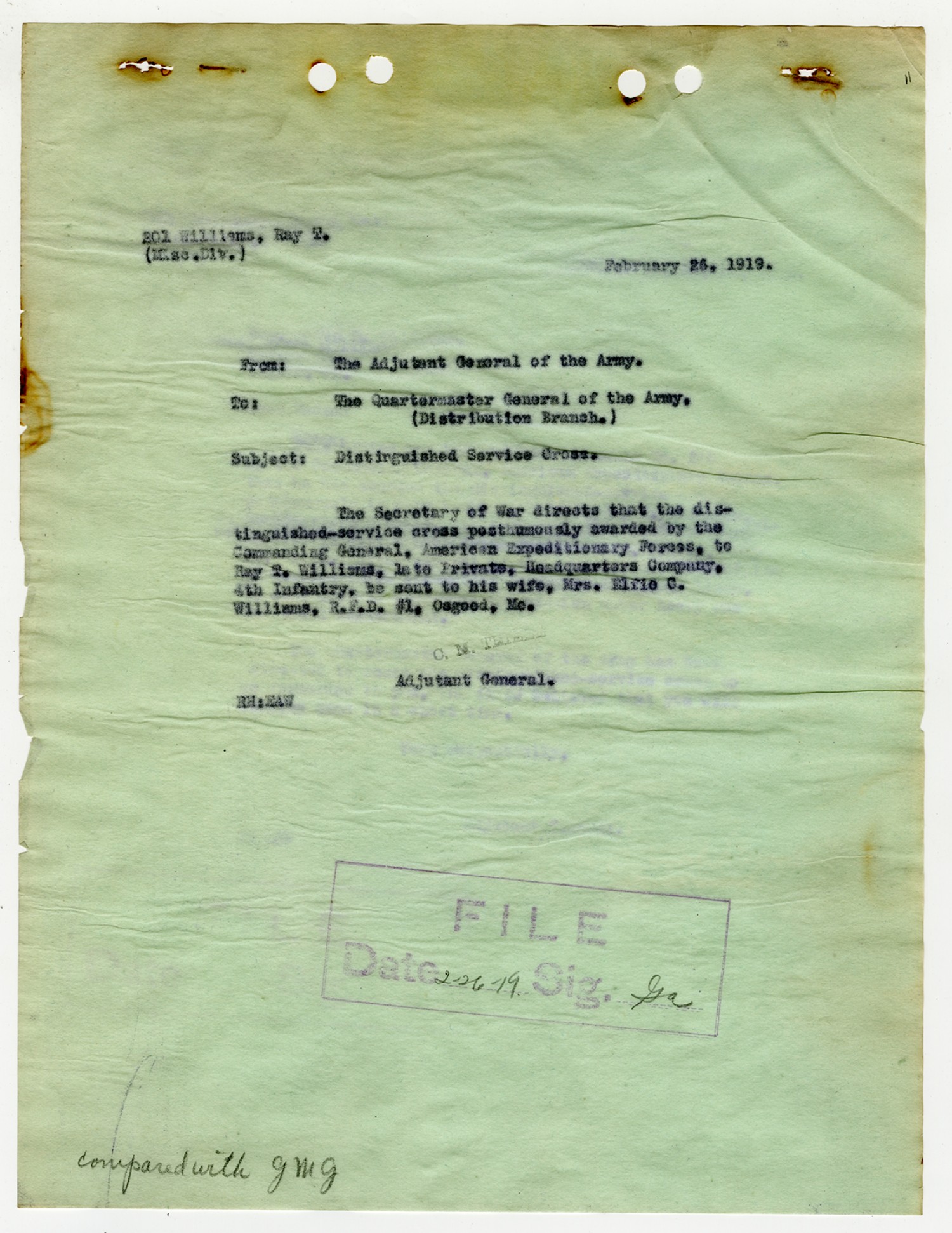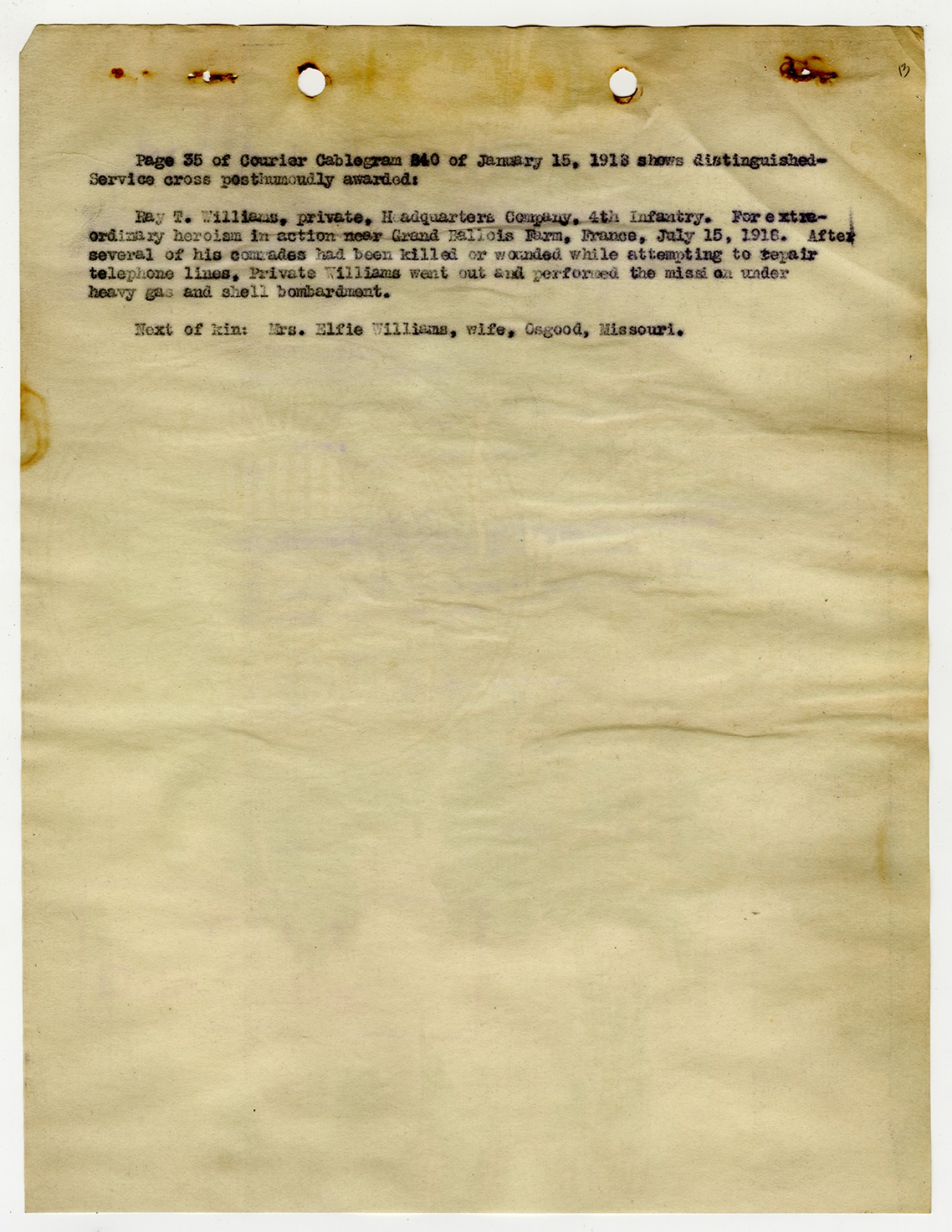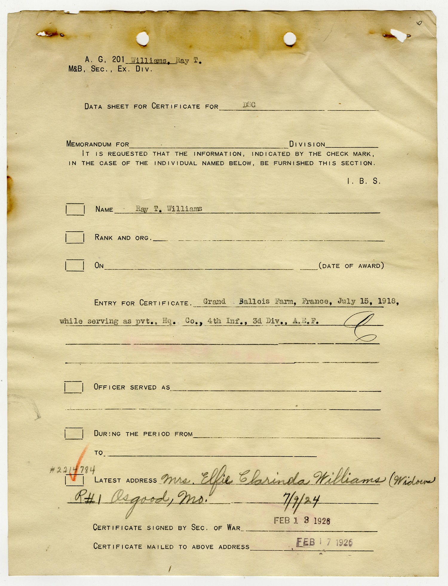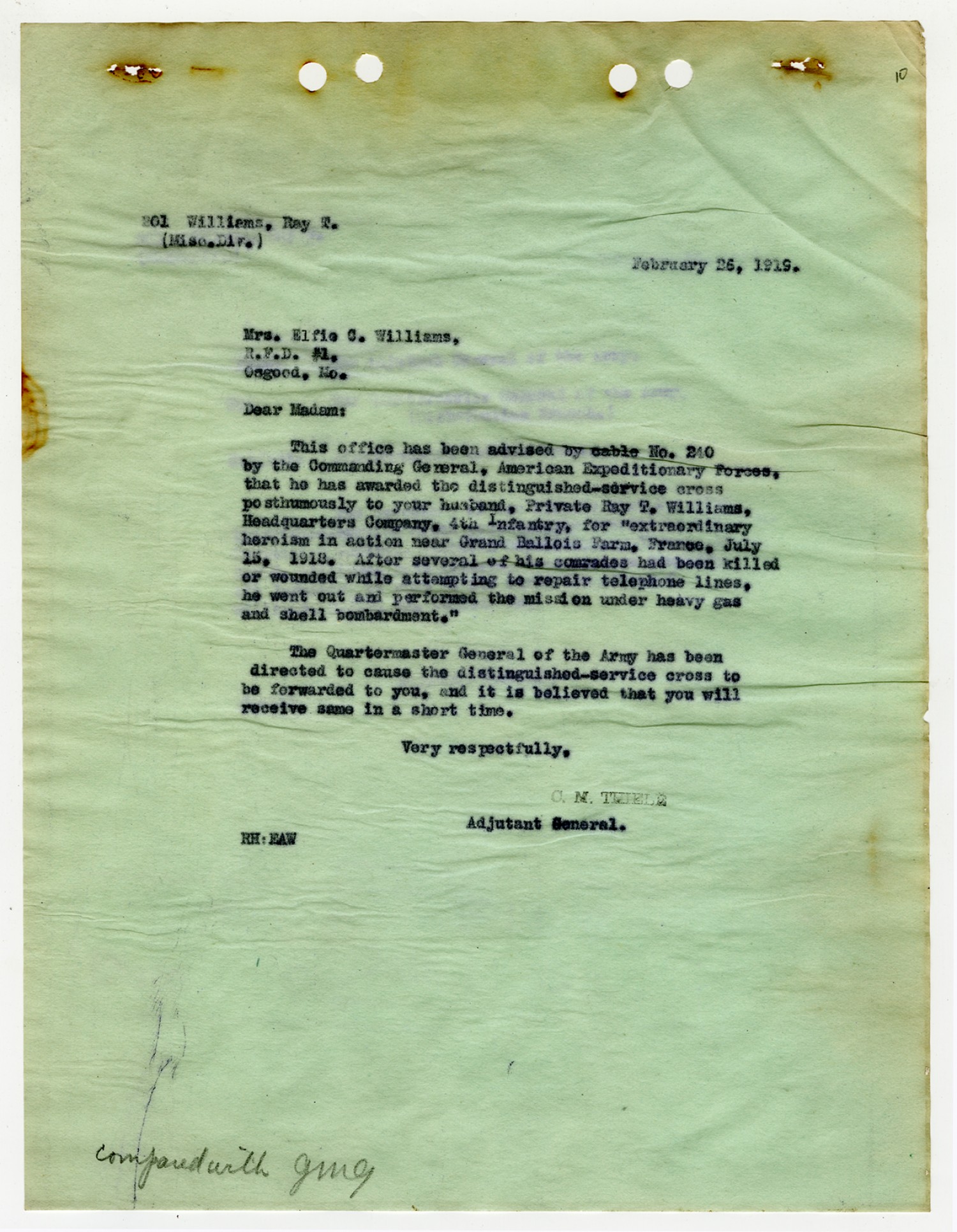 | Description | <p>Personnel record files for Ray T. Williams containing letters and correspondence concerning his Distinguished Service Cross award. Williams served in the Headquarters Company of the 4th Infantry, 3rd Division. He was awarded the Distinguished Service Cross award for heroism in action near Grand Ballois Farm in France on July 15, 1918. Williams later died on October 10, 1918 of the mustard gas wounds he received in July. His Service Cross was presented to his wife Elfie of Osgood, Missouri.</p> |