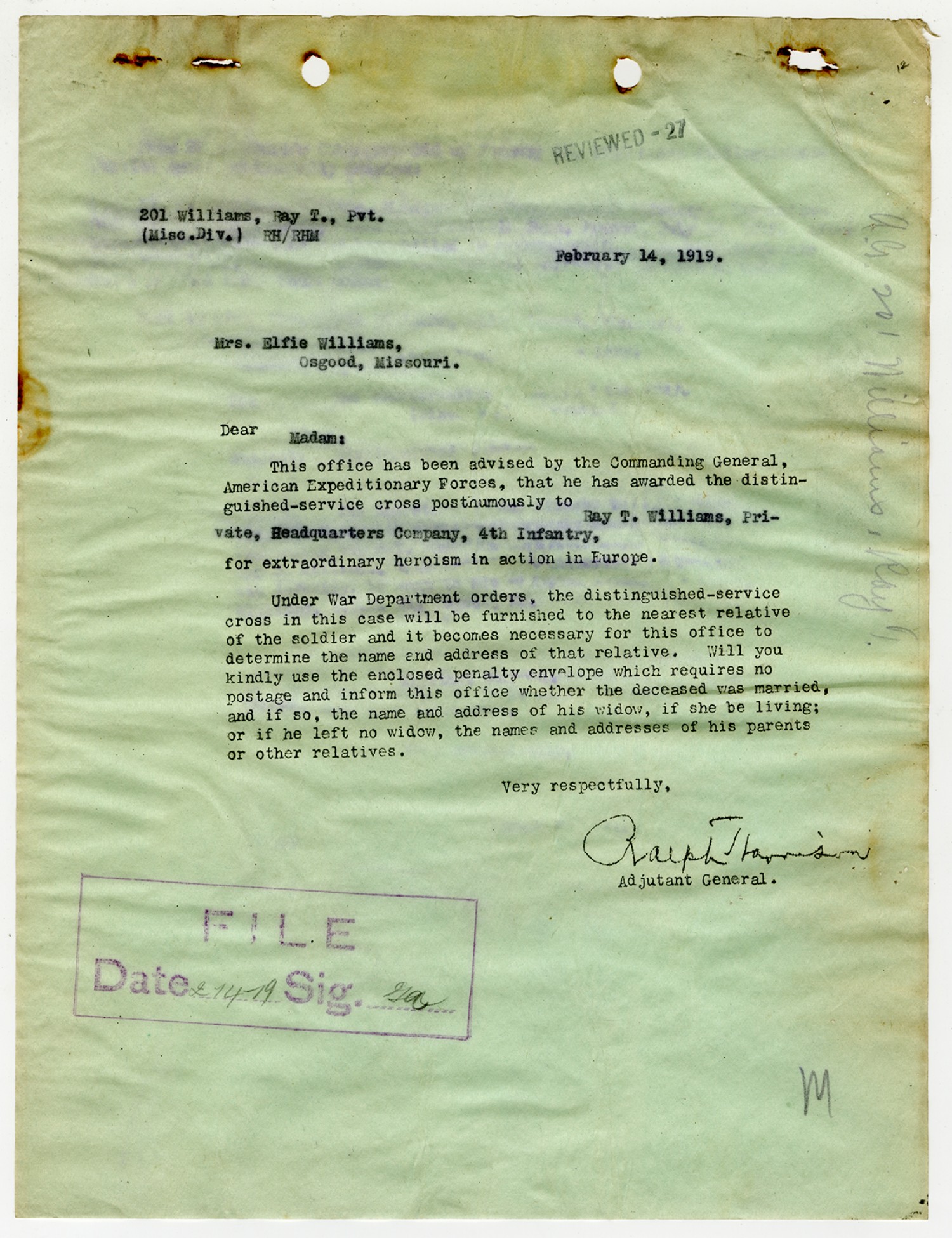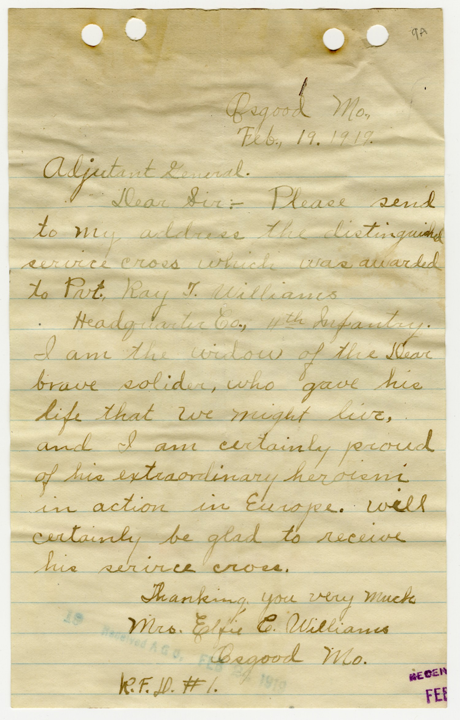 Elfie C. Williams letter to the Adjutant General - February 19, 1919