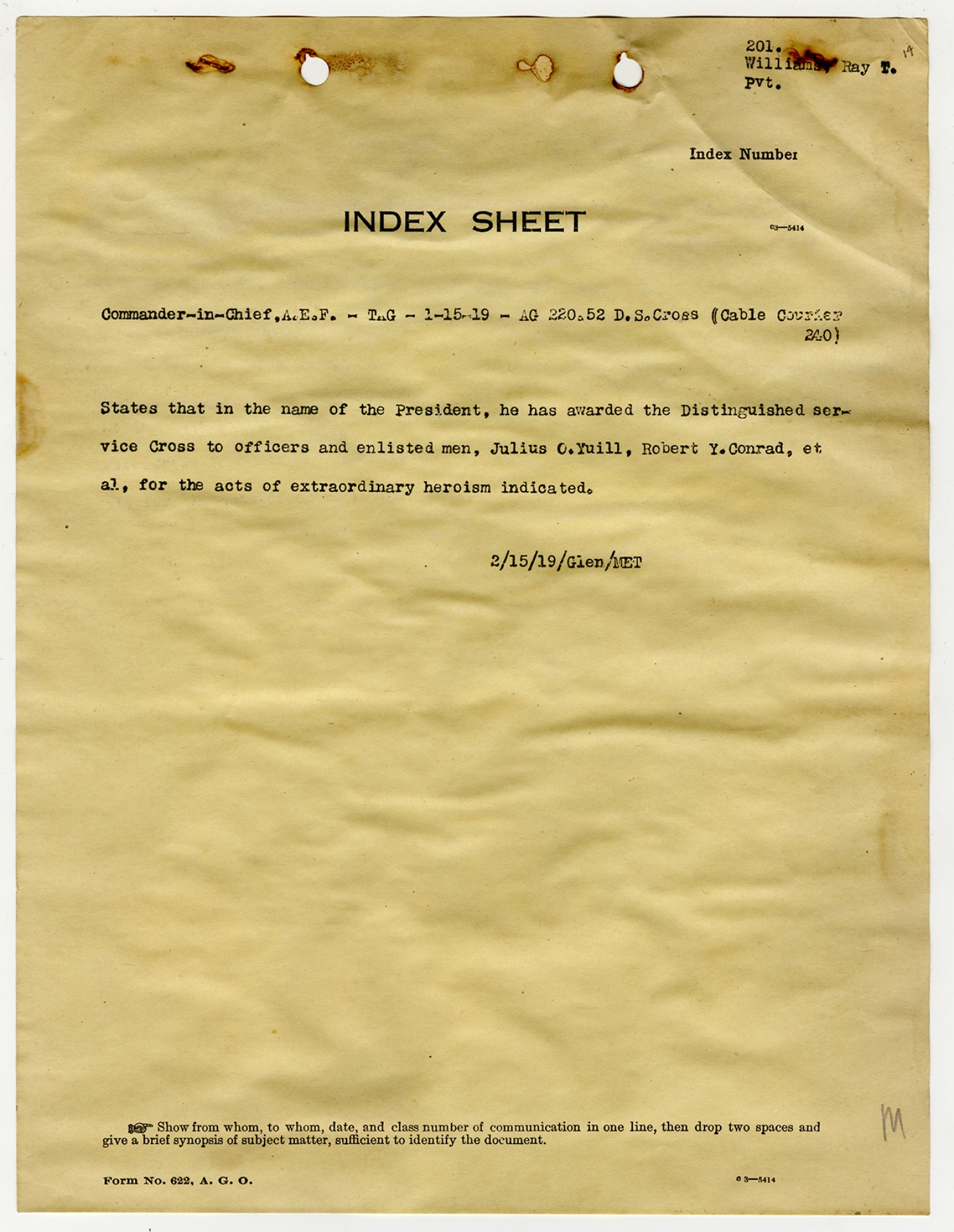 Ray T. Williams Index Sheet - January 11, 1919