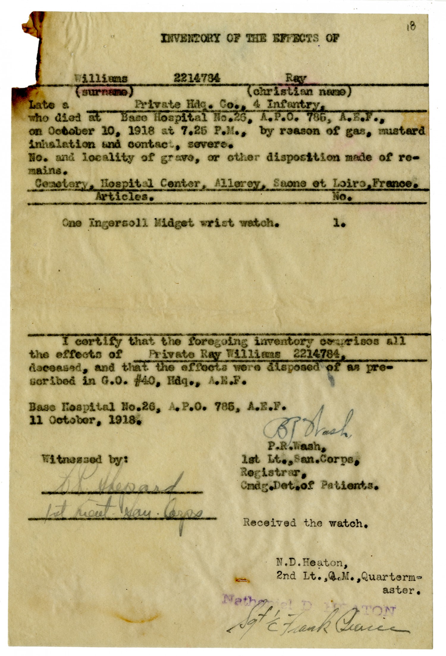 Ray T. Williams inventory of Effects - October 11, 1918