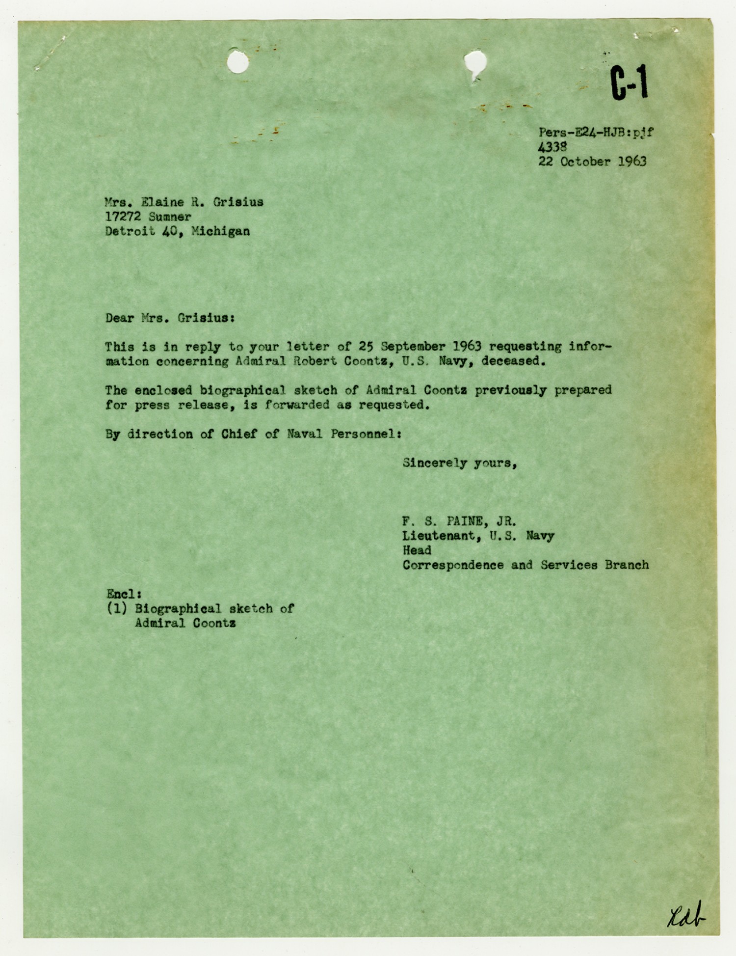 F.S. Paine letter to Elaine R. Grisius - October 22, 1963