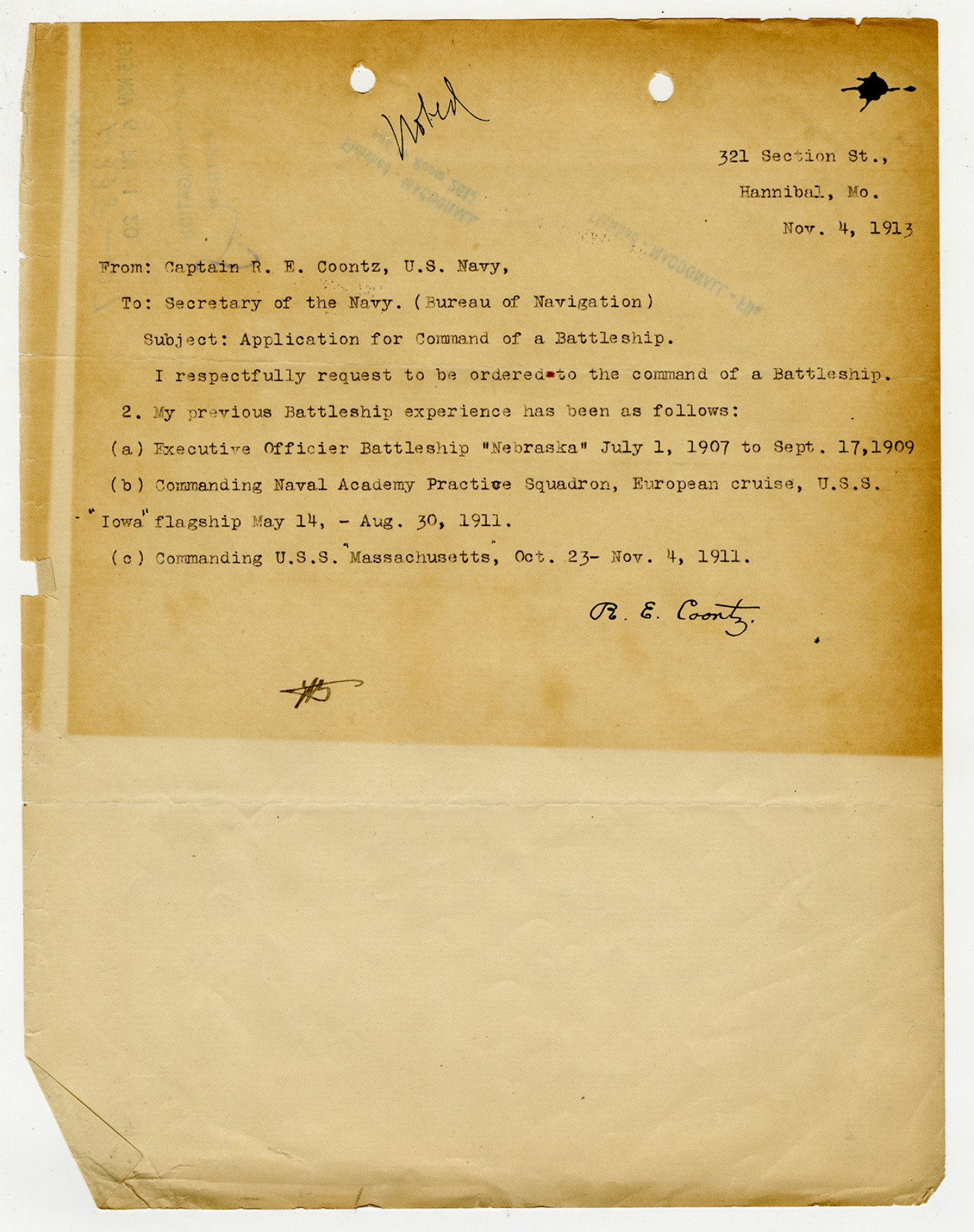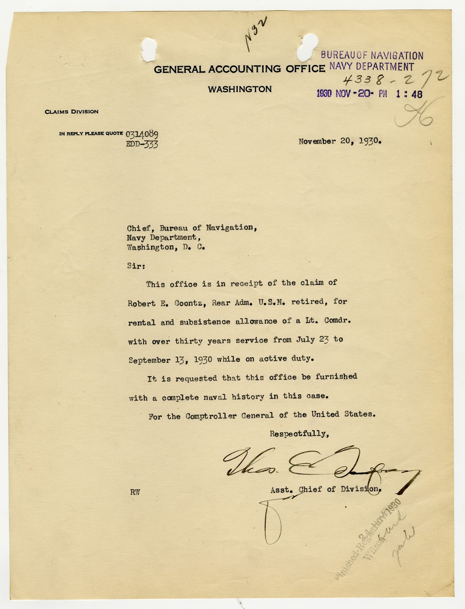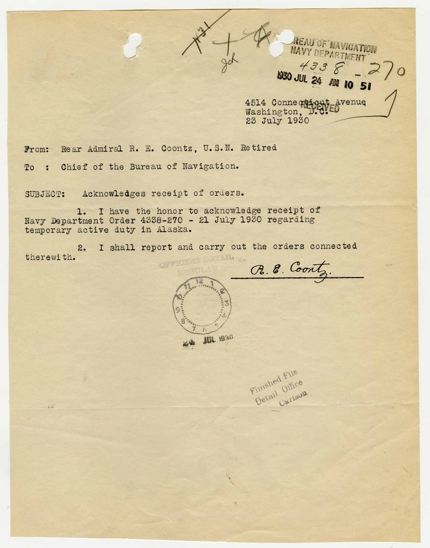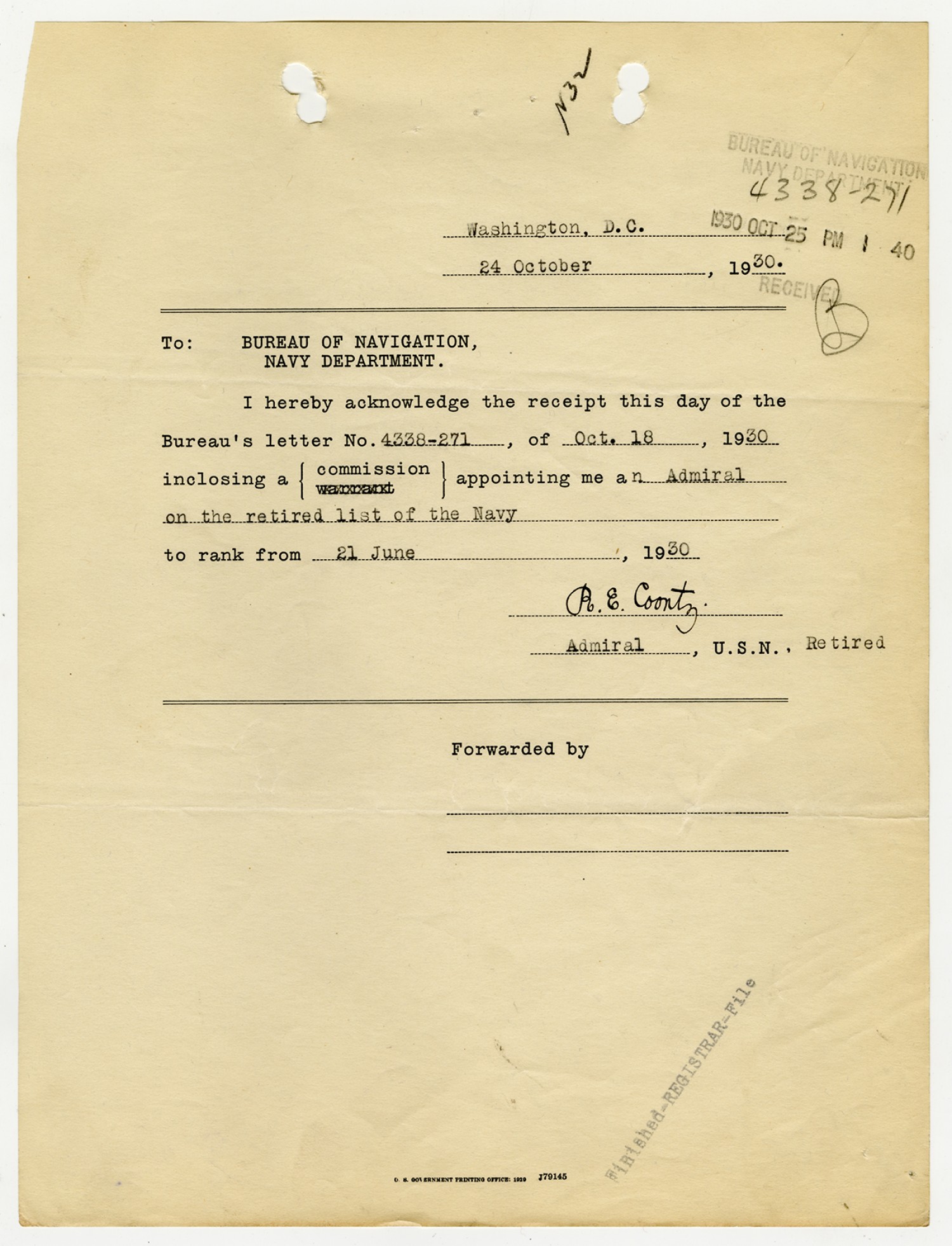 Robert E. Coontz letter to the Bureau of Navigation - October 24, 1930