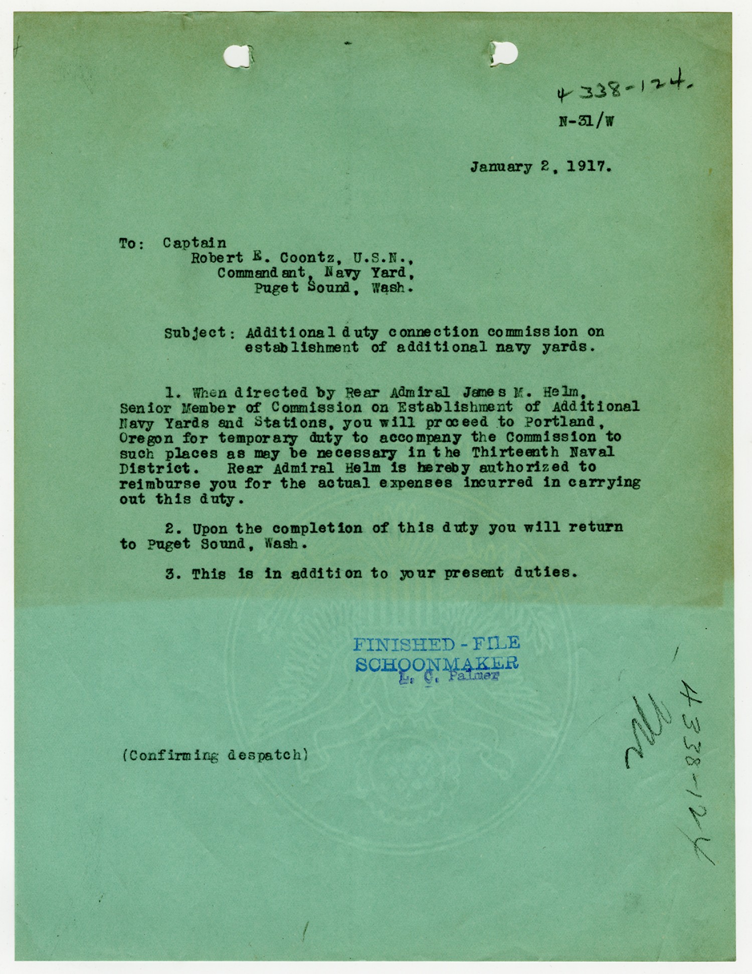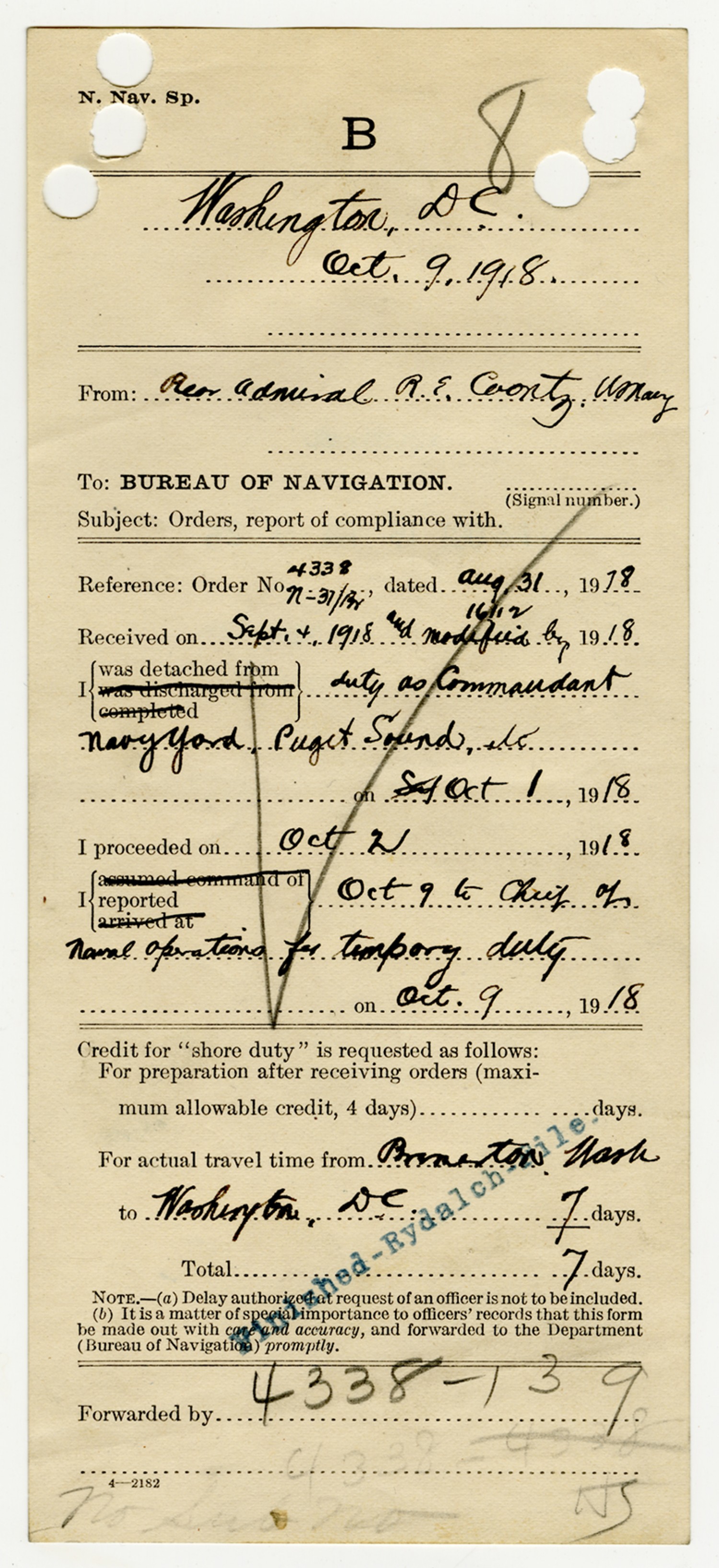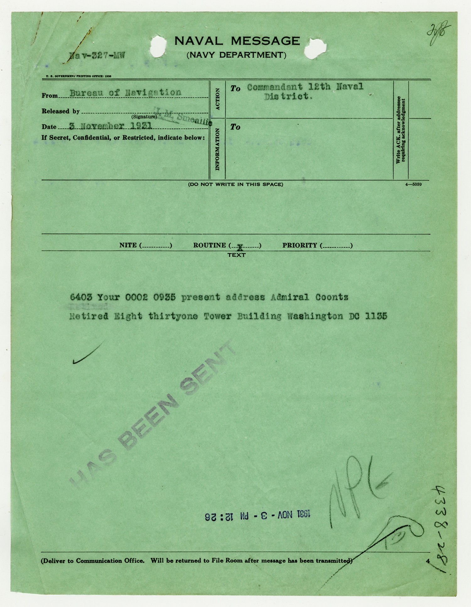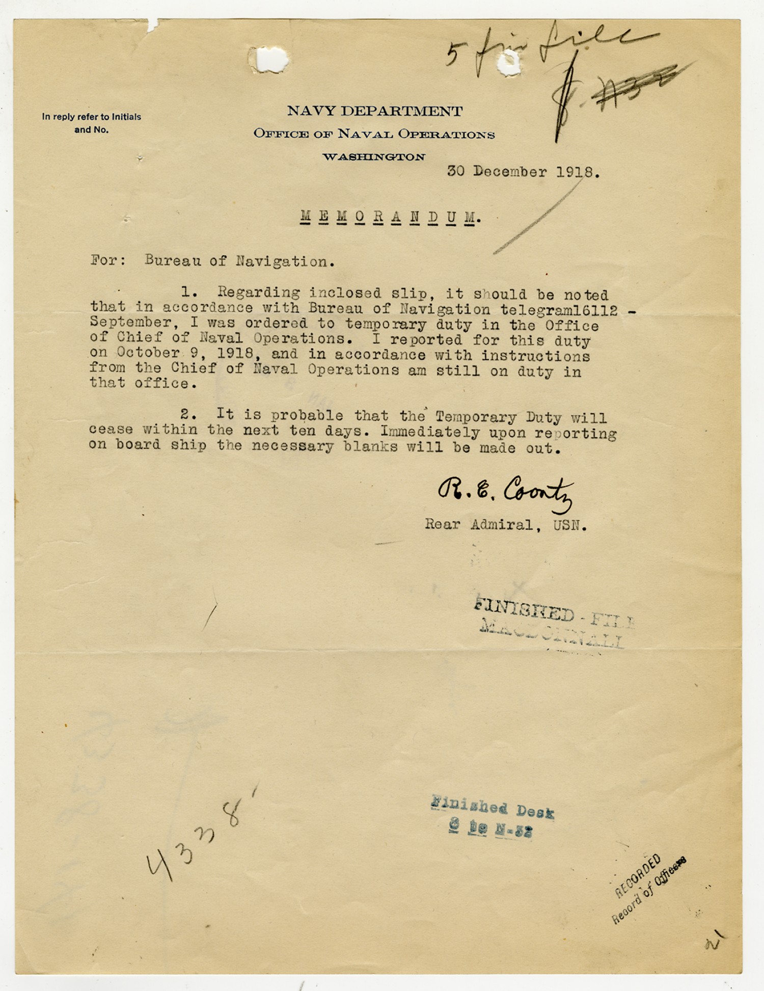 Robert E. Coontz letter to the Bureau of Navigation - October 24, 1930