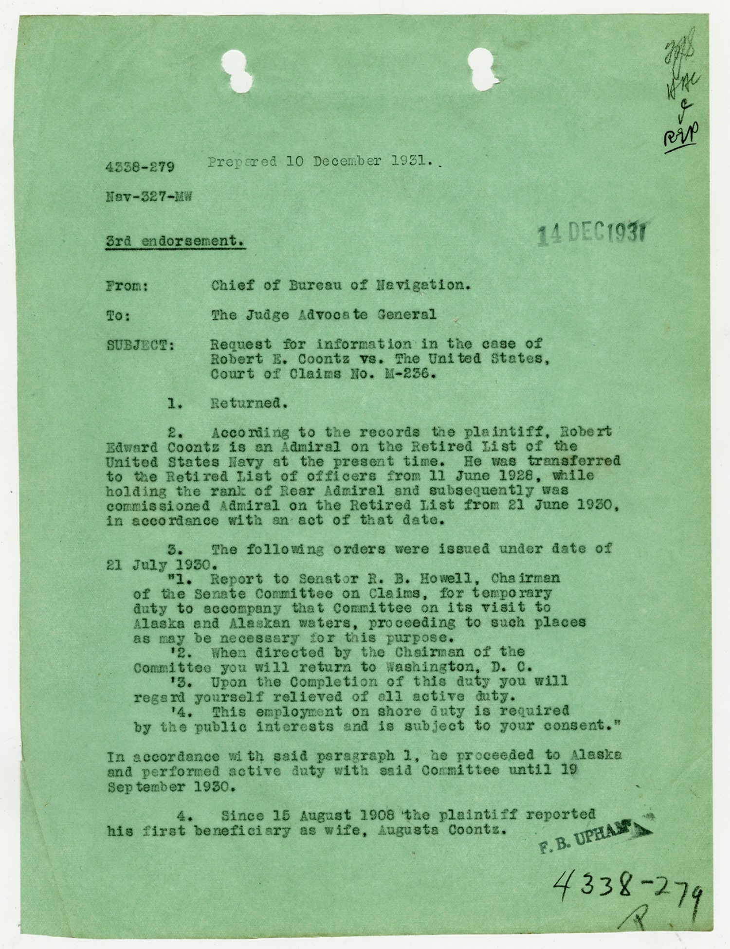F.B. Upham letter to the Judge Advocate General - December 10, 1931