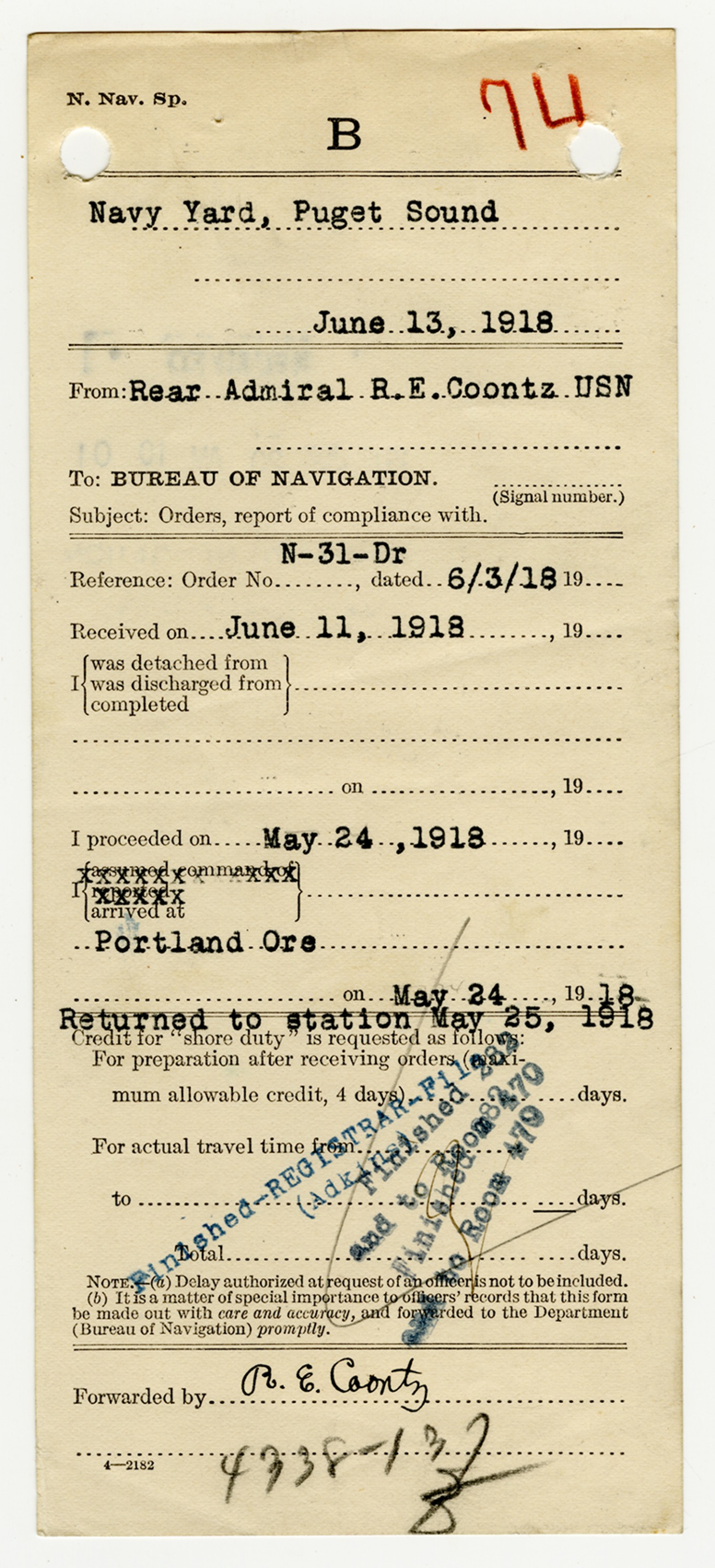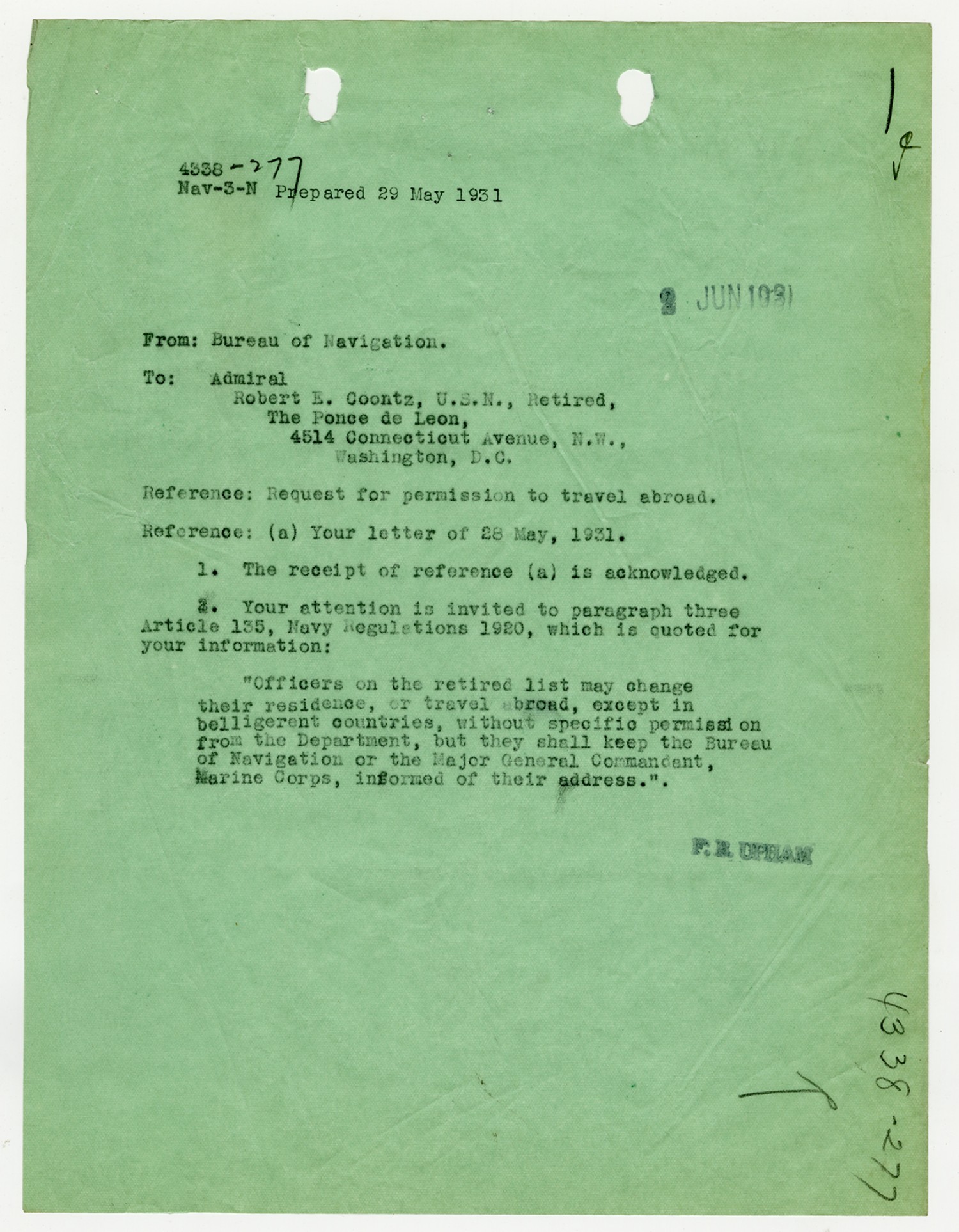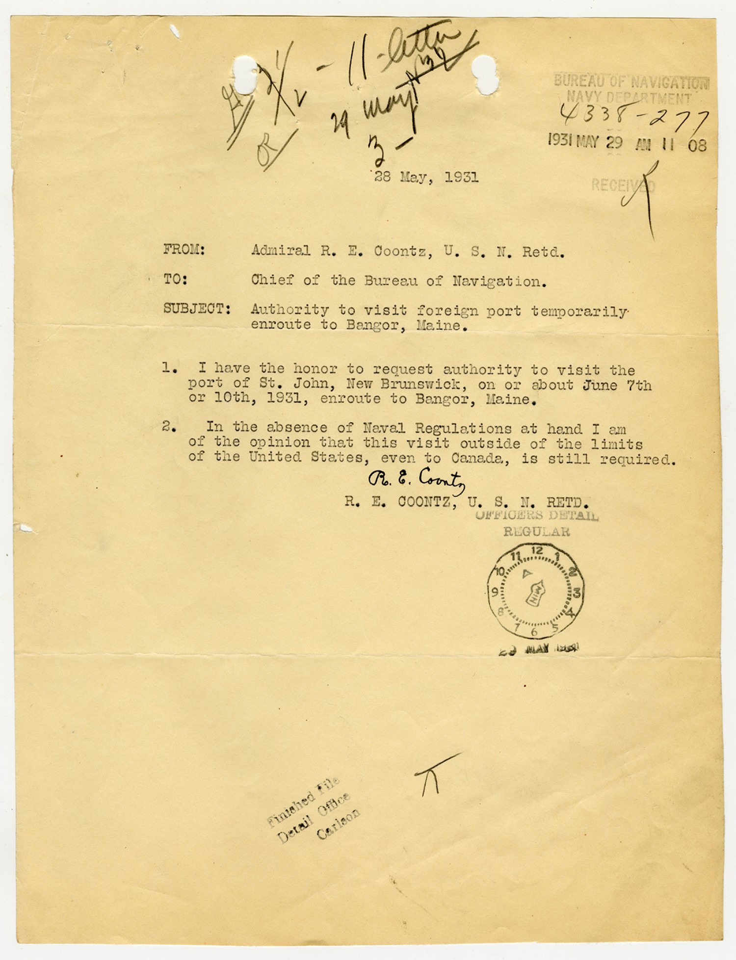 Robert E. Coontz letter to the Chief of the Bureau of Navigation - May 28, 1931