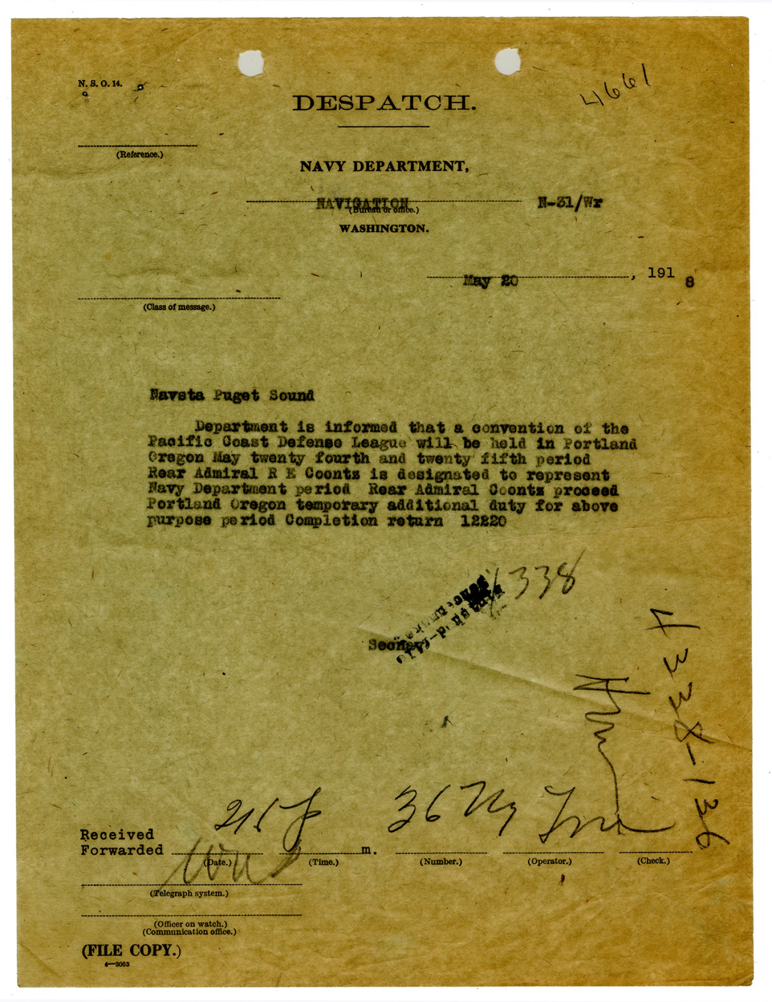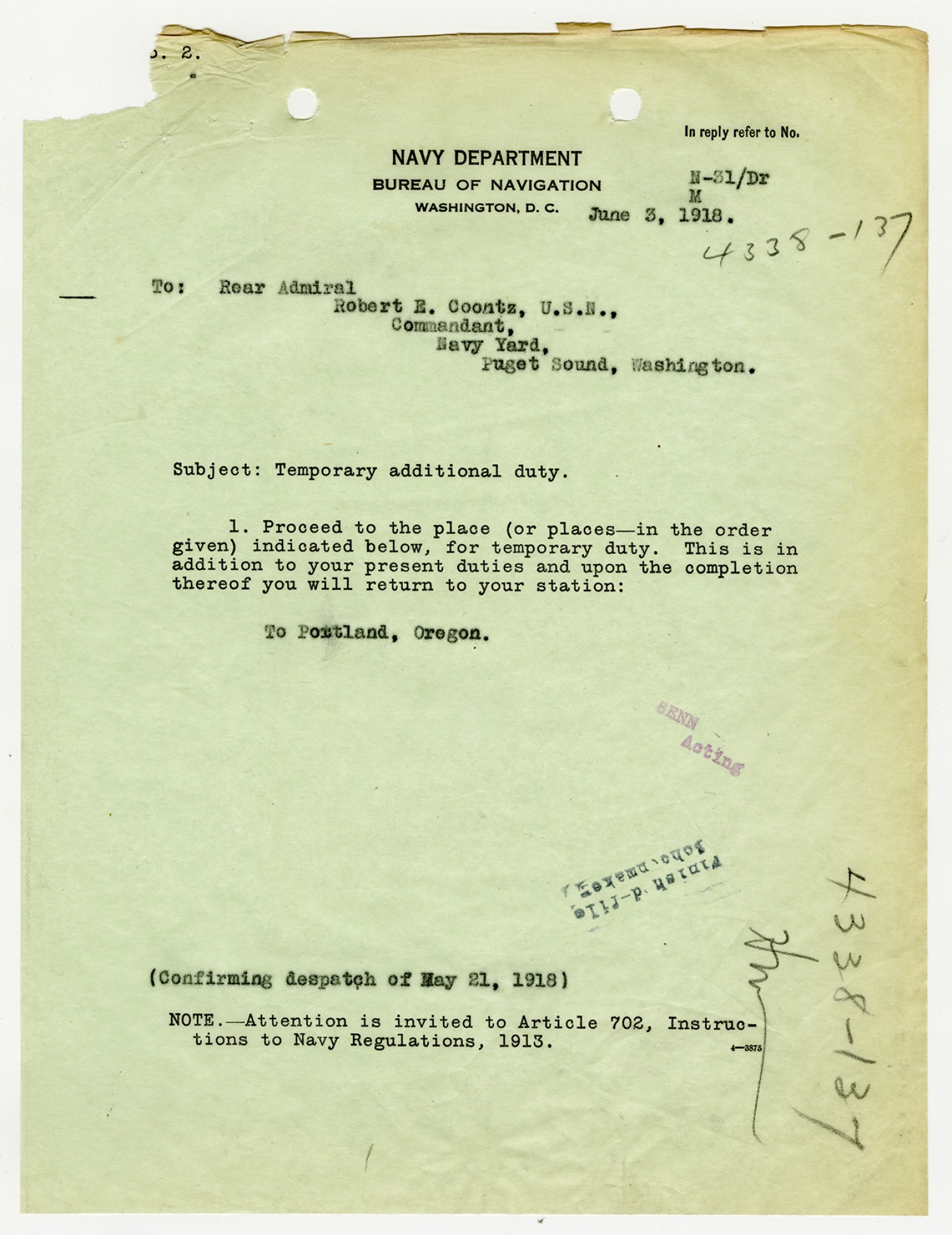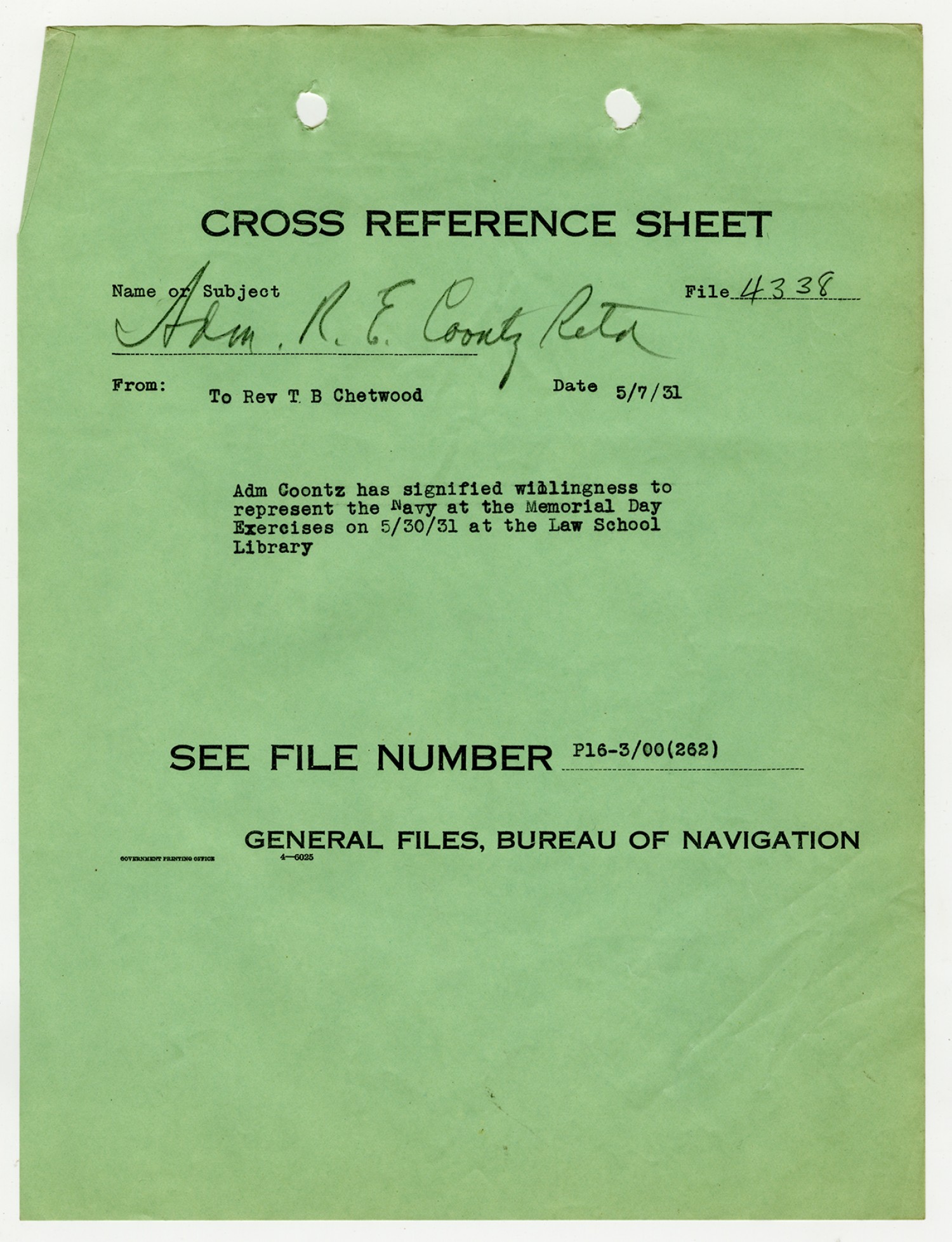 Robert E. Coontz letter to the Chief of the Bureau of Navigation - May 28, 1931
