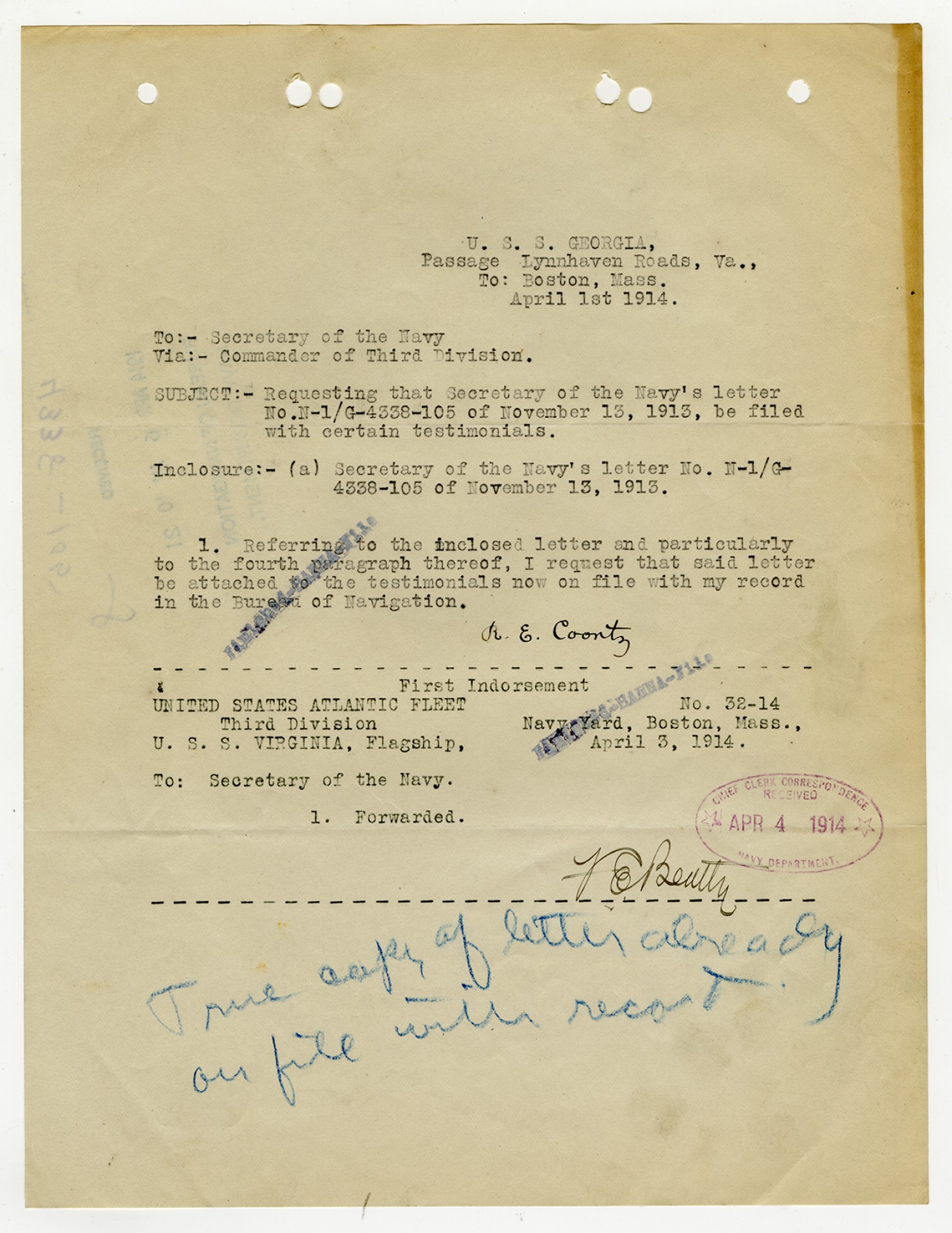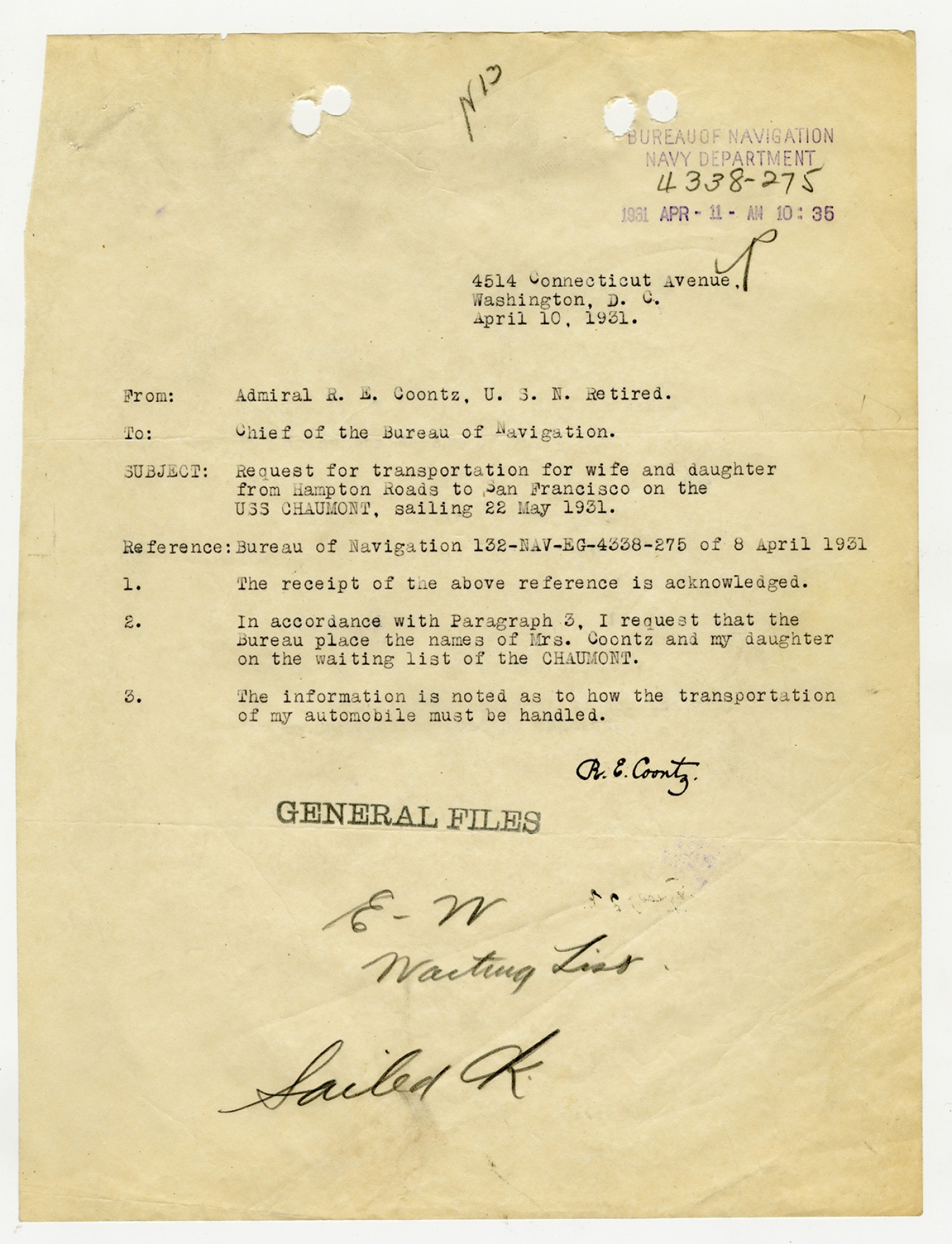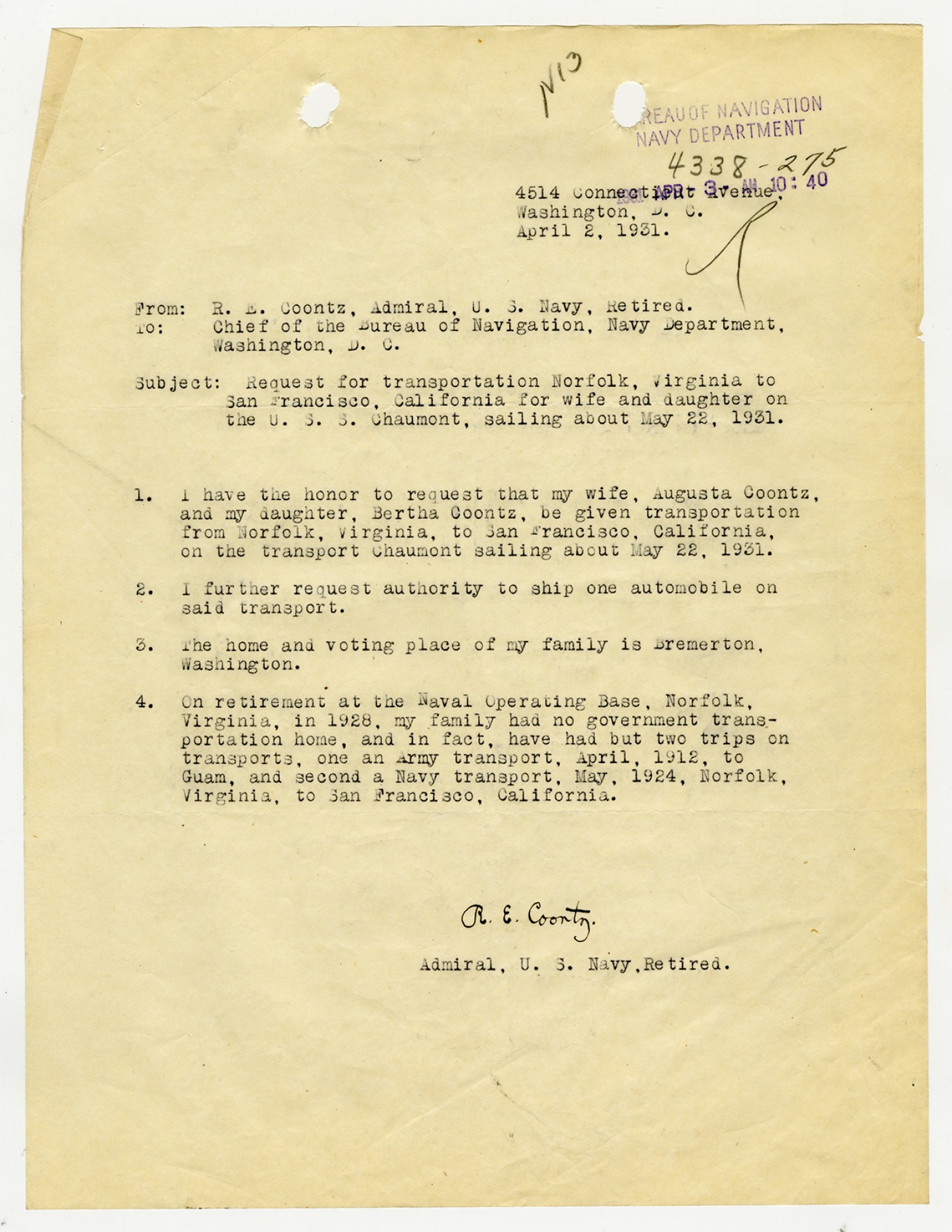 Robert E. Coontz letter to the Chief of the Bureau of Navigation - April 10, 1931