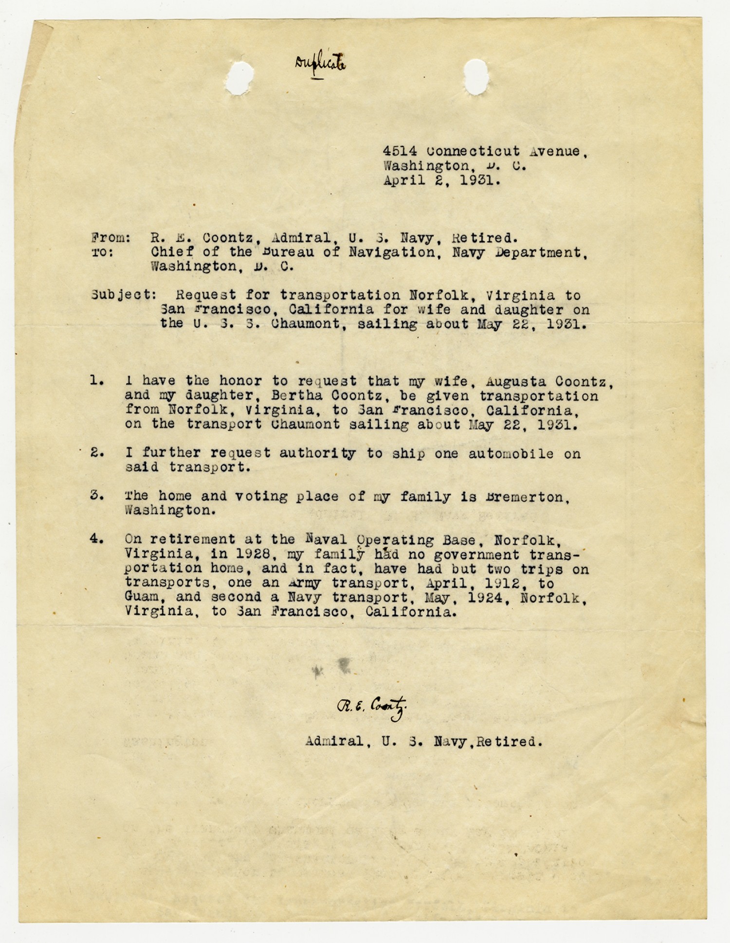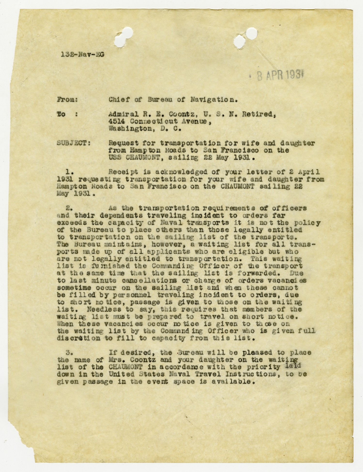 Robert E. Coontz letter to the Chief of the Bureau of Navigation - April 2, 1931