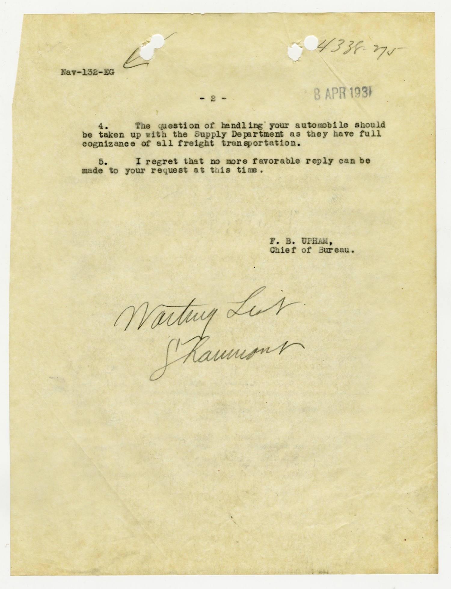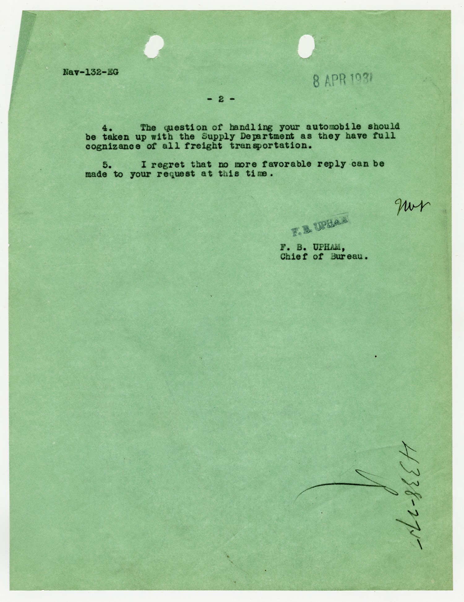 F.B. Upham letter to Robert Coontz - April 8, 1931
