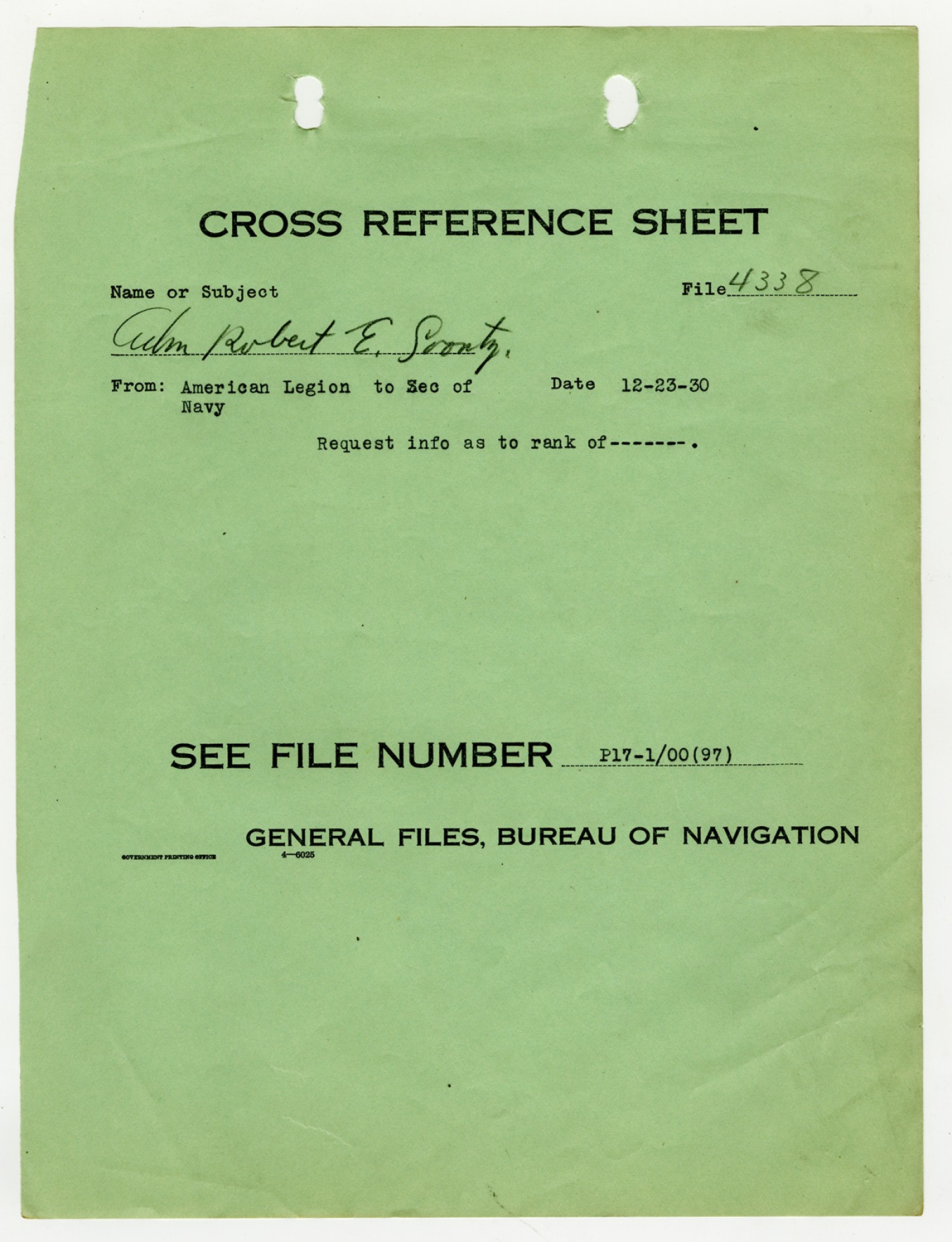 Cross Reference Sheet to the Secretary of the Navy - December 23, 1930