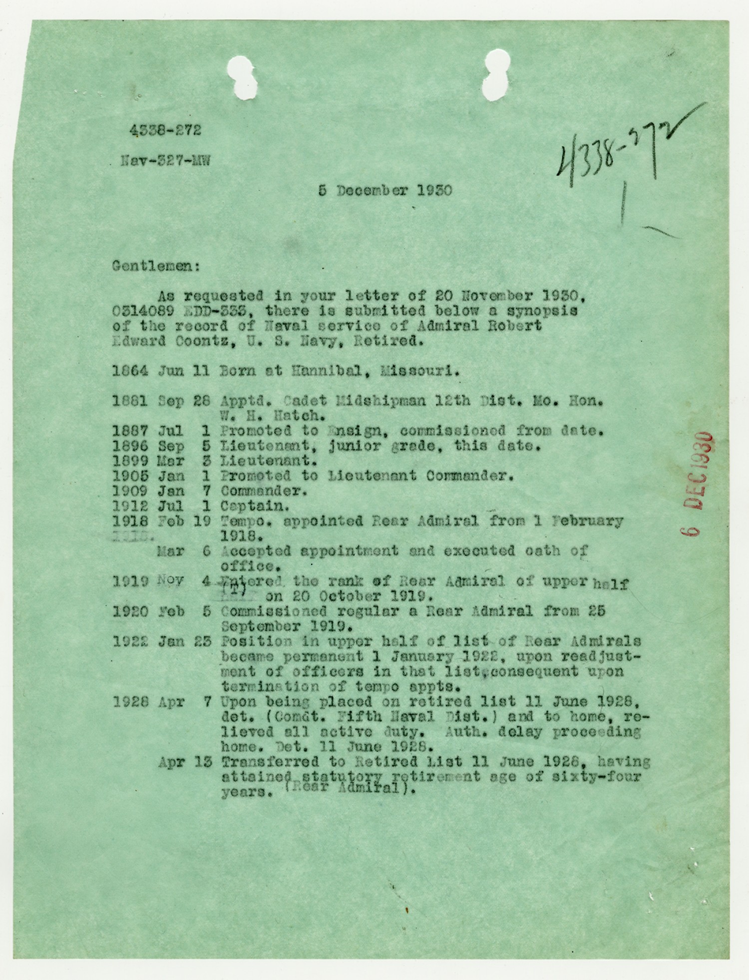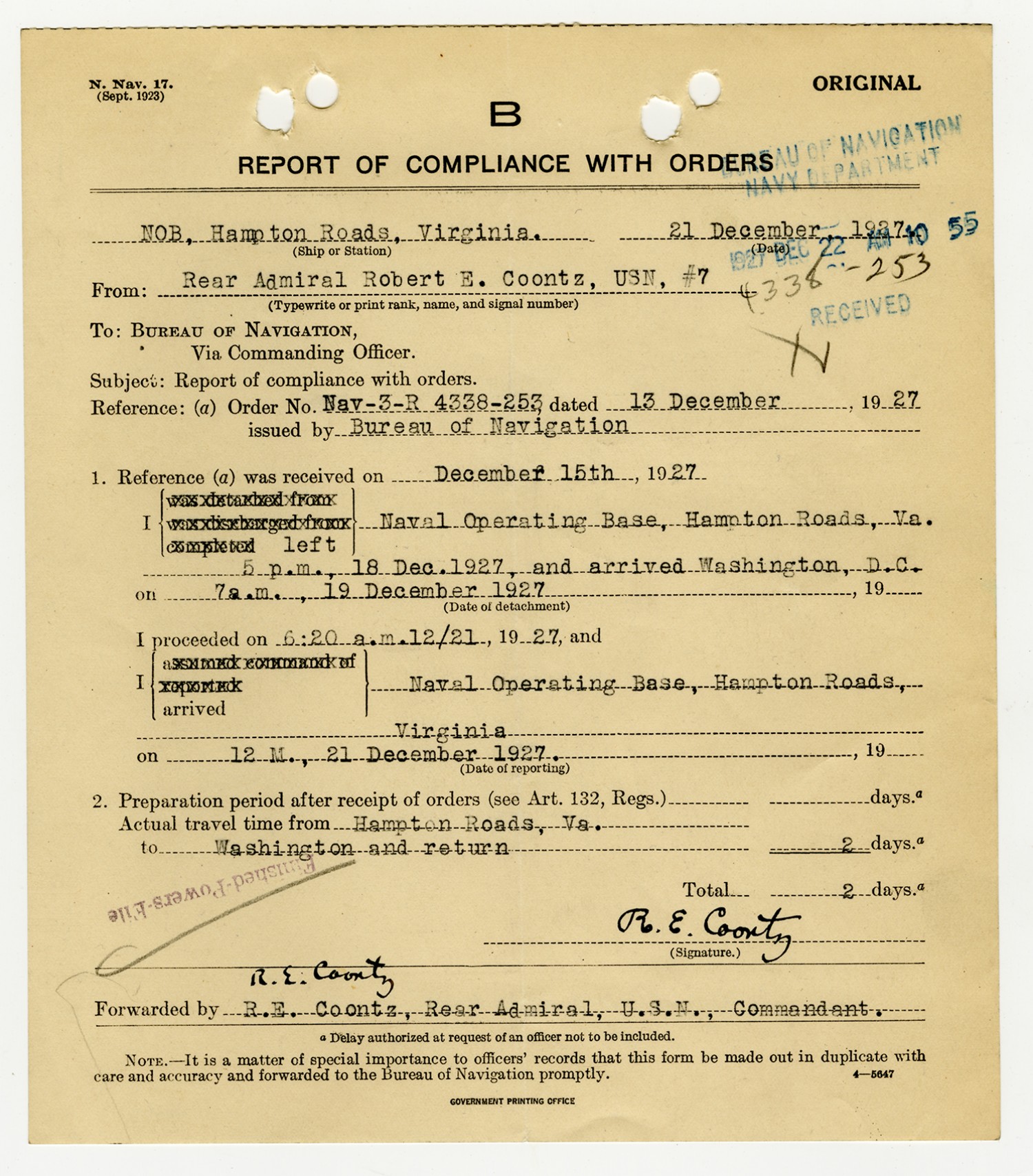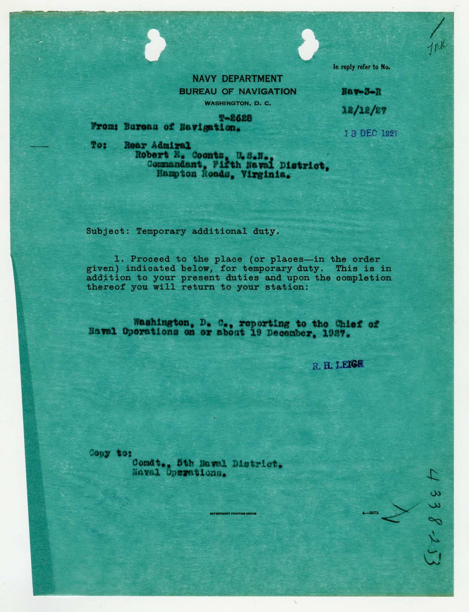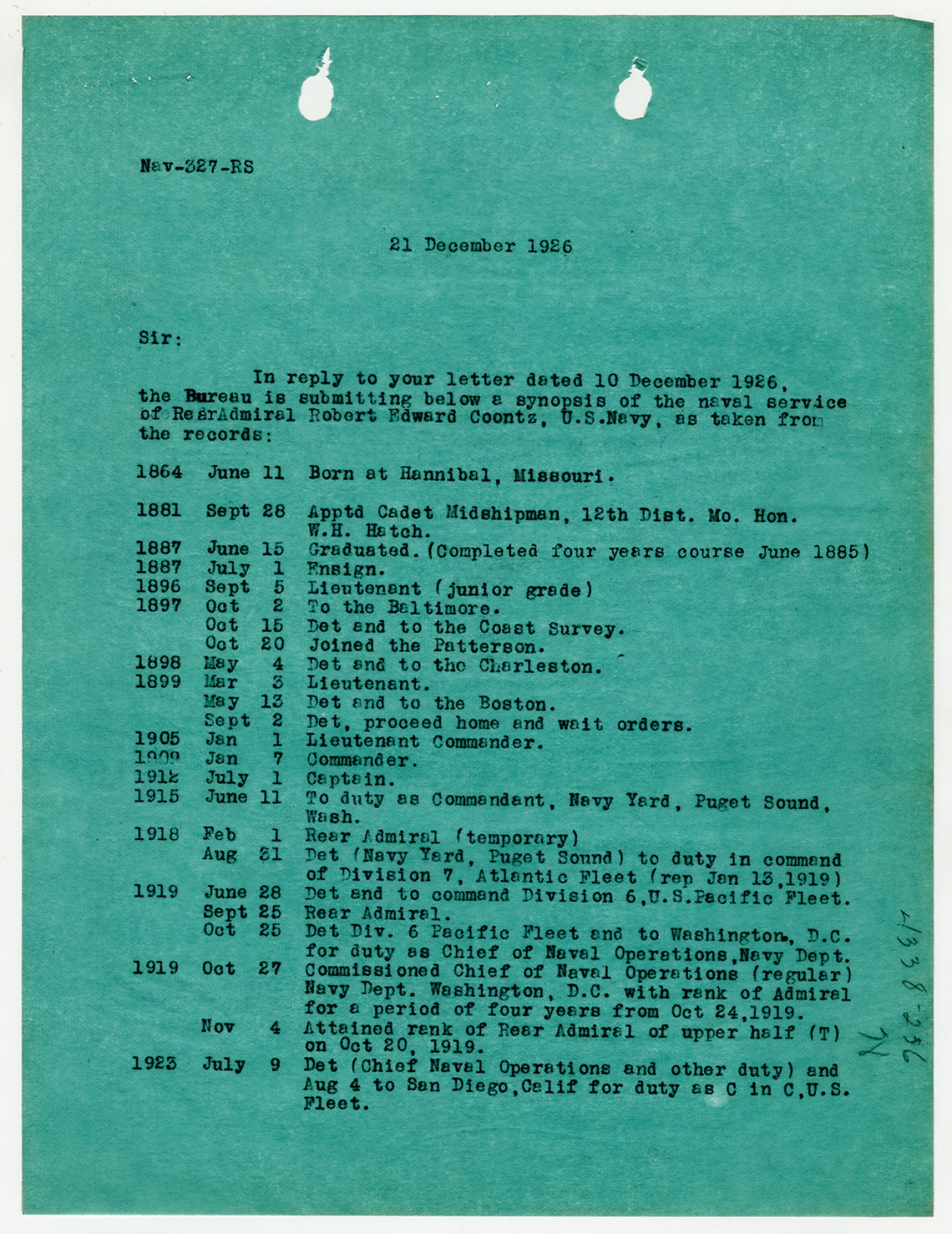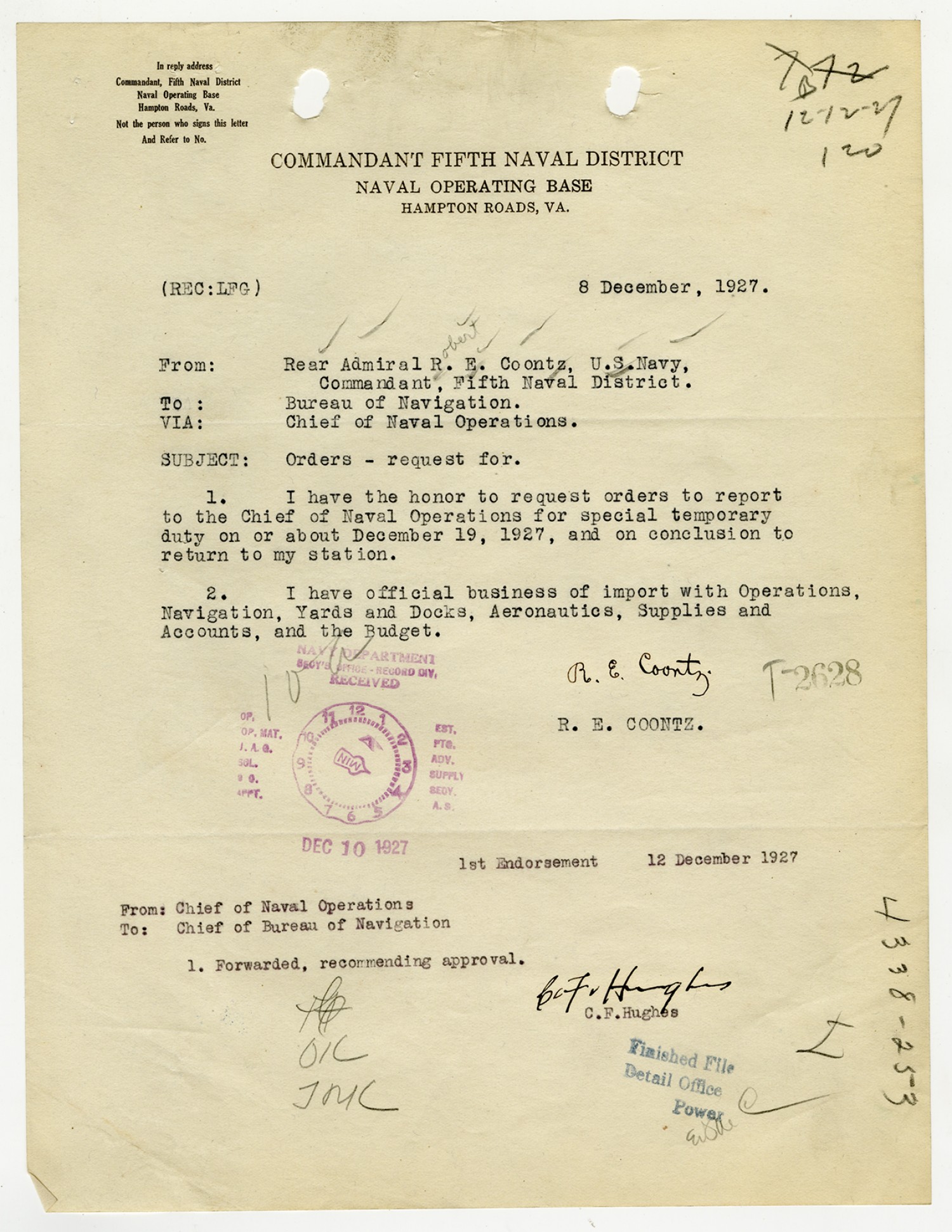 Robert E. Coontz letter to the Bureau of Navigation - December 8, 1927