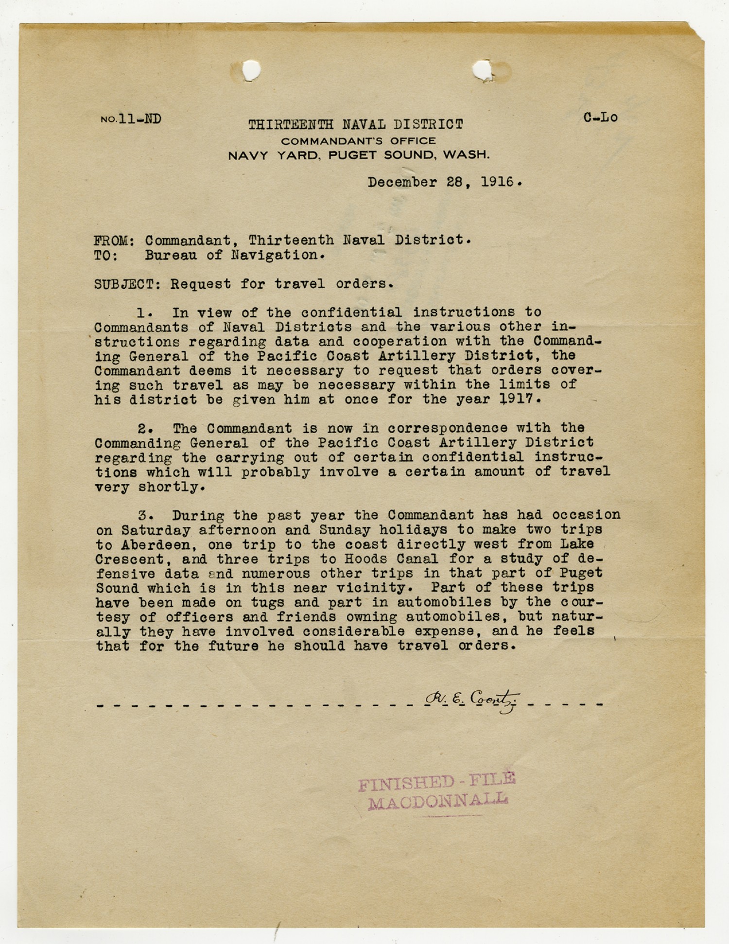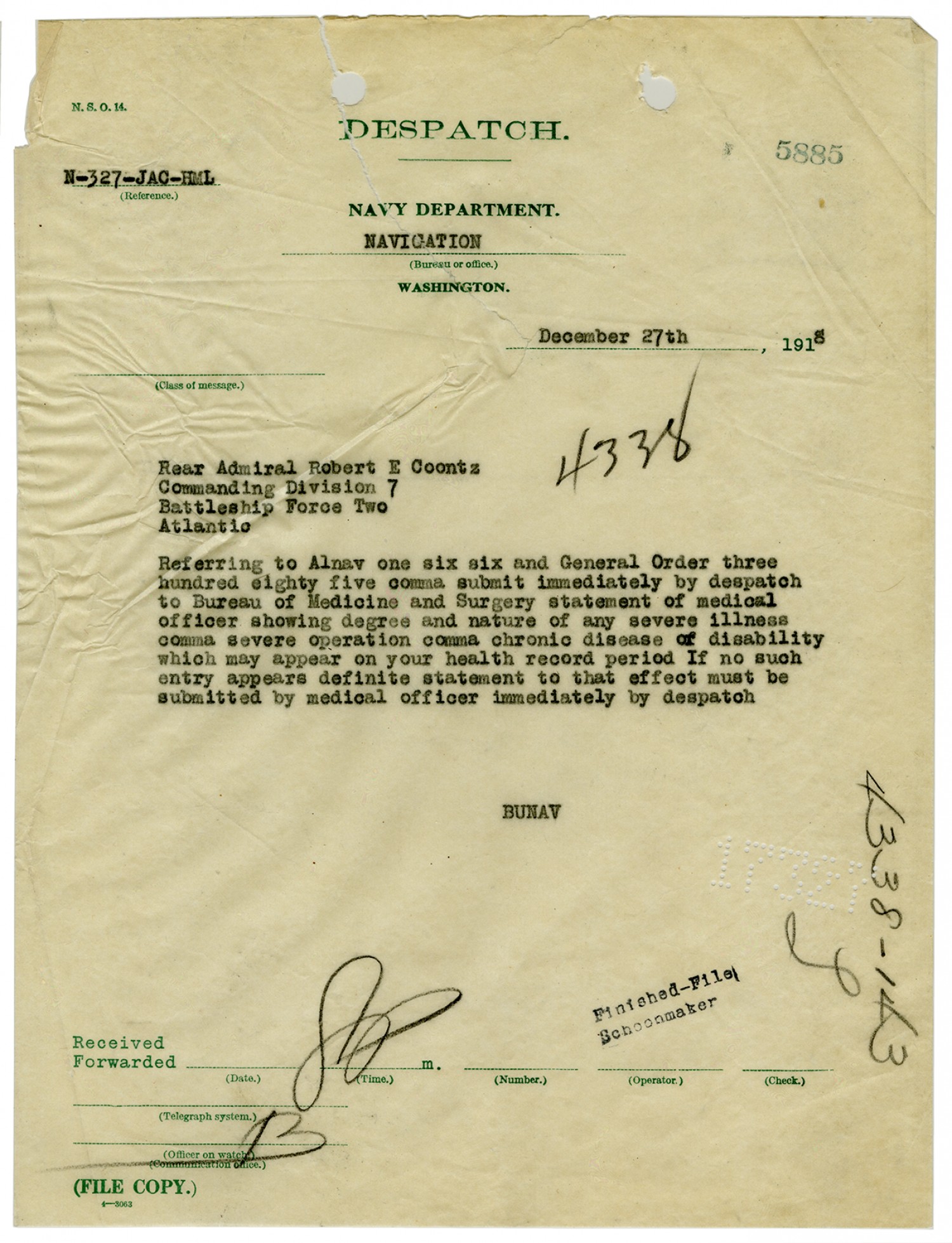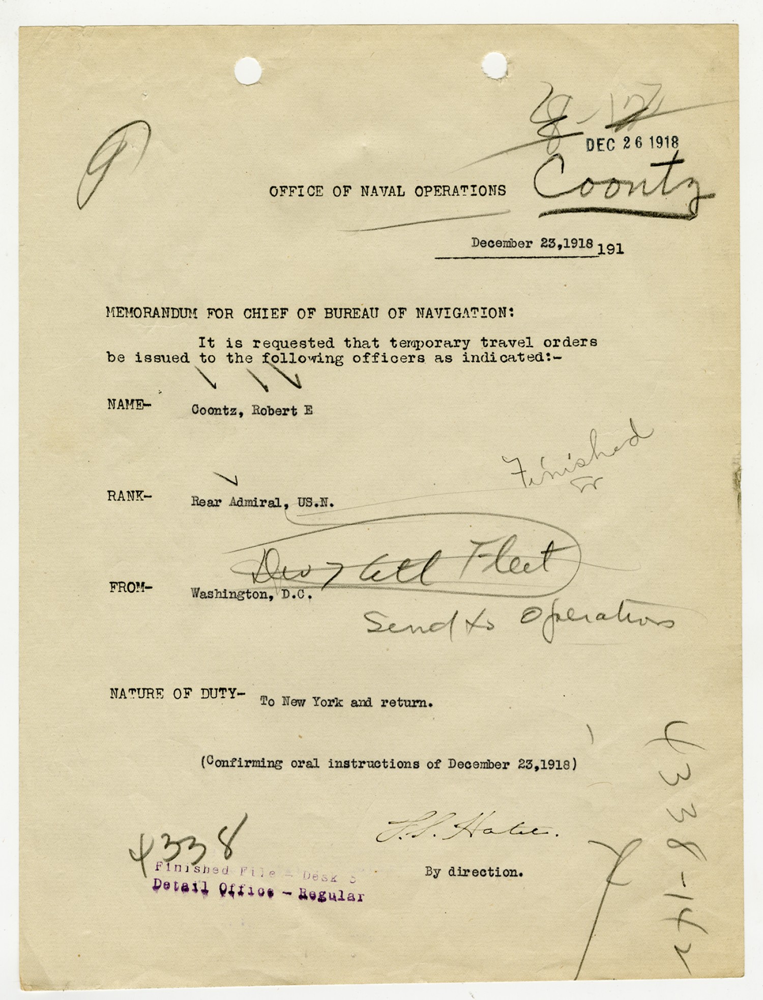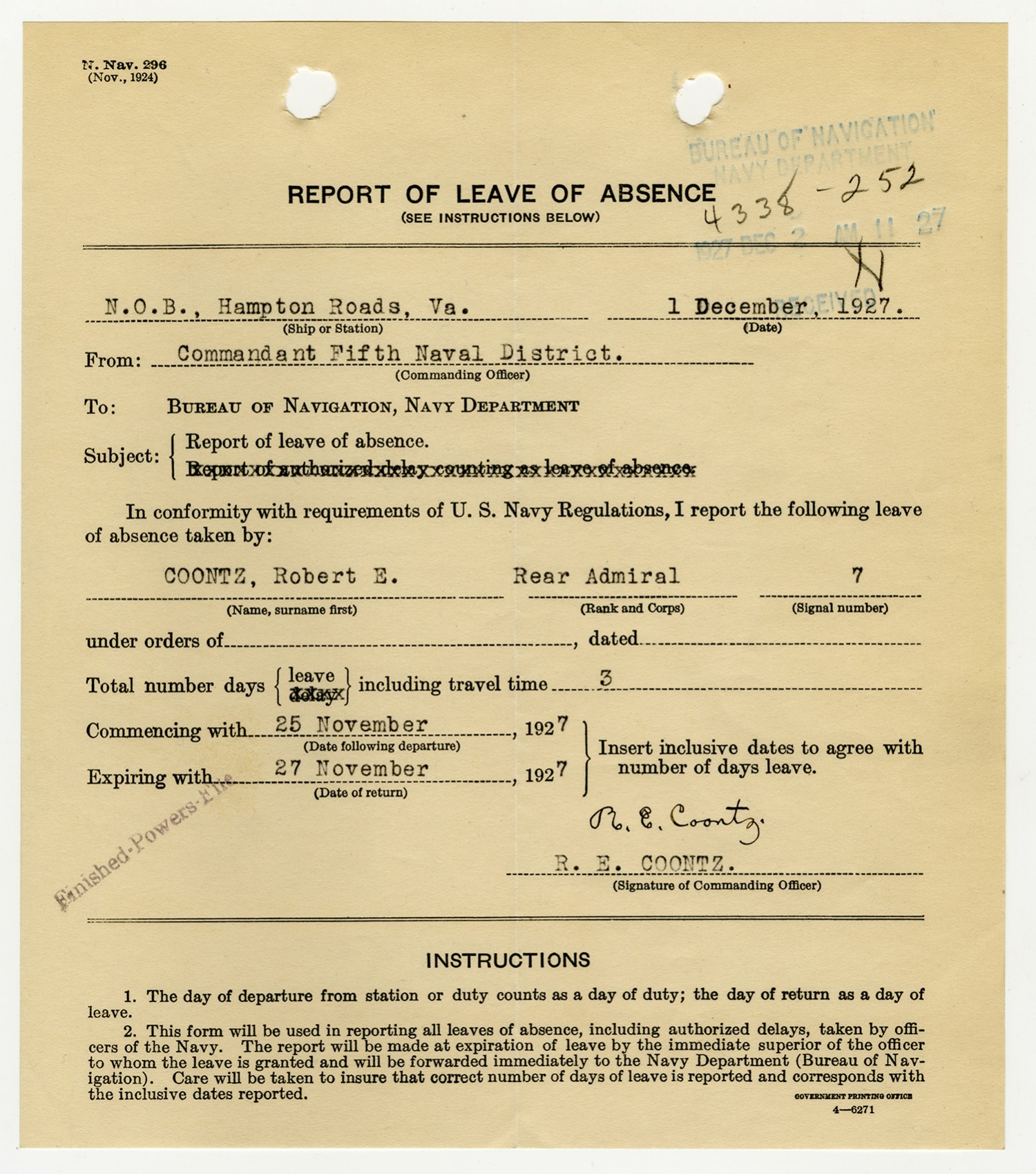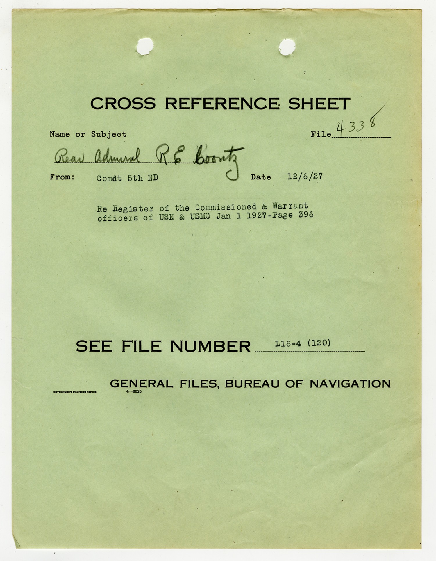 Robert E. Coontz letter to the Bureau of Navigation - December 8, 1927