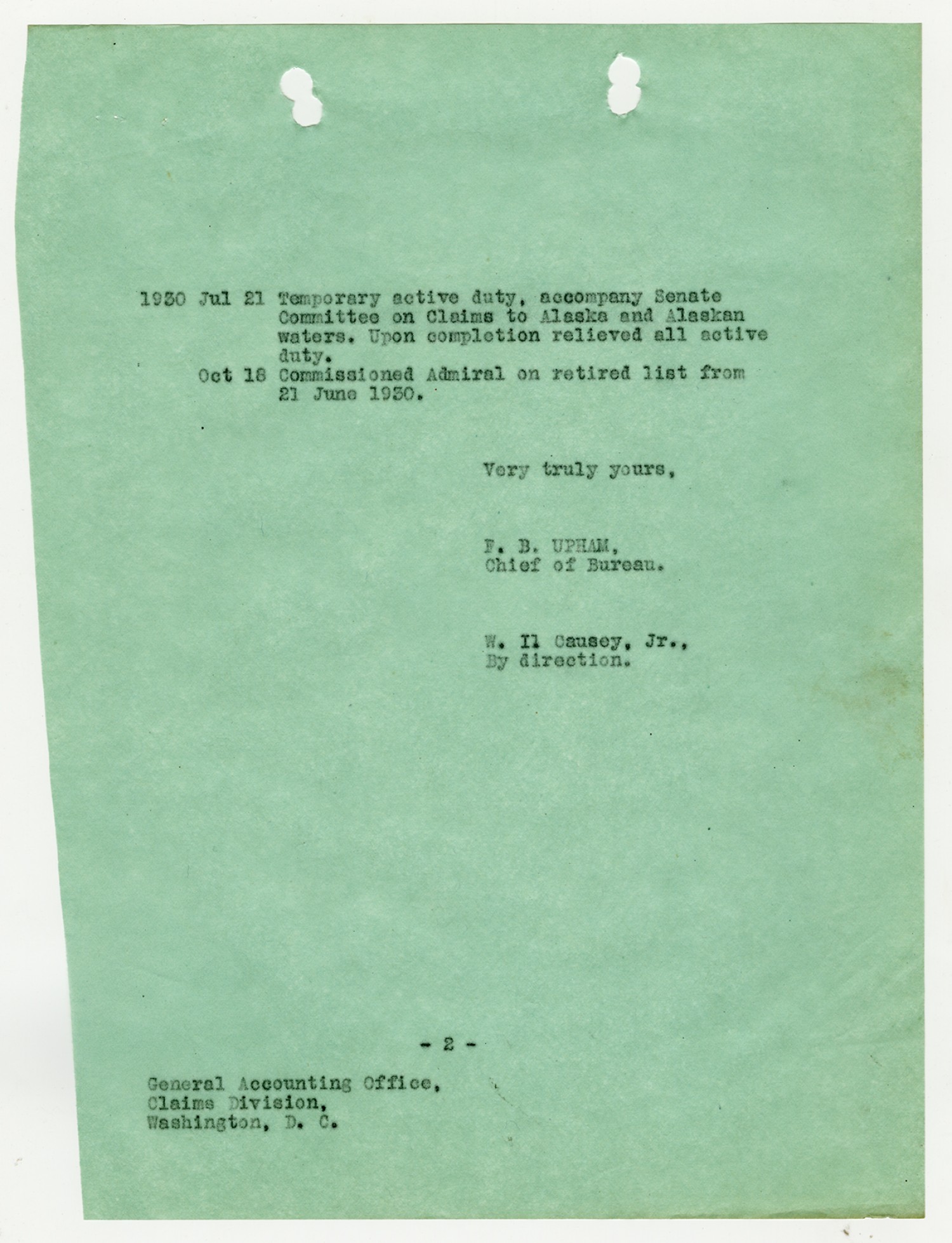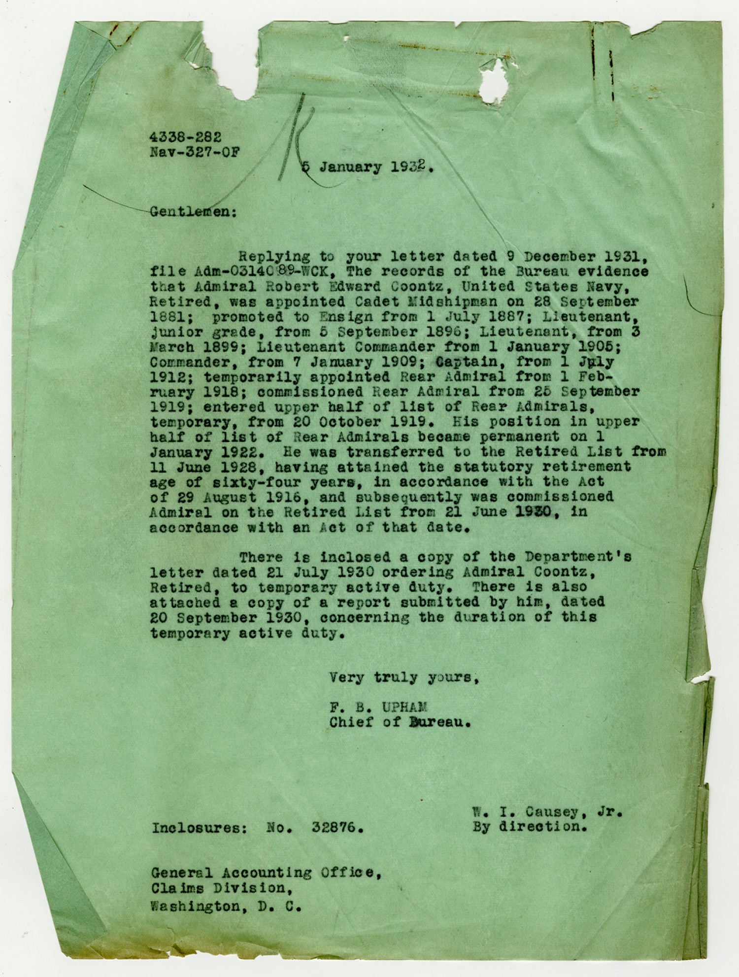 F.B. Upham letter to the General Accounting Office - January 5, 1932