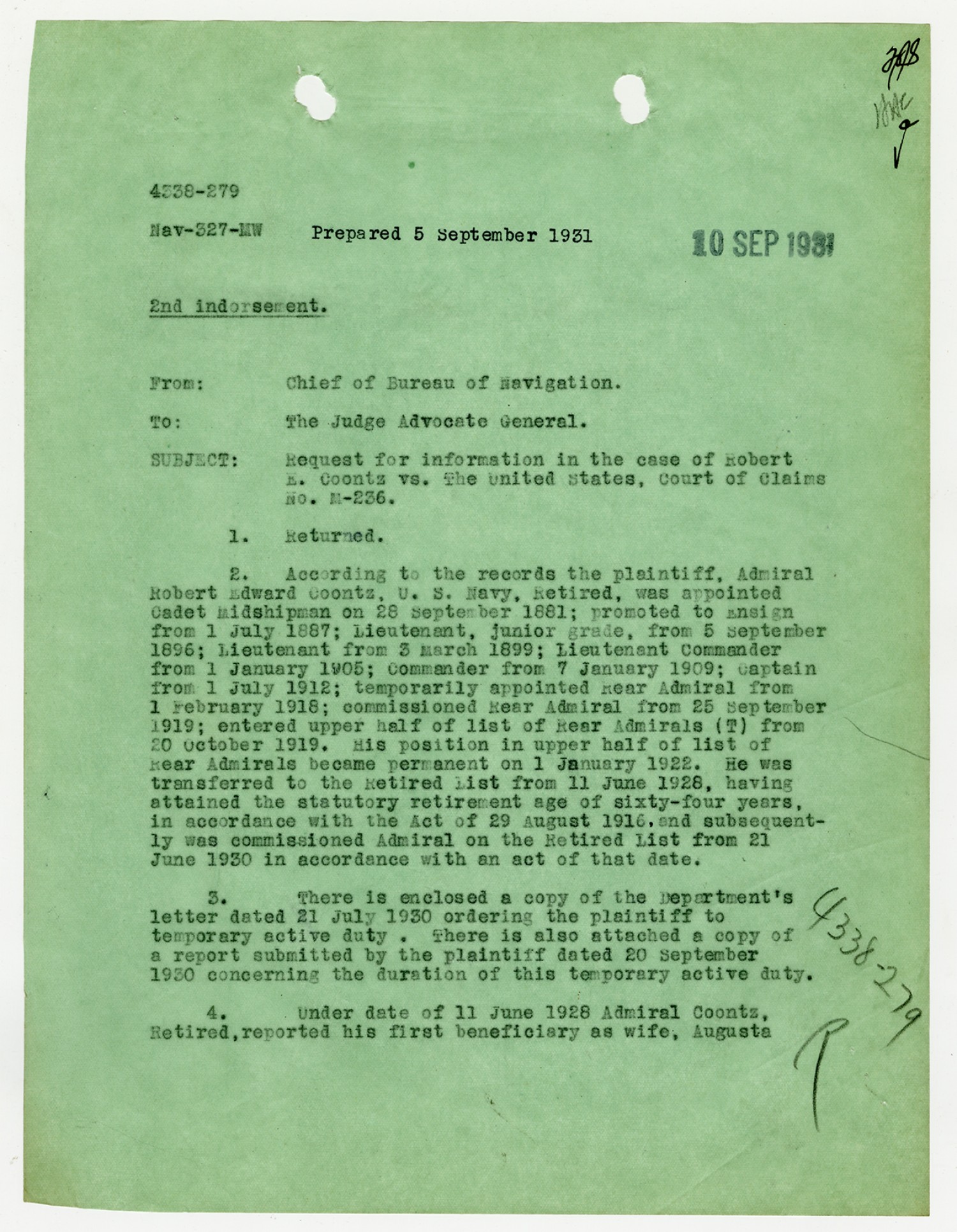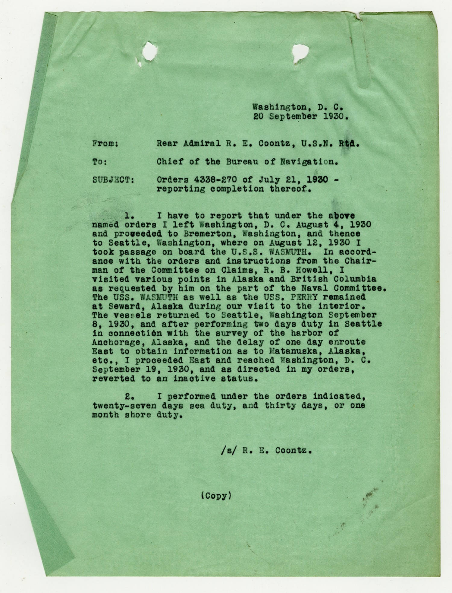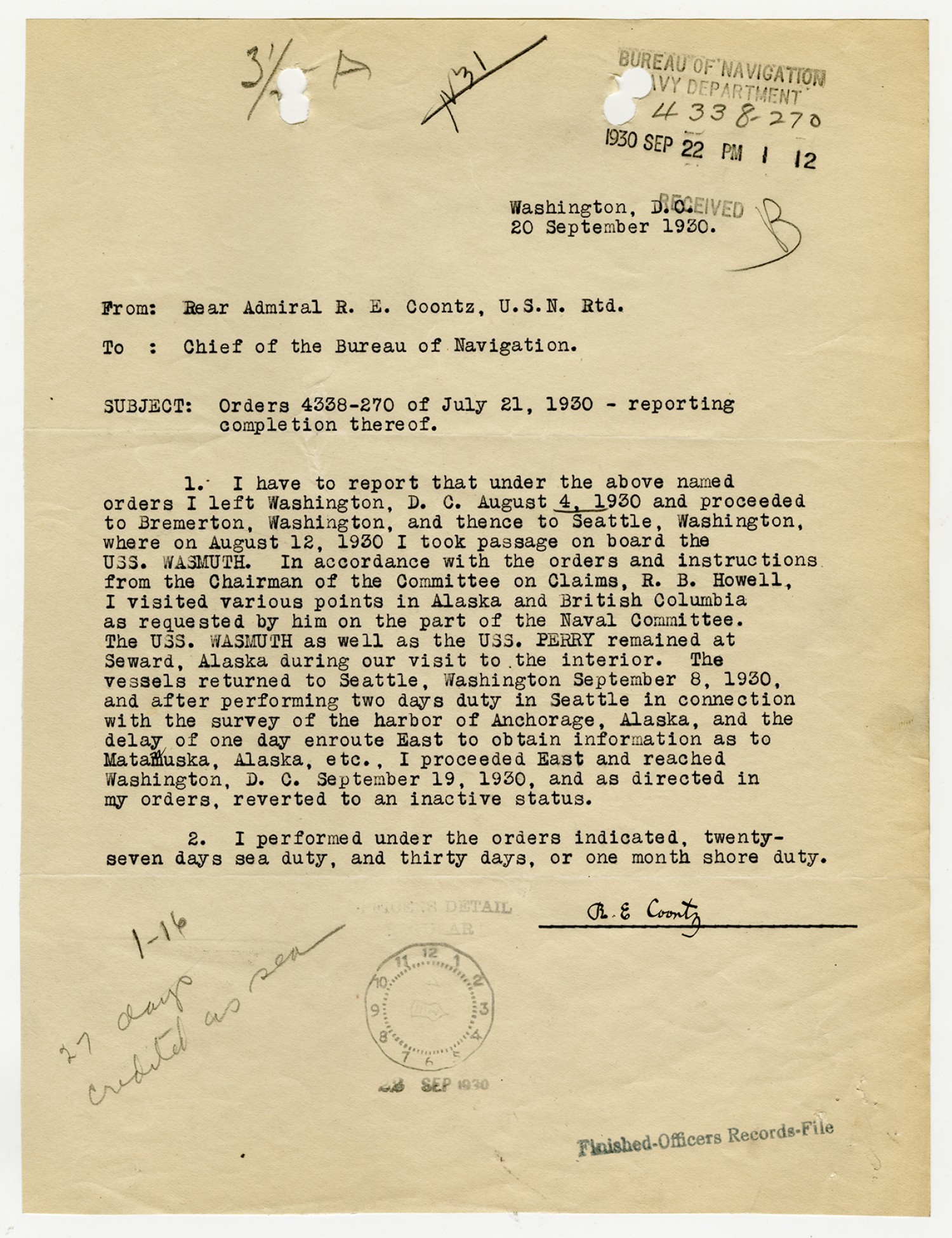 Robert Coontz letter to the Chief of the Bureau of Navigation - September 20, 1930
