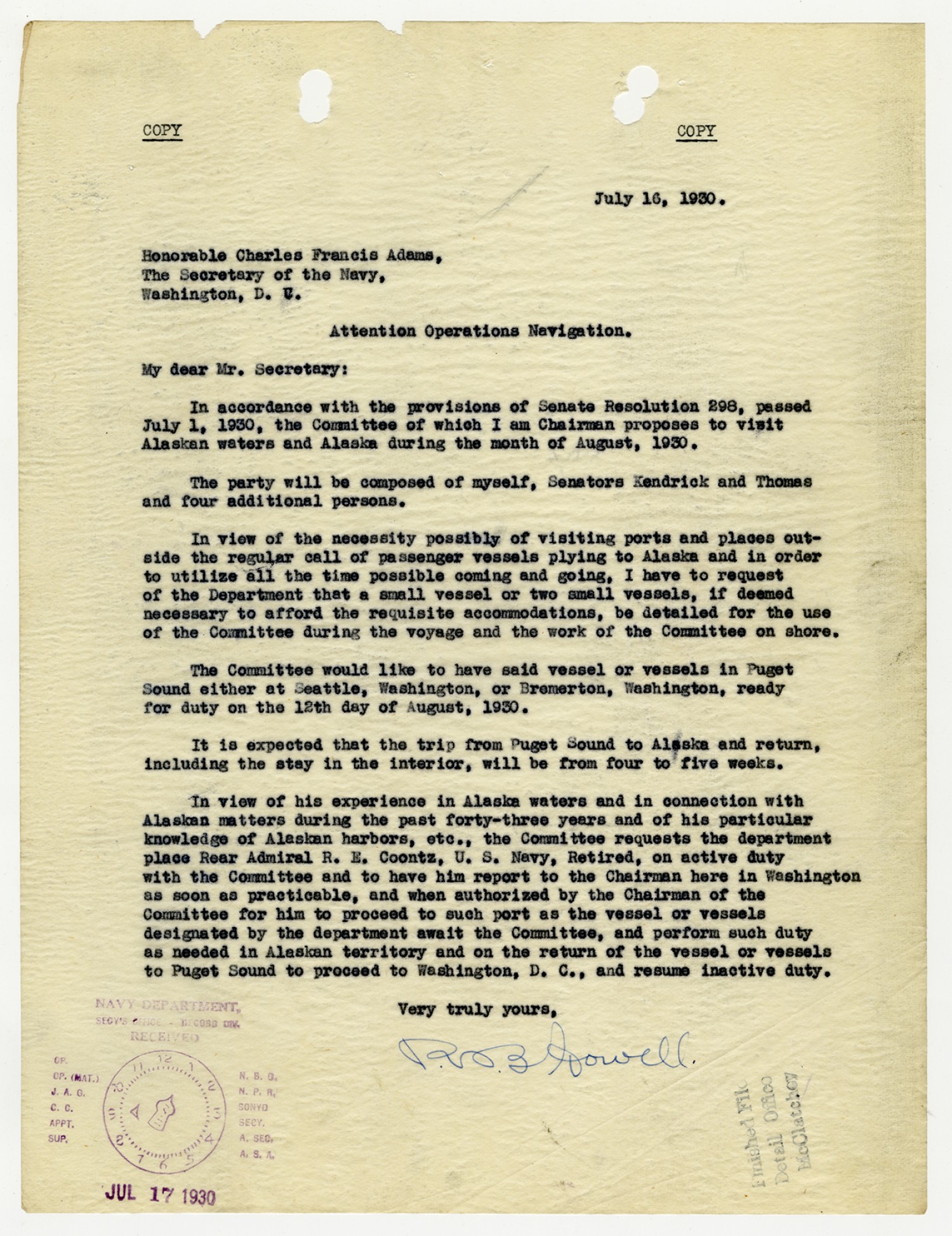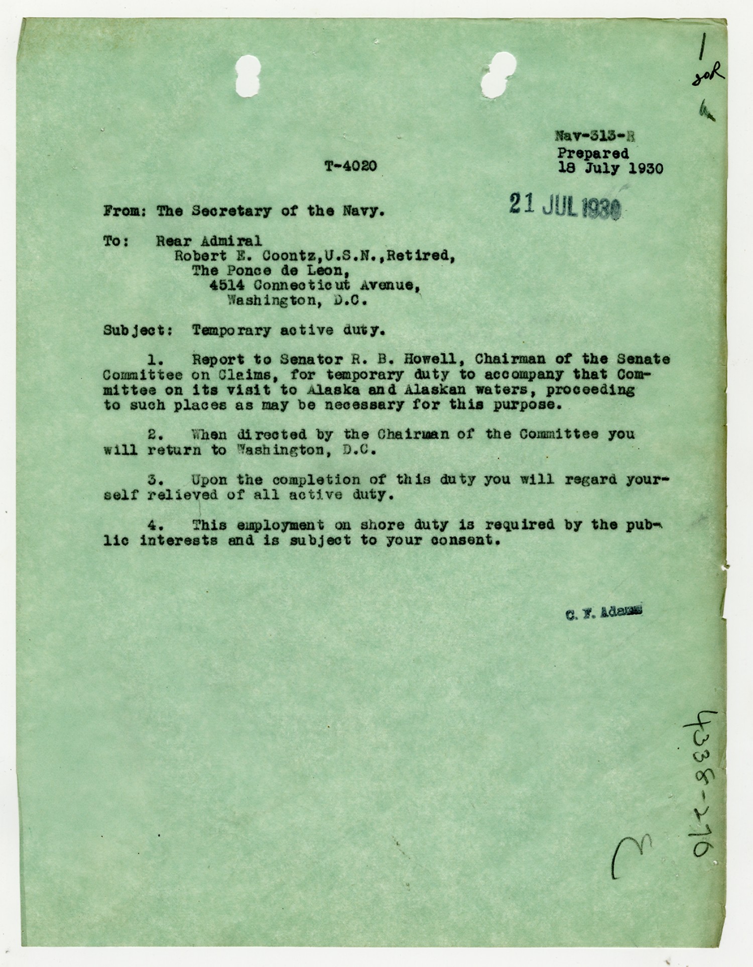 C.F. Adams letter to Robert E. Coontz - July 18, 1930